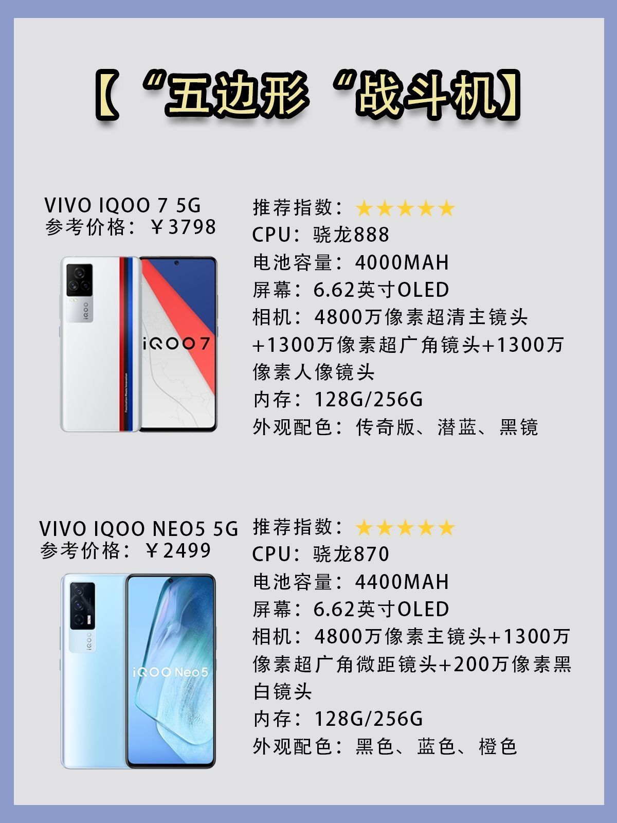 1⃣iQOO7 参考价格:¥3798 特点:年度旗舰,iQOO7必须拥有一席之地,且不说性能登峰造极的骁龙888,单单120W超级闪充,就足以证明iQOO7已经站在巅峰,300Hz触控采样率,屏下双压感。你要的它统统都能给你。 2⃣iQOO Neo5 5G 参考价格:¥2499 iQOO 作为vivo的子品牌,不仅有很高的性价比,而且方方面面都很能打。延续vivo系列手机优异的拍照,充电性能,i...