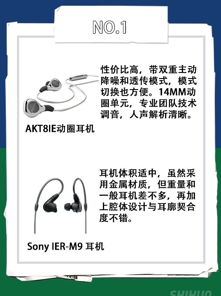 1⃣️AKT8iE动圈耳机 售价:8999 特点:性价比高,带双重主动降噪和透传模式,模式切换也方便。14mm动圈单元,专业团队技术调音,人声解析清晰。可用手机或平板USB-C口给耳机充电,适合追求高品质的人。 2⃣️Sony IER-M9 售价:5687 特点:耳机体积适中,虽然采用金属材质,但重量和一般耳机差不多,再加上腔体设计与耳廓契合度不错,佩戴时间久了也不会顶耳廓,佩戴稳定度和舒适度...