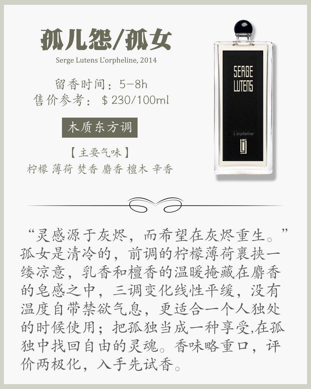 曾看过一句香评,“喜欢孤儿怨的女生不是性冷淡就是T”,也有人说过“Serge Lutens是沙龙香里的标准,就算找得到全世界只有一个作坊的小众香,但只要没闻过芦丹氏,都不敢炫耀自己懂。” 芦丹氏孤儿怨拥有一个孤冷诡怨的名字,还有句特别牛X的文案,把一整篇场景描述浓缩成一句话:“你绝非善类,我也不做好人”,勾勒出了一个孤儿怨清冷孤傲的气质。 孤儿怨(孤女) L'orpheline 香调:木质东方...