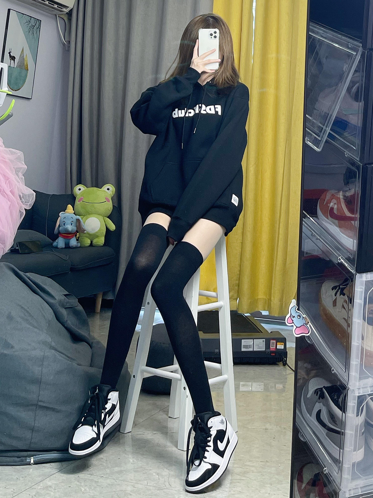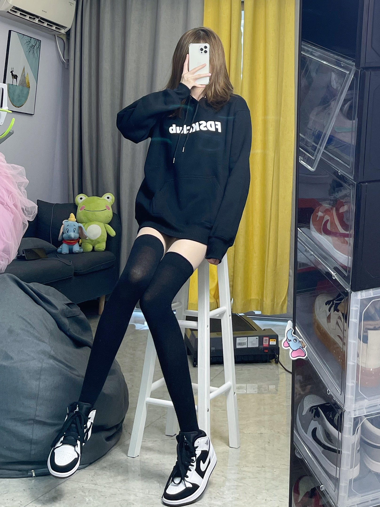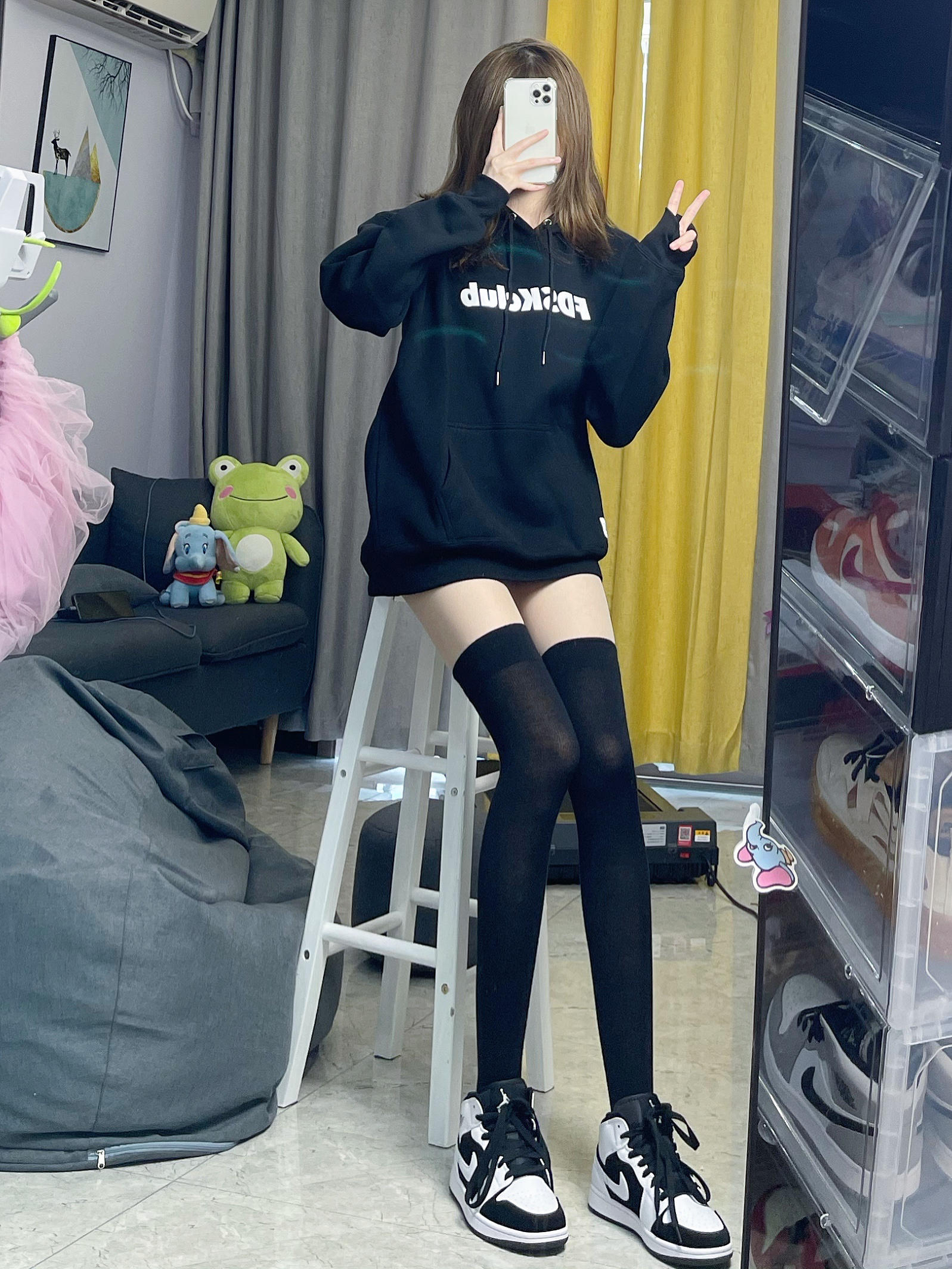 👔卫衣:FDSK 潮酷少女黑色卫衣,经典黑色连帽卫衣是秋冬超百搭的潮流单品~卫衣是比较宽松的版型,遮肉不挑人~年度显瘦色当属黑色 👟鞋子:AJ1熊猫 不用多说了 我的最爱