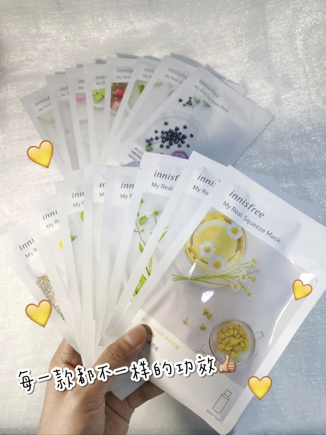 💖2 块钱一片的面膜它不香吗? innisfree悦享鲜萃面膜套装 过几天有99划算节 的活动,预算不高的小姐妹可以入手,这款面膜有活动的时候真的炒鸡便宜 学生党bi入面膜,炒鸡白菜大碗。一天一片都不心疼。我买的是一盒16片的套餐,每一张都有不同功效不同味道。满足了有选择困难的我,小孩子才做选择,我选择都要哈哈哈。 💖主要分三大质地: 清爽水漾:绿茶、黄瓜、竹子、柠檬、香框、荔枝、洋甘菊 水润精华...