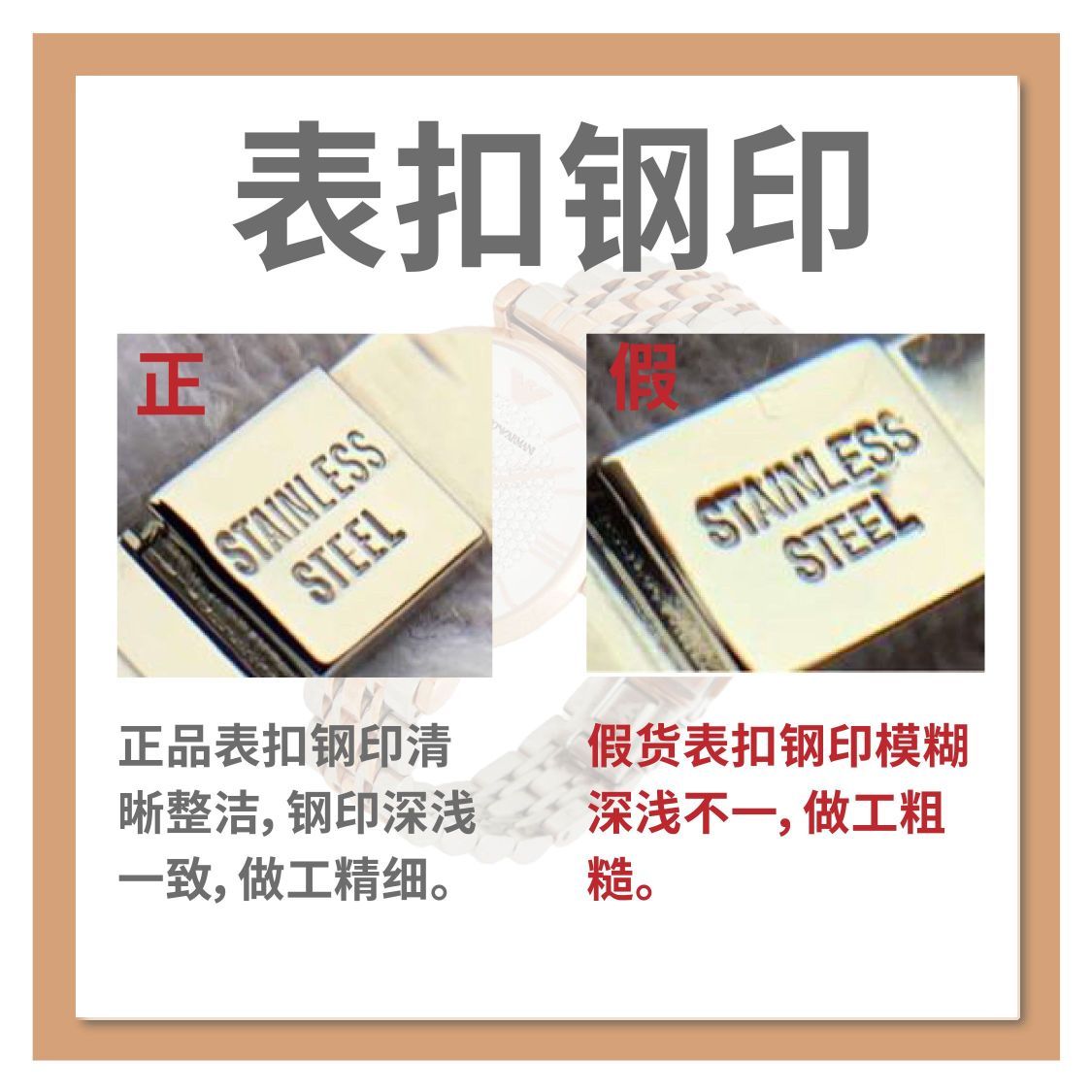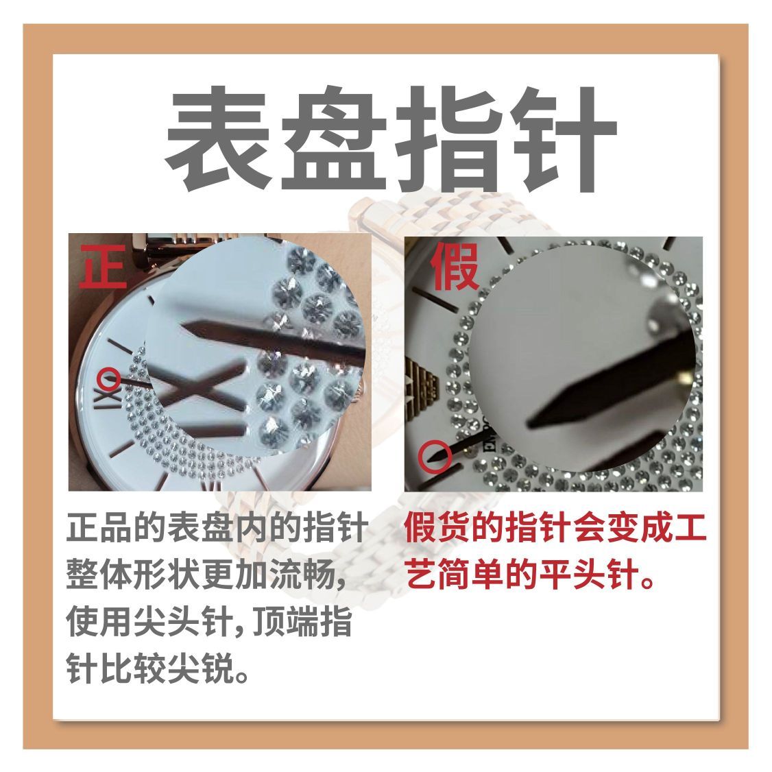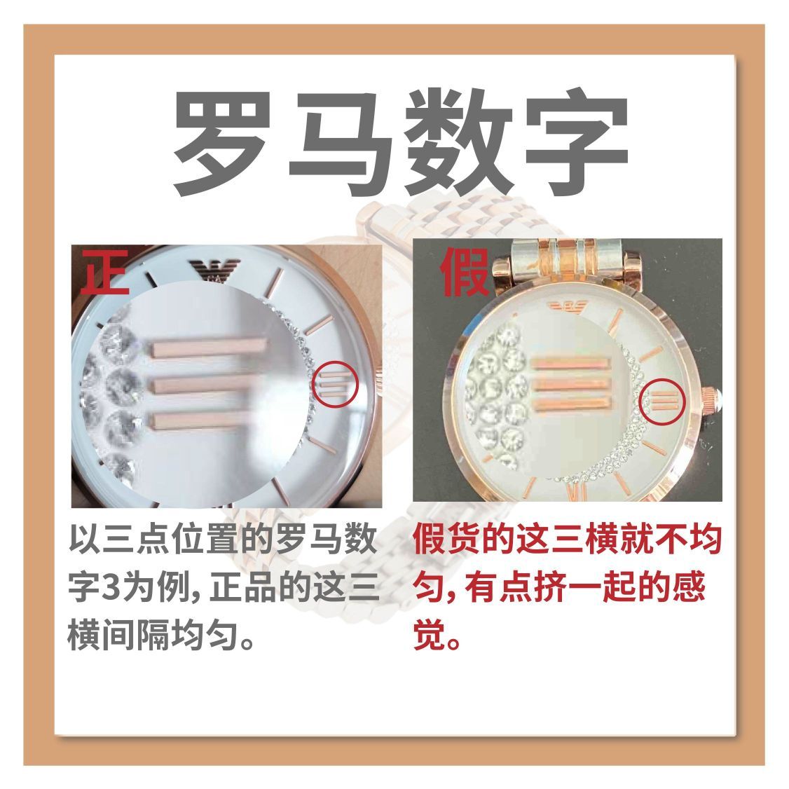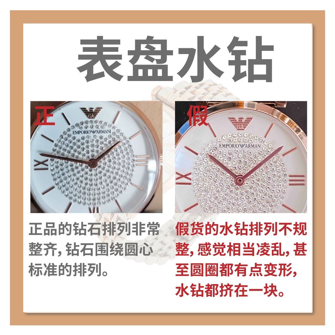 【Armani满天星】Armani的这款女士满天星石英表因其精致的满钻设计,奢华中透露着简约,深受着广大女性用户的喜欢,其火爆程度可想而知,因此涌现出了大量的假货!!为了不让广大女性用户受到欺骗,这期正品君就为你们带来辨别小技巧! ♥真假对比♠ ⑴表盘水钻 ✔正品:正品表面水钻排列整齐,钻石围绕圆心标准的排列。 ✘假货:假货的水钻可以明显地看出其排列不规整,并且非常的凌乱且拥挤,整体外形甚至有...