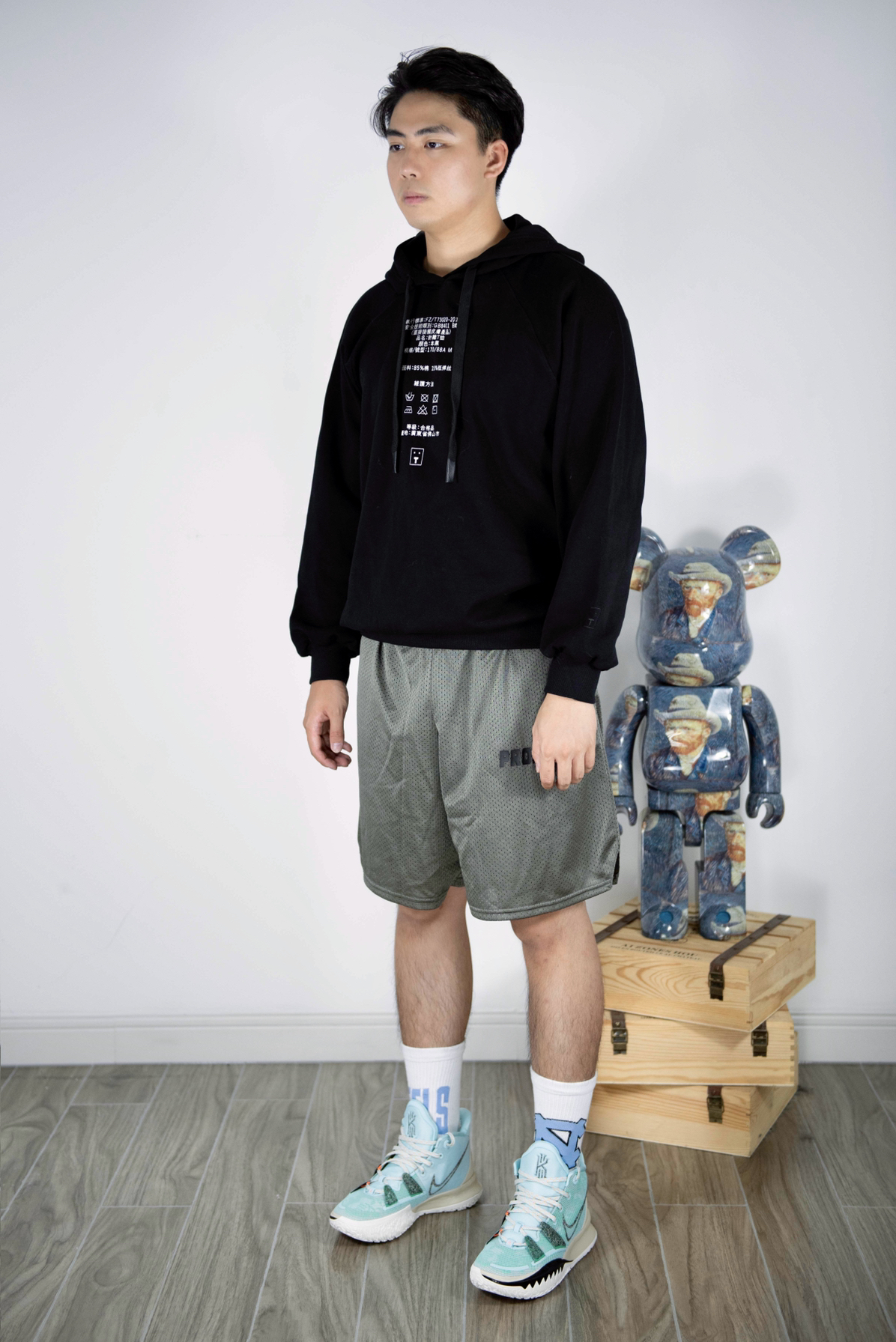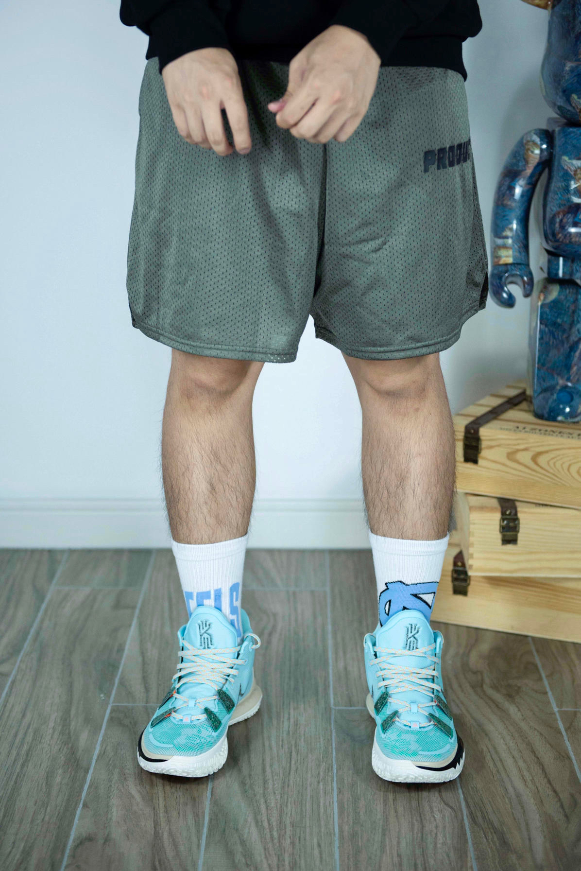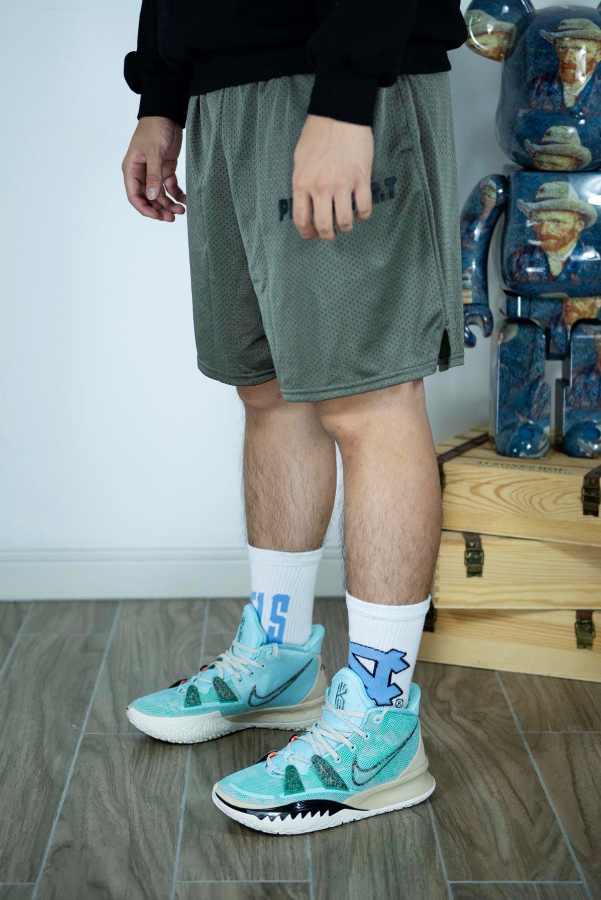 上装:Producer.T 卫衣 下装:PDCT 篮球训练裤 鞋子:Kyrie 7 这款Kyrie 7被称为“ Mint Green”,具有绿色,米白色和金色的配色。说实话日常搭配来说并不好搭配 但在球场上它绝对不输任何球鞋 无论在功能还是外形色彩上。