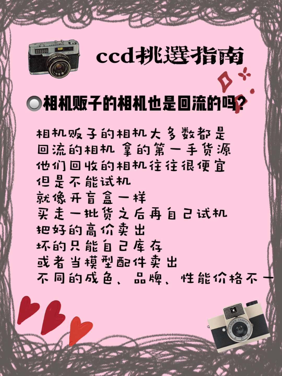 相机贩子的相机大多数都是回流的相机 拿的第一手货源 他们回收的相机往往很便宜但是不能试机 就像开盲盒一样 买走一批货之后再自己试机 把好的高价卖出 坏的只能自己库存 或者当模型配件卖出 不同的成色、品牌、性能价格不一