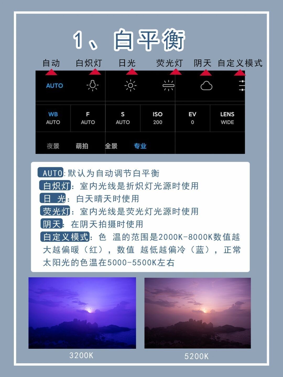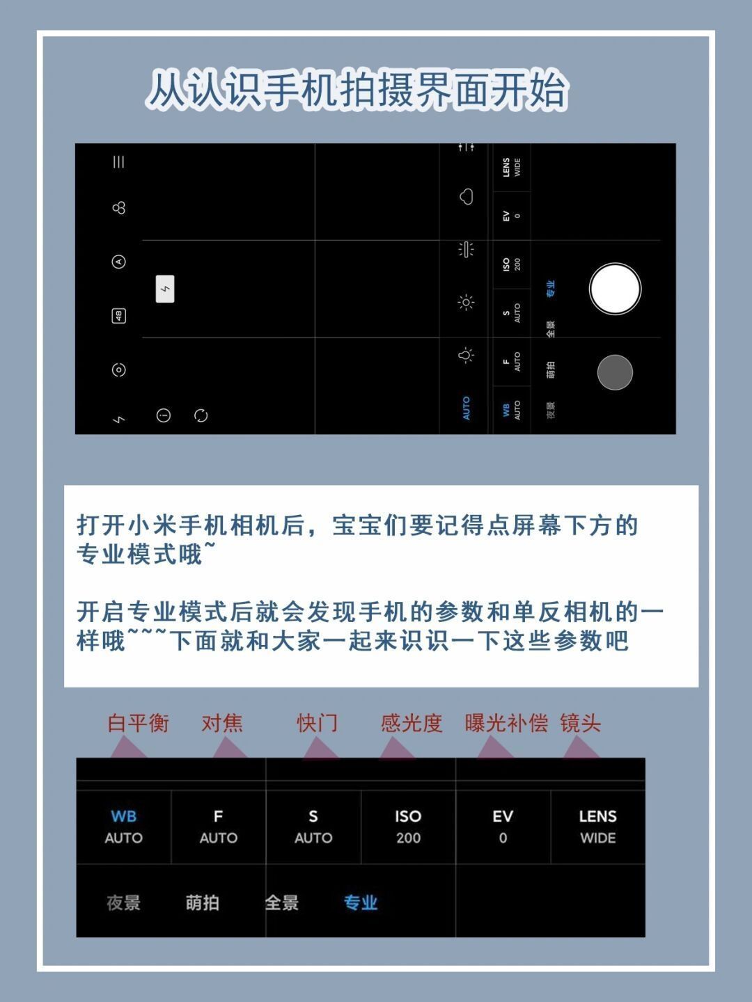 哈喽~ 欢迎来到手机摄影小课堂 🌸之前写过华为手机单反模式,很受小伙伴们的欢迎。这一次给小伙伴们来说说小米手机的单反模式 🍀好像有很多小伙伴都不知道小米手机也有【专业模式】,也对些这个功能不太了解,今天就带大家一起来深入了解一下吧~ ⭐️小米手机的单反模式 ✅1、白平衡 ✅白平衡就是用来调节色温的,白平衡数值越大越偏蓝色,数值越小越偏红色,可以用于一些特殊场景的风景照片中,比如拍日出日落时可以加冷...