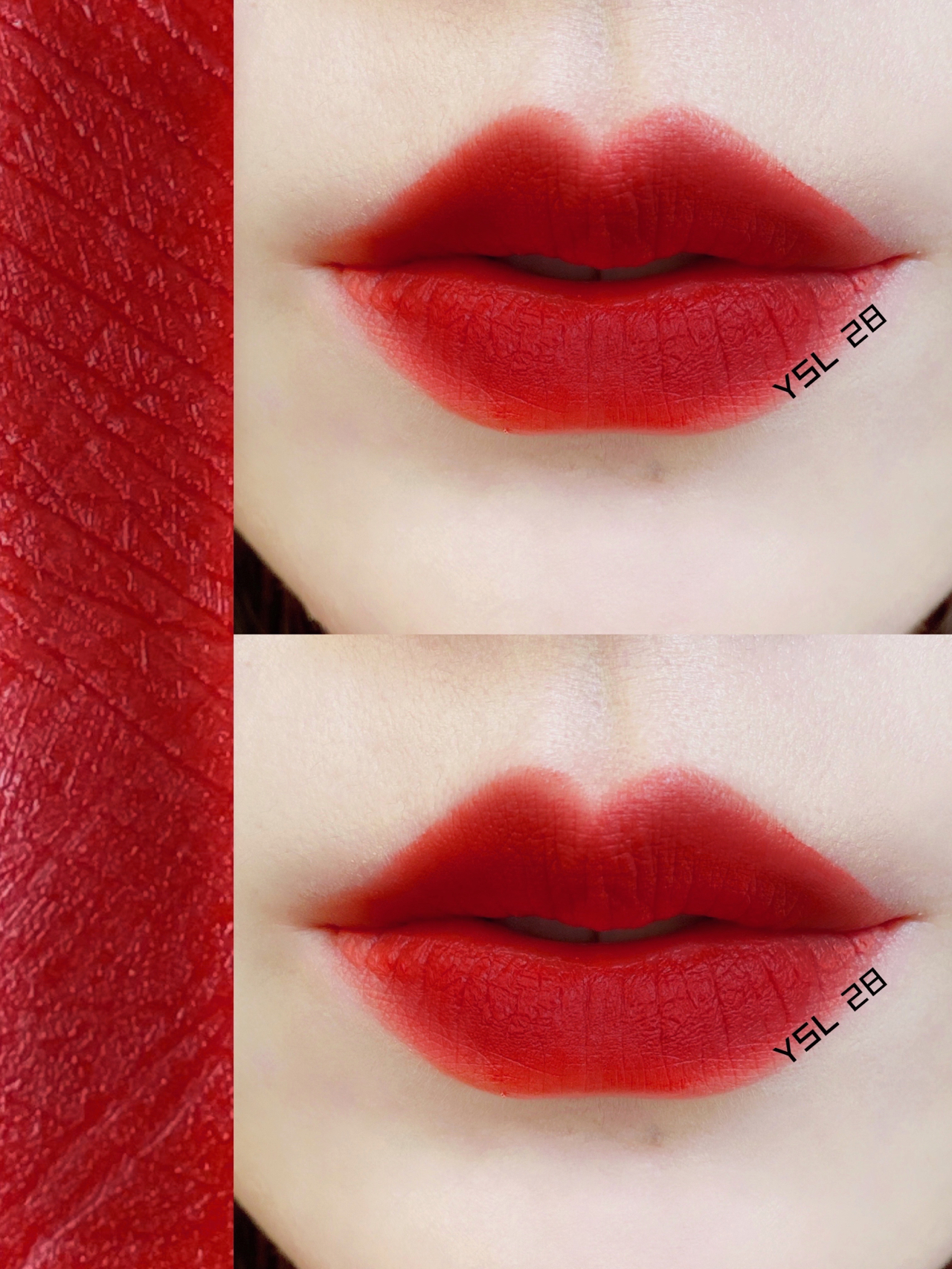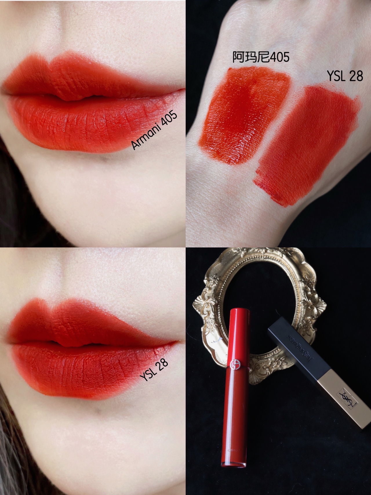 其实ta俩的颜色还是稍微有点区别的 直白点来说阿玛尼405是小番茄,ysl28是胡萝卜 两个都很显白啦~ 💄阿玛尼405是偏橘调的红色,润润的 番茄鼻祖,适合唇部容易干的小姐妹! 持久度一般,比较容易沾杯 💄 ysl28薄涂有点日系小软妹,减龄元气! 厚涂敲洋气!高级啊!ju显白!红调会大于橘调 雾面哑光质地,气质全开~一点都不挑皮, 适合这个冬天各种妆容! 日常上班约会见亲戚 都阔以轻松驾驭 ...