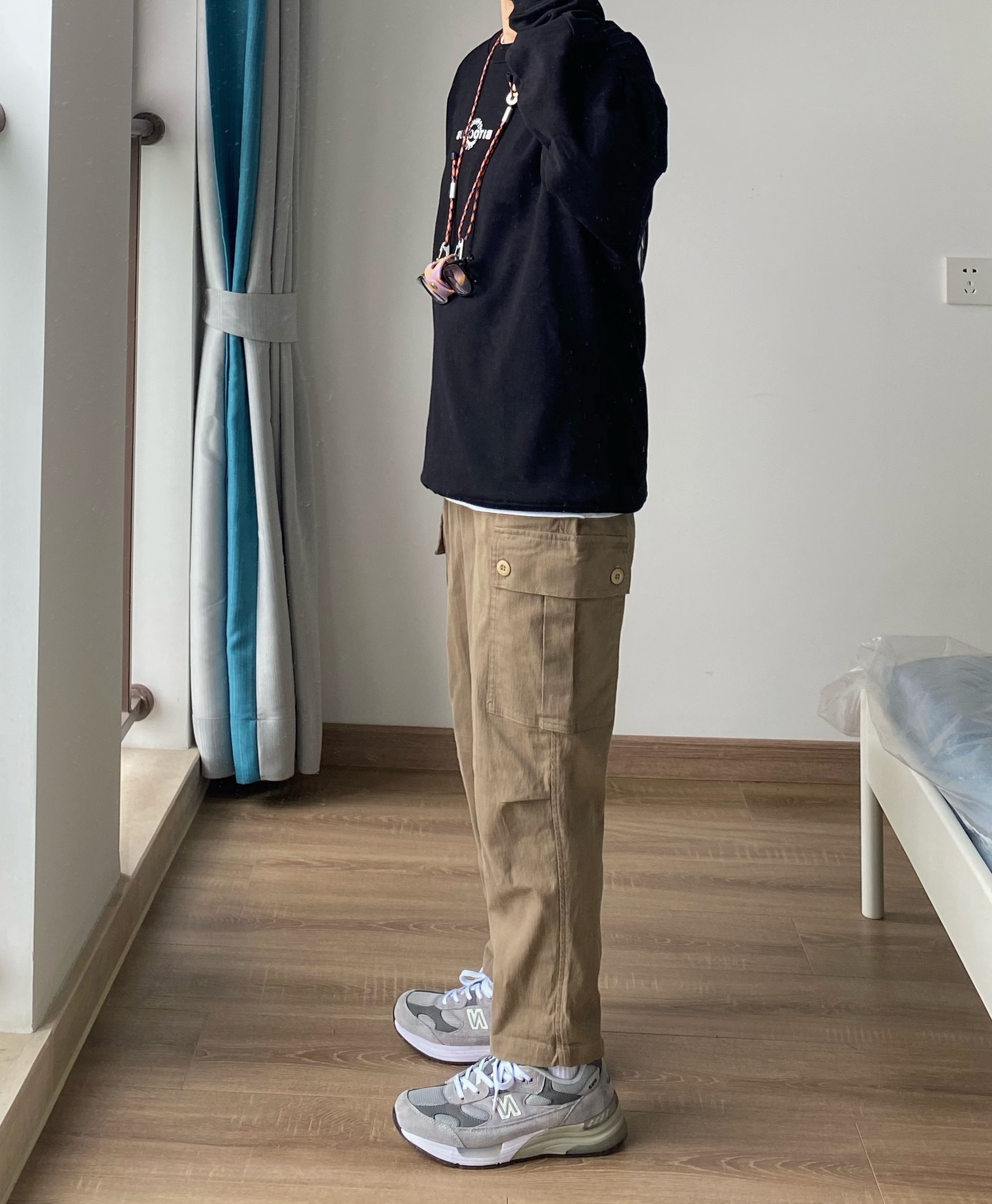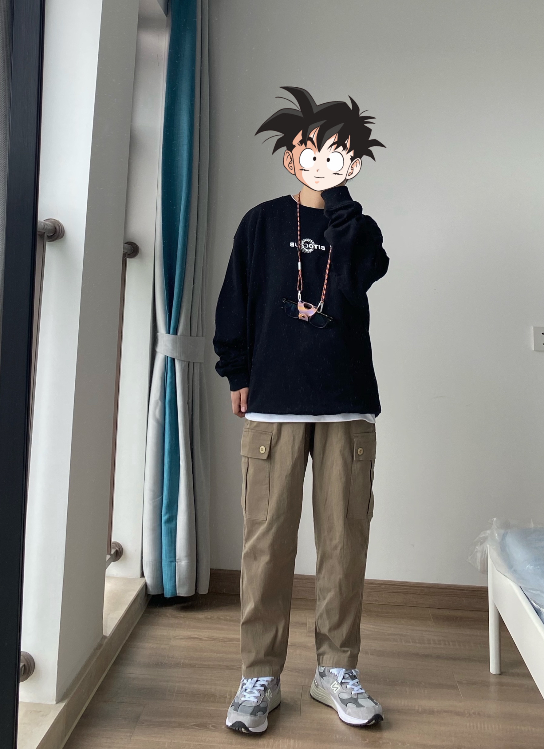 👔是BITO的黑色圆领卫衣 背后渐变图案超级帅 👖是白告studio色卡其色工装裤 我160 可以不挽裤脚穿 也可以挽起来穿出另一种感觉 👟是新百伦992元祖灰