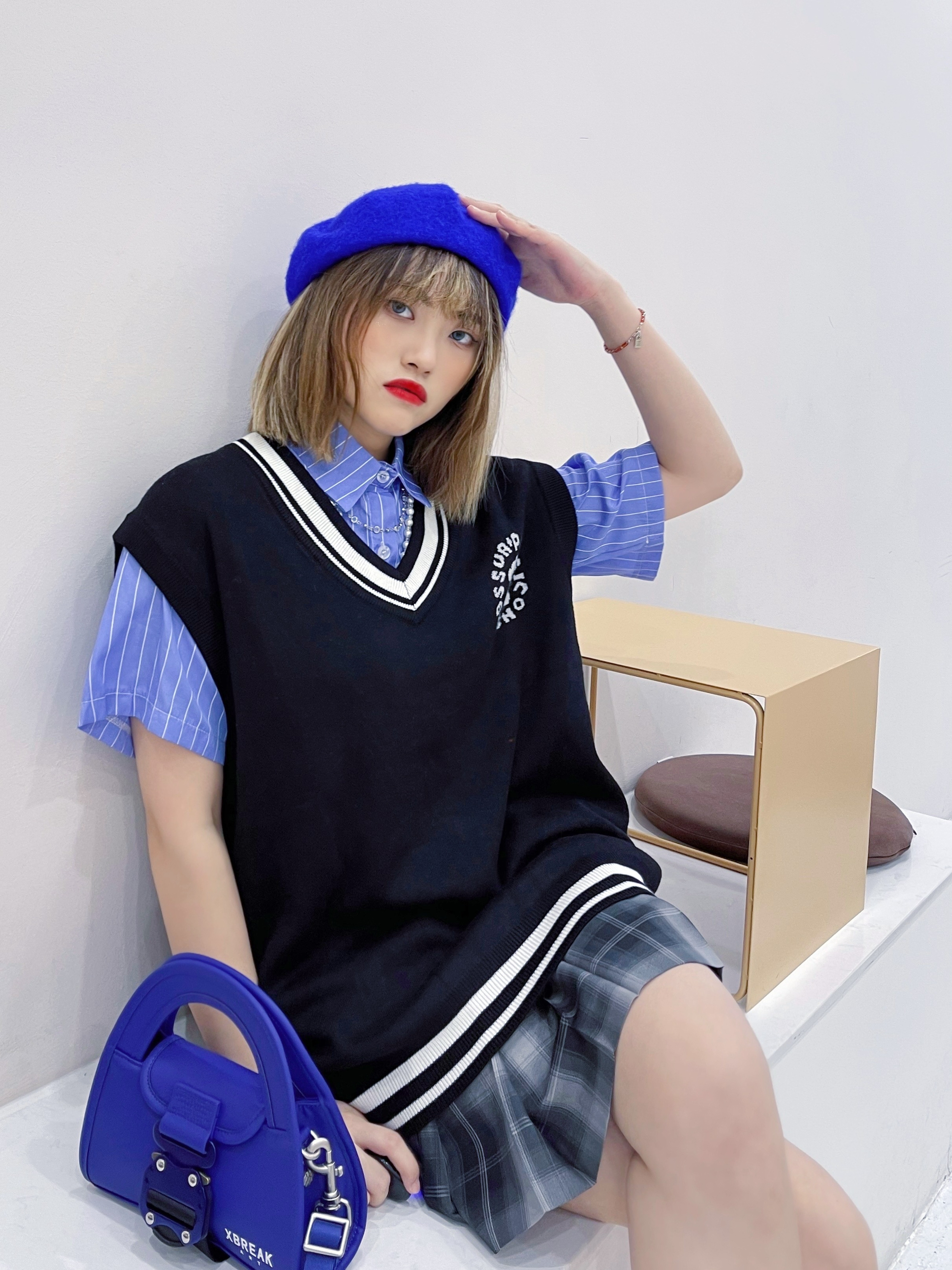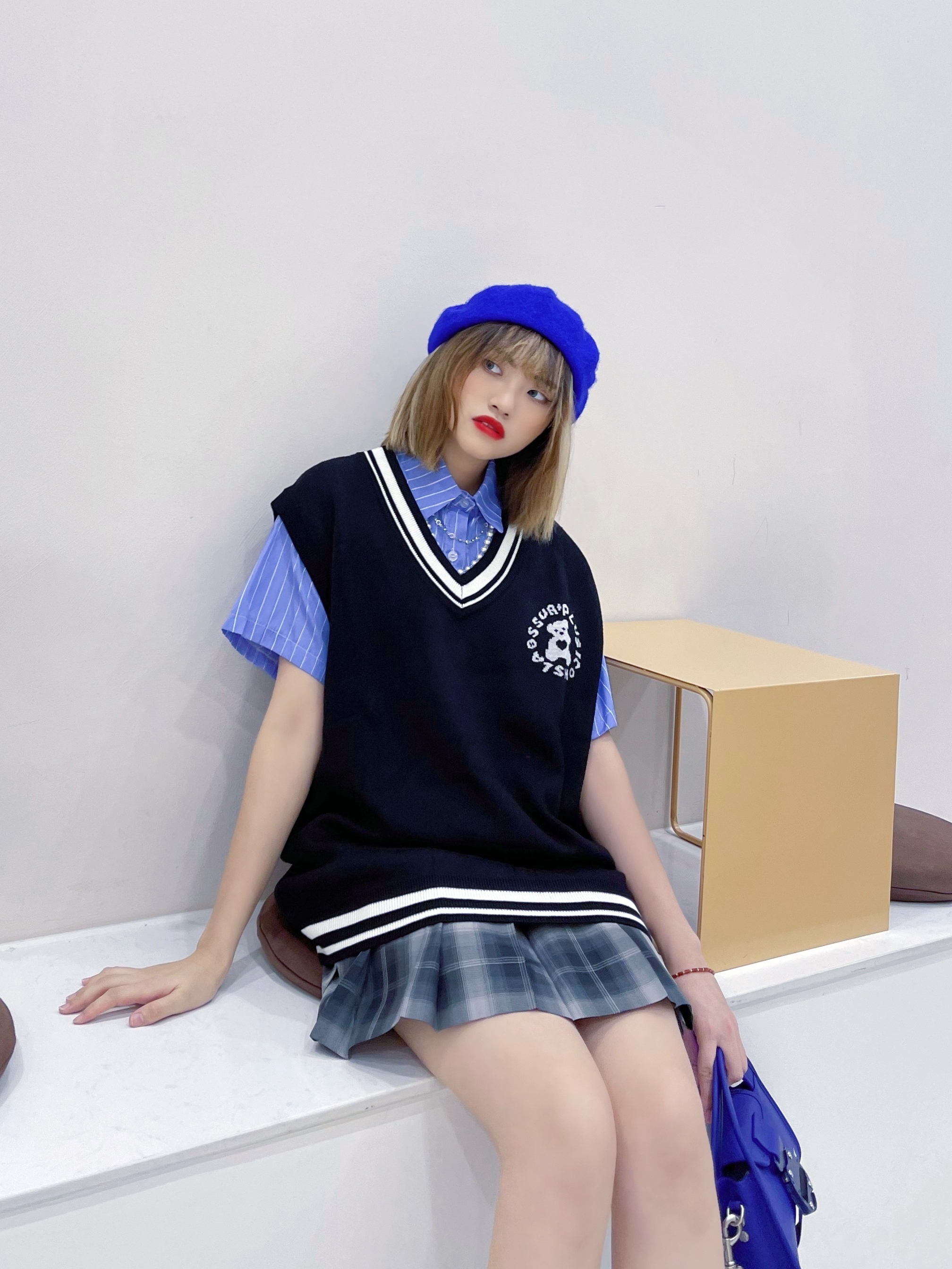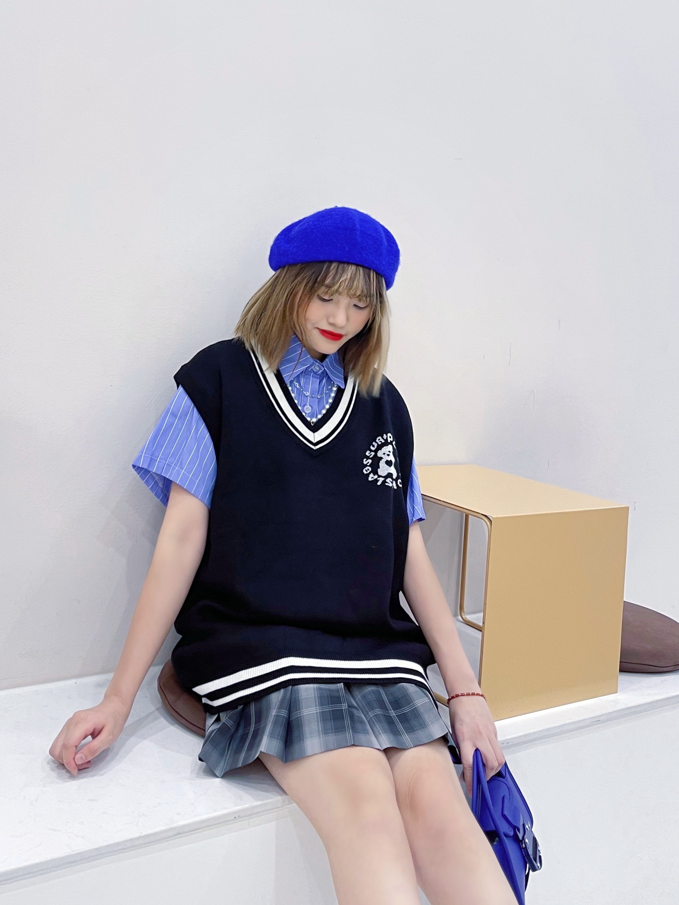 蓝色是博大的色彩,天空和大海这辽阔的景色都呈蔚蓝色。蓝色是永恒的象征,它是最冷的色彩。纯净的蓝色表现出一种美丽、文静、 理智、安祥与洁净 看我用这件爱心小熊针织背心马甲 搭配灰色格子短裙有没有感觉到蓝色的另一种俏皮