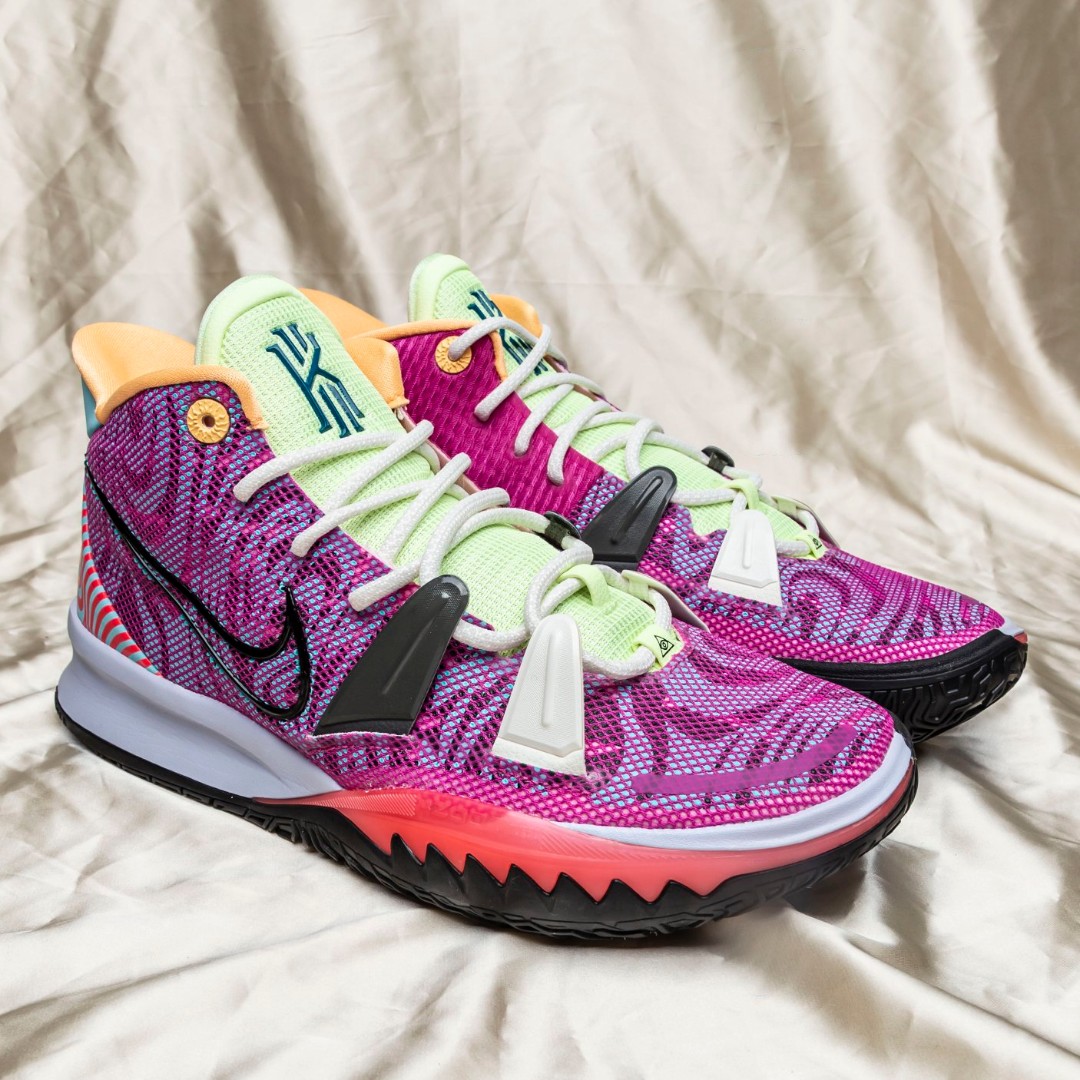颜值绝对爱了! Nike Kyrie 7 Hendrix 这款Nike Kyrie 7的鞋面饰有迷幻图案,并带有紫色阴影,而鲜艳的色彩则落在舌头,顶眼,衬里和鞋跟顶部。接下来,我们用黑色勾勒出Swoosh徽标,同时在高跟鞋上看到音乐和街头艺术,搭配白色反光鞋带,夜晚视觉更加,完成外观。 #sneaker monster