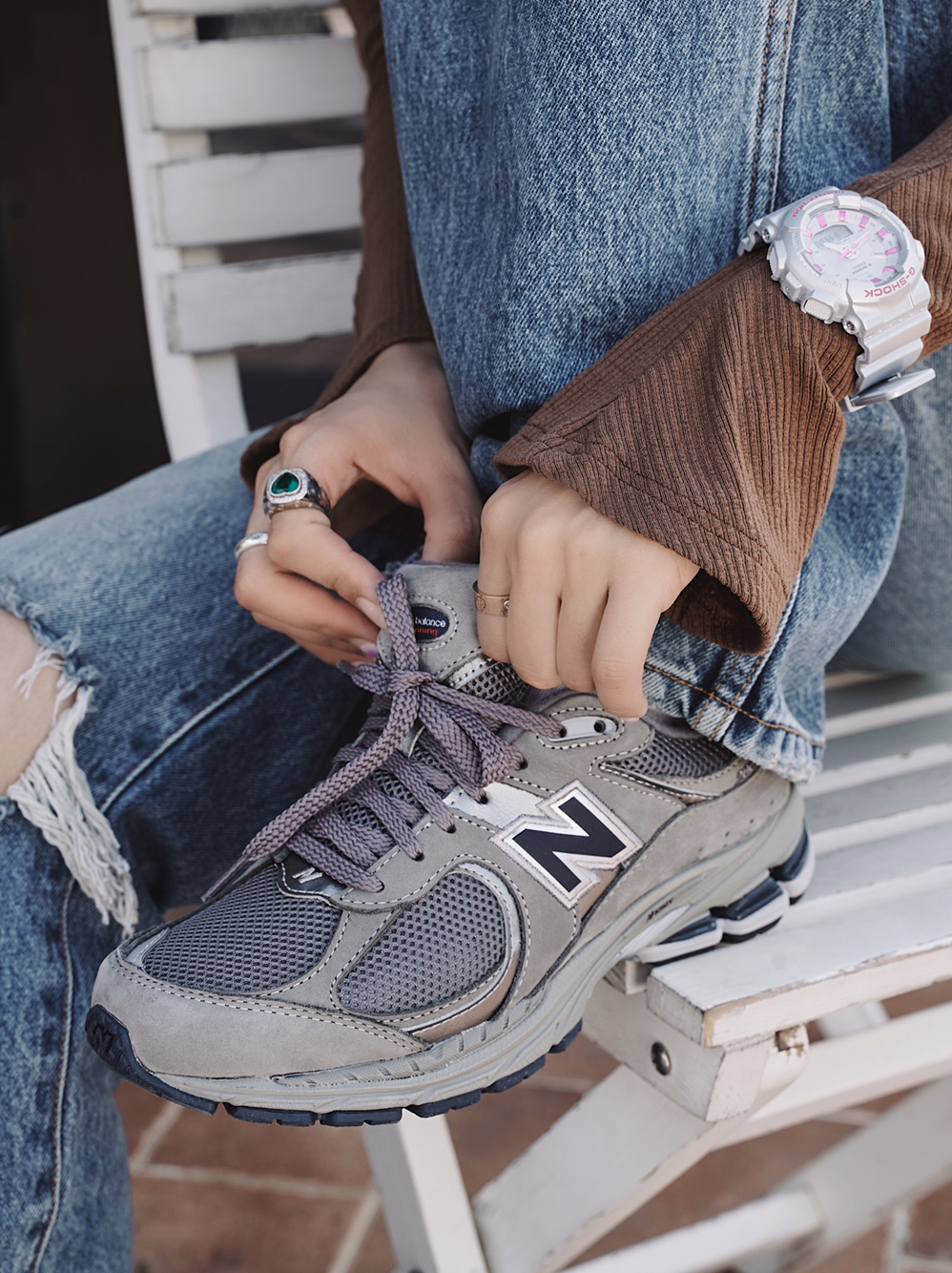 七日穿搭 打卡第一天 对于2002r的复古和质感,大家已经不陌生了吧! 而2002r的元祖灰是最心水的一双! 依旧是反绒面和网面的完美结合🫂 拥有跑鞋出色的脚感🏃♀️ 显脚小对我这个大脚星人来说很重要!😄✌️ 🤠颜值可酷可甜 超级百搭哦! 不止日系工装、韩式街头也是辣妹穿搭的搭配神器 选择了这件新宠牛仔裤来搭这双鞋 更显鞋的颜值 ✌️有没有!