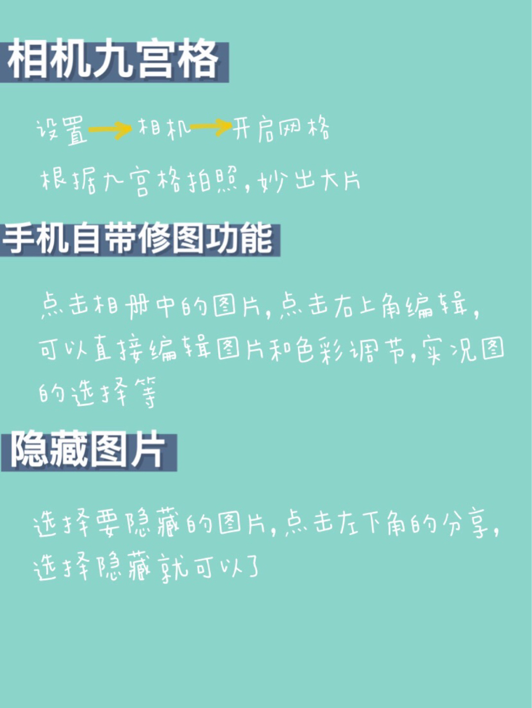 最新iPhone使用技巧更新,我不允许你还不知道❗️那些让你相见恨晚的隐藏技巧 字数太多,大家图文结合👇👇 🐟 相机九宫格:点击设置-相机-开启网格,根据九宫格拍照,照片不在倾斜 - 🐟 手机自带修图功能:选择相册中的图片,点击右上角编辑,可以直接编辑图片和色彩调节,实况图的选择等 - 🐟 隐藏图片:选择要隐藏的图片,点击左下角的分享选择隐藏就可以了 - 🐟 快速调出付款码:一直按着微信或支付宝a...