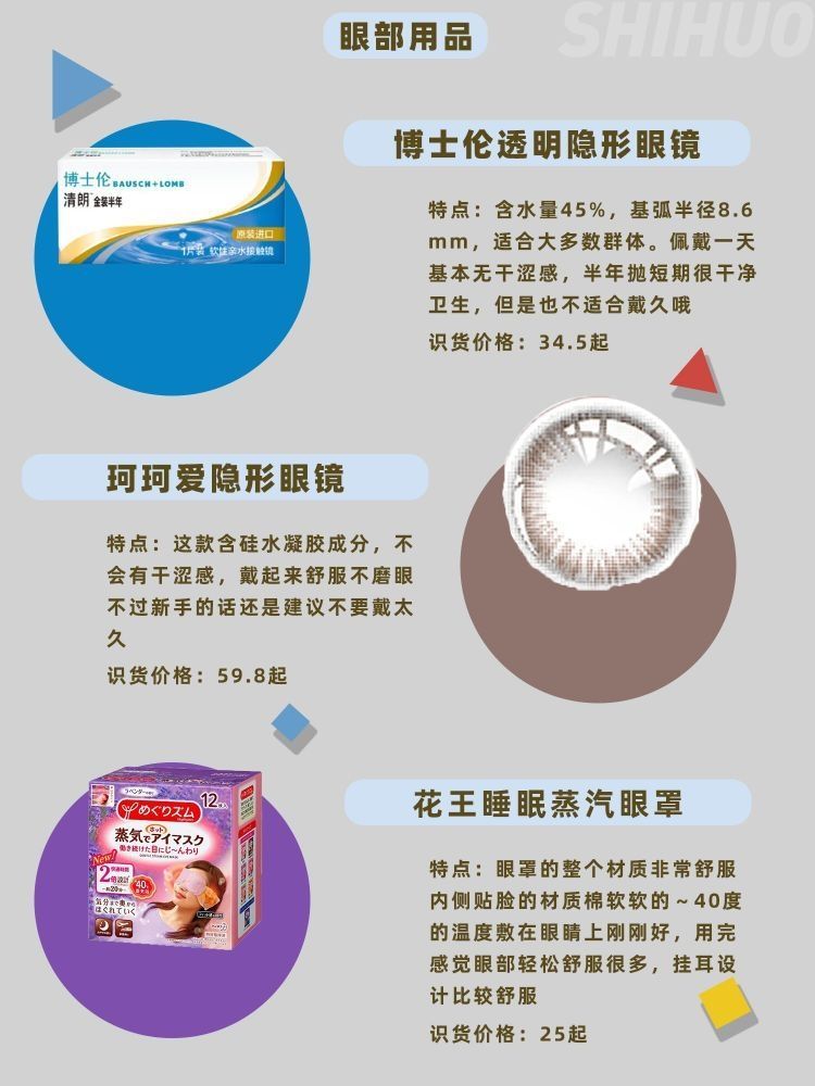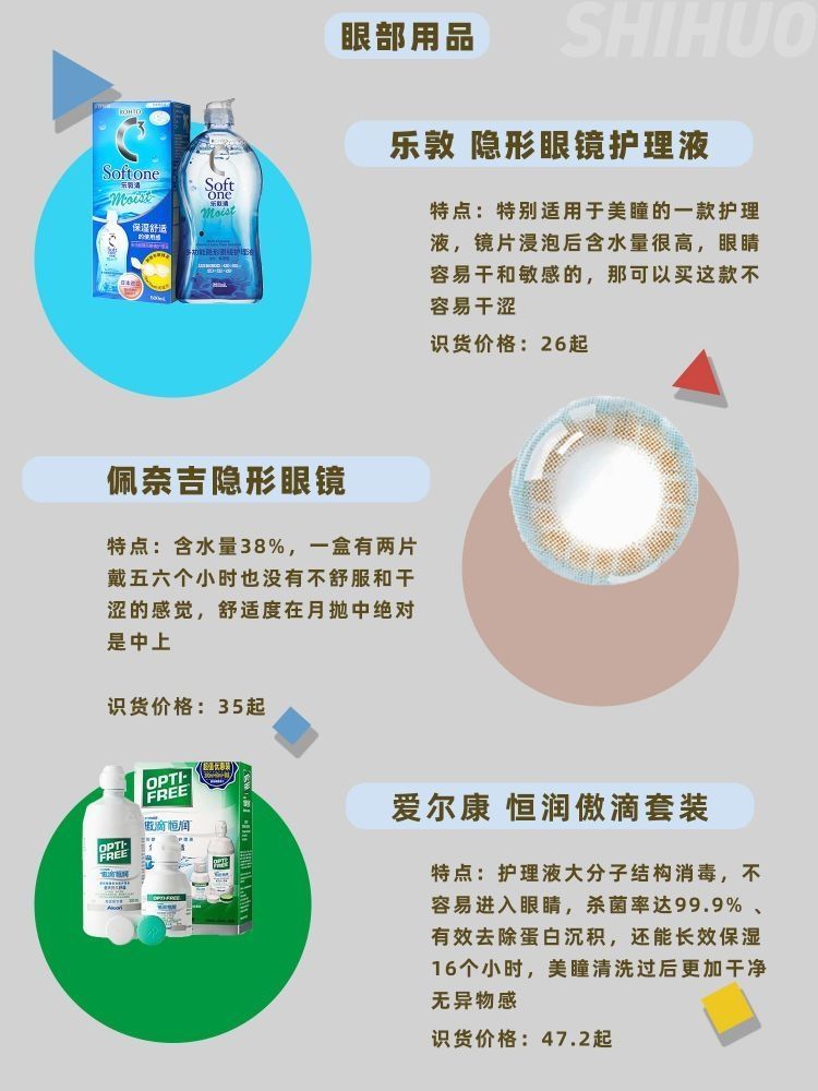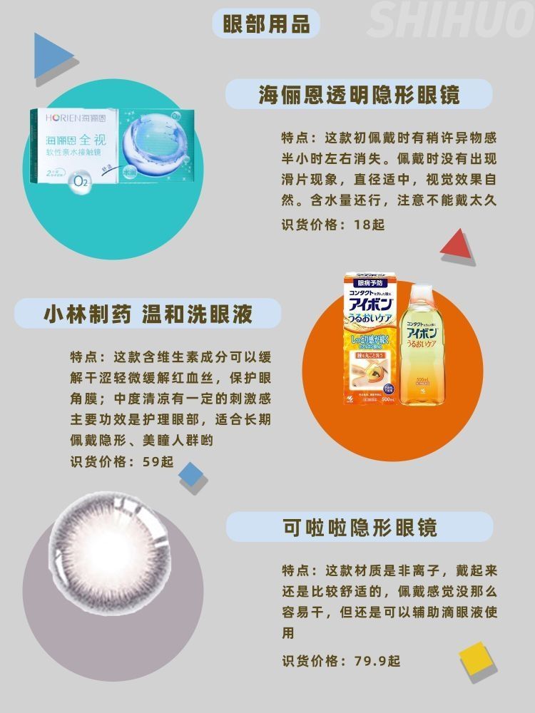 眼睛是心灵的窗户,要时常爱护它,所以我们日常生活中买眼部产品一定要慎重选择,同时注意护理哦 1⃣海俪恩 季抛全视系列小直径14.0mm透明隐形眼镜 2片/盒 识货价格:18起 这款初佩戴时有稍许异物感,半小时左右消失。佩戴时没有出现滑片现象,直径适中,视觉效果自然。含水量还行,还是注意不能戴太久 2⃣小林制药 温和洗眼液 识货价格:59起 长期化妆的集美,卸完妆记得洗眼睛哟~尤其是爱化眼部妆容...
