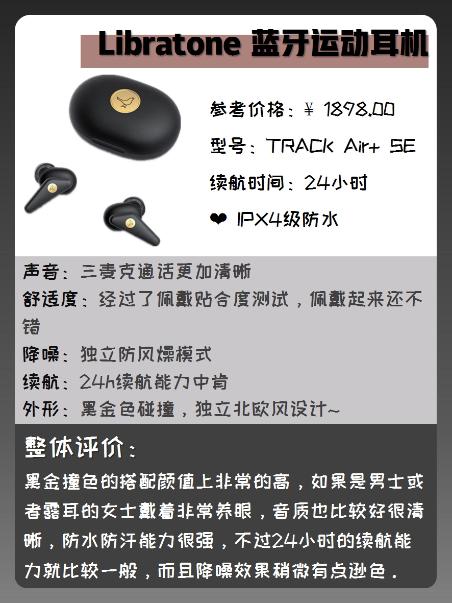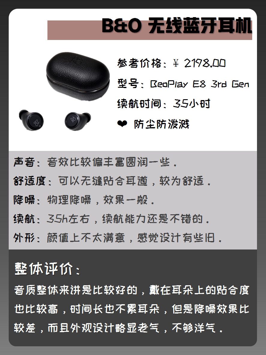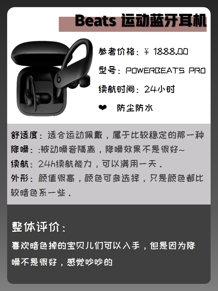 本篇笔记关联了Beats Powerbeats Pro 挂耳式 蓝牙 耳机 真无线 被动降噪 高性能 跑步 运动 完全无线 黑色、B&O Beoplay E8 2.0 入耳式 无线蓝牙耳机 被动降噪 运动 黑色、Libratone/小鸟音响 TRACK Air+ SE入耳式无线蓝牙耳机 黑金等商品,为用户提供真实的使用体验和购买参考。