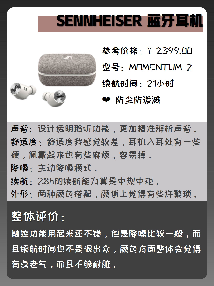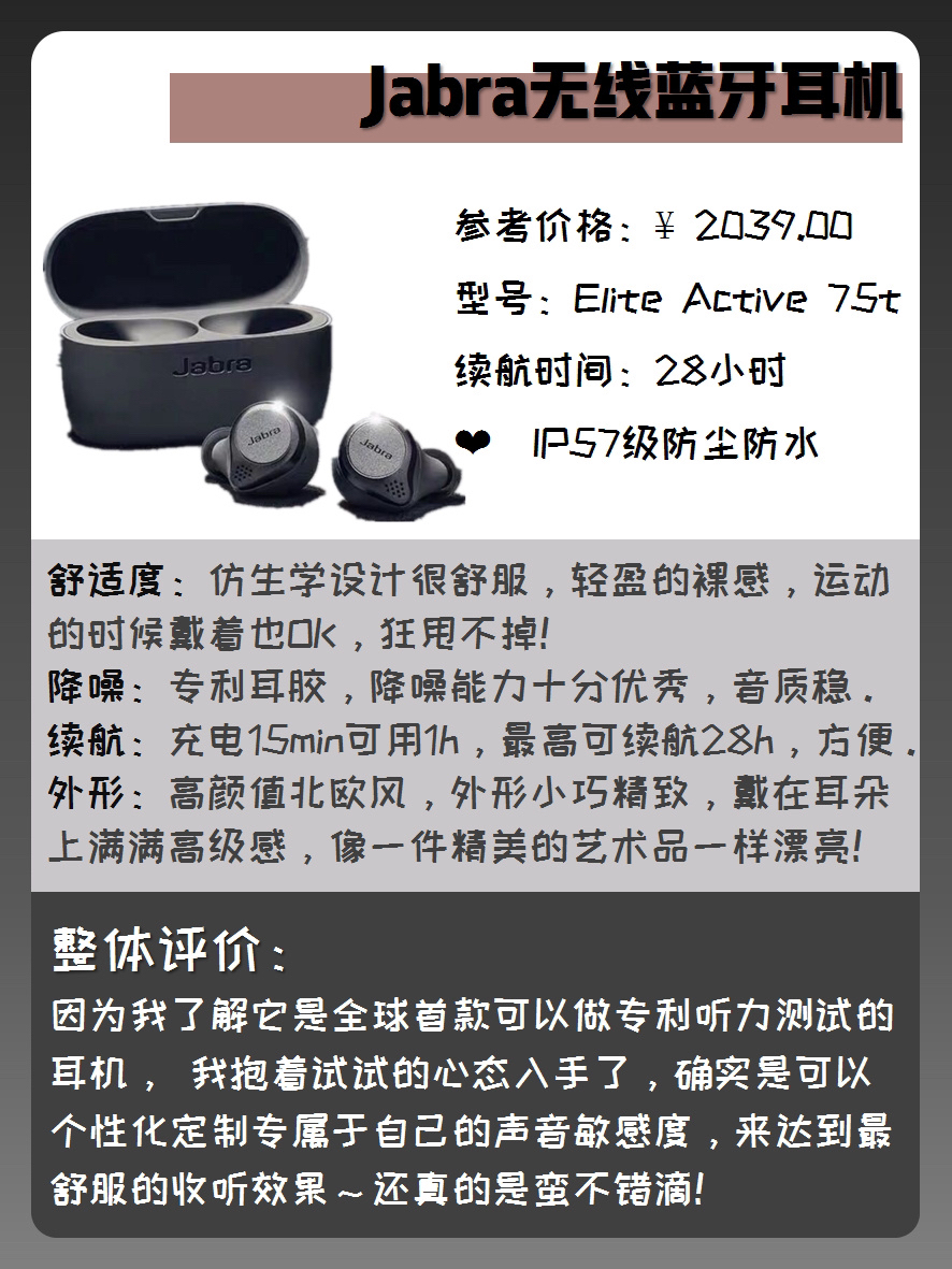 |一款好耳机对音质和我们的听力都是很重要的,我个人比较喜欢入耳式的耳机,入手过蛮多款式的,踩过不少雷,今天和你们来分享一下我用过的那些入耳式耳机吧 - 🎧Jabra 75T无线蓝牙耳机 💓舒适度:仿生学设计很舒服,轻盈的裸感,运动的时候戴着也OK,狂甩都不会掉下来哦 🍀降噪:专利耳胶,降噪能力十分优秀,音质稳稳的 🍬续航:最高可以续航28h左右,充电15min就可以使用1h啦,还是很方便哦 🍥外形...