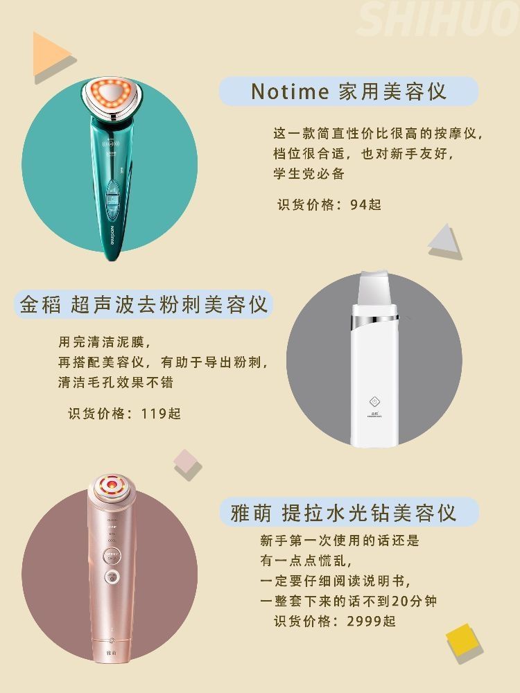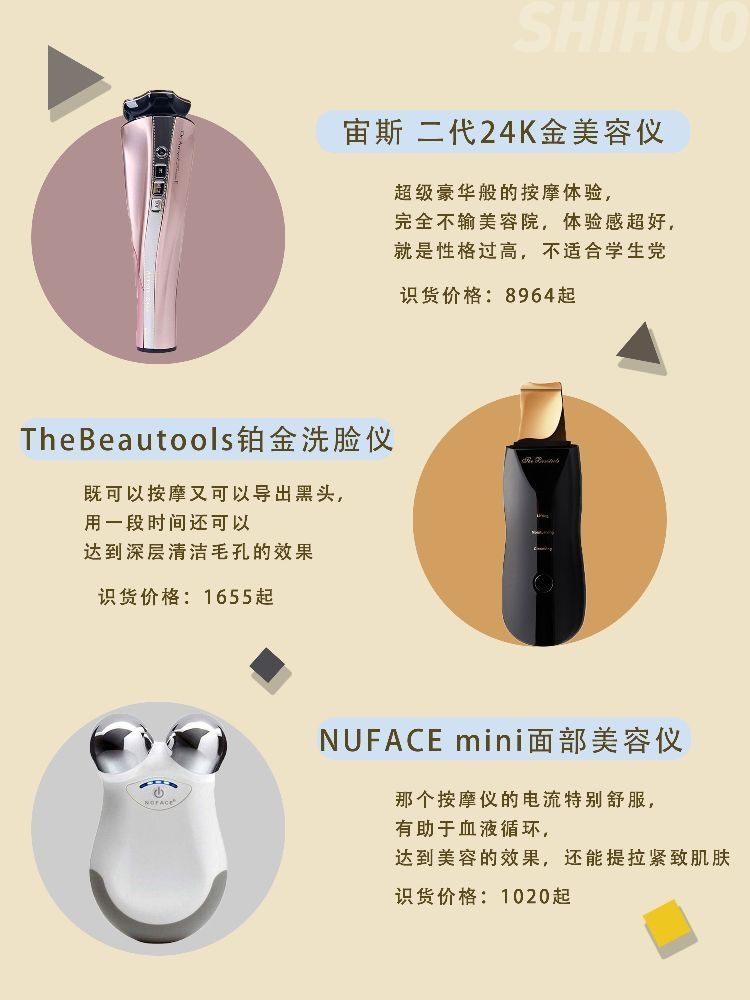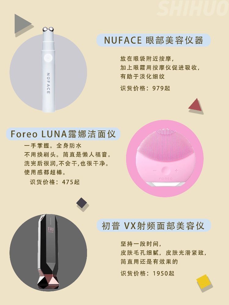 "这几款美容仪简直是我的压箱底,我的闺蜜朋友都说好,快来试一试吧 NUFACE 眼部美容仪器FIX大眼笔美眼仪 识货价格:979起 使用体验:放在眼袋附近按摩,加上眼霜用按摩仪促进吸收,有助于淡化细纹 Foreo LUNA mini2露娜洁面仪毛孔清洁黑头神器 识货价格:475起 使用感受:一手掌握。全身防水。不用换刷头。简直是懒人福音。洗完后很润,不会干,也很干净。 使用感都超棒。 ...