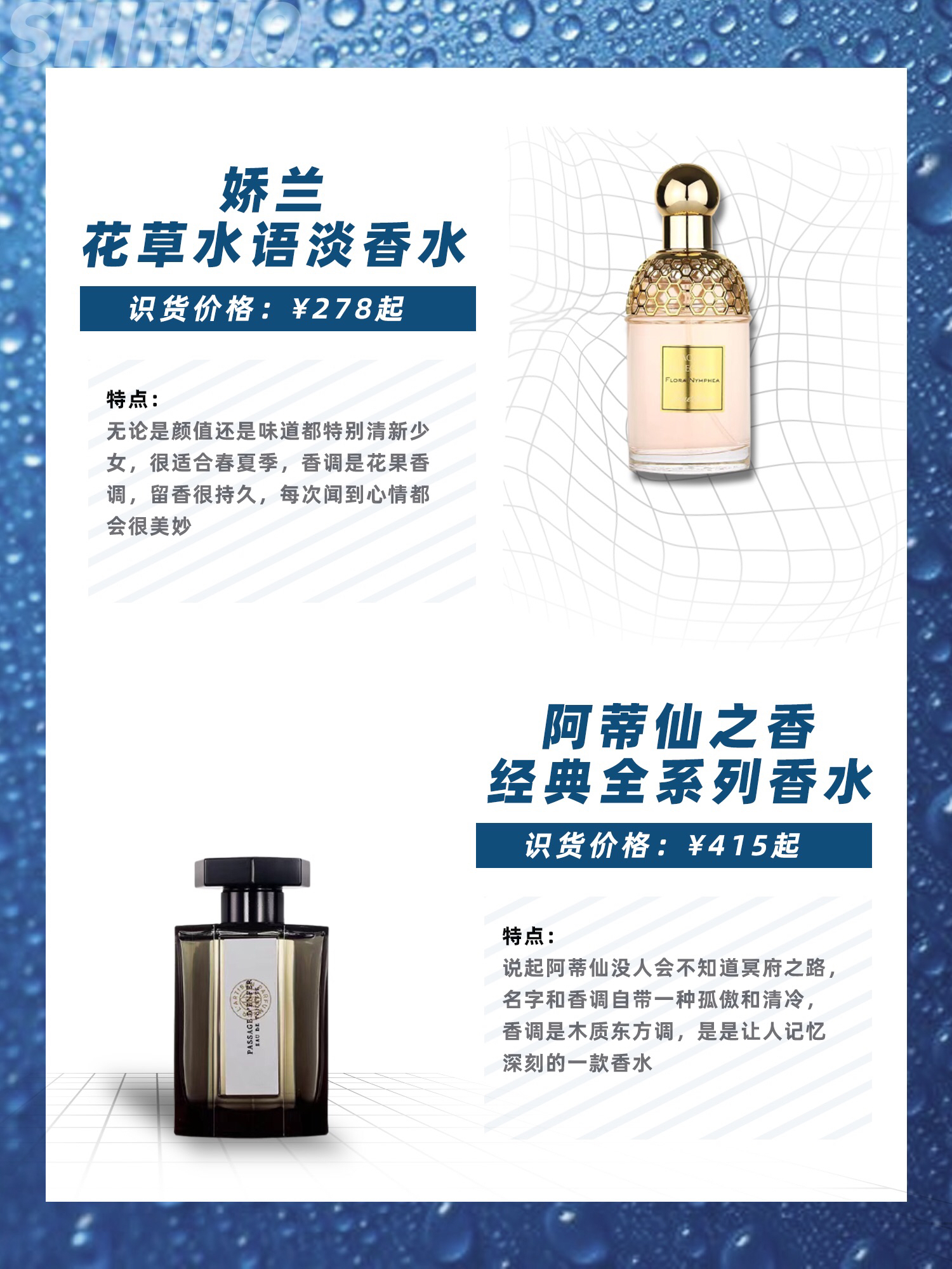 "女生的梳妆台上怎么可以缺少一瓶香水呢,一款适合的香水不仅能让自己心情愉悦一整天,还能把自身的气质提升不止一个档次呢,这些小众香水了解后说不定会爱上 娇兰 花草水语系列淡香水EDT 识货价格:¥278起 无论是颜值还是味道都特别清新少女,很适合春夏季,香调是花果香调,留香很持久,每次闻到心情都会很美妙 阿蒂仙之香 经典全系列香水冥府之路香水 识货价格:¥415起 说起阿蒂仙没人会不知道冥府之路...
