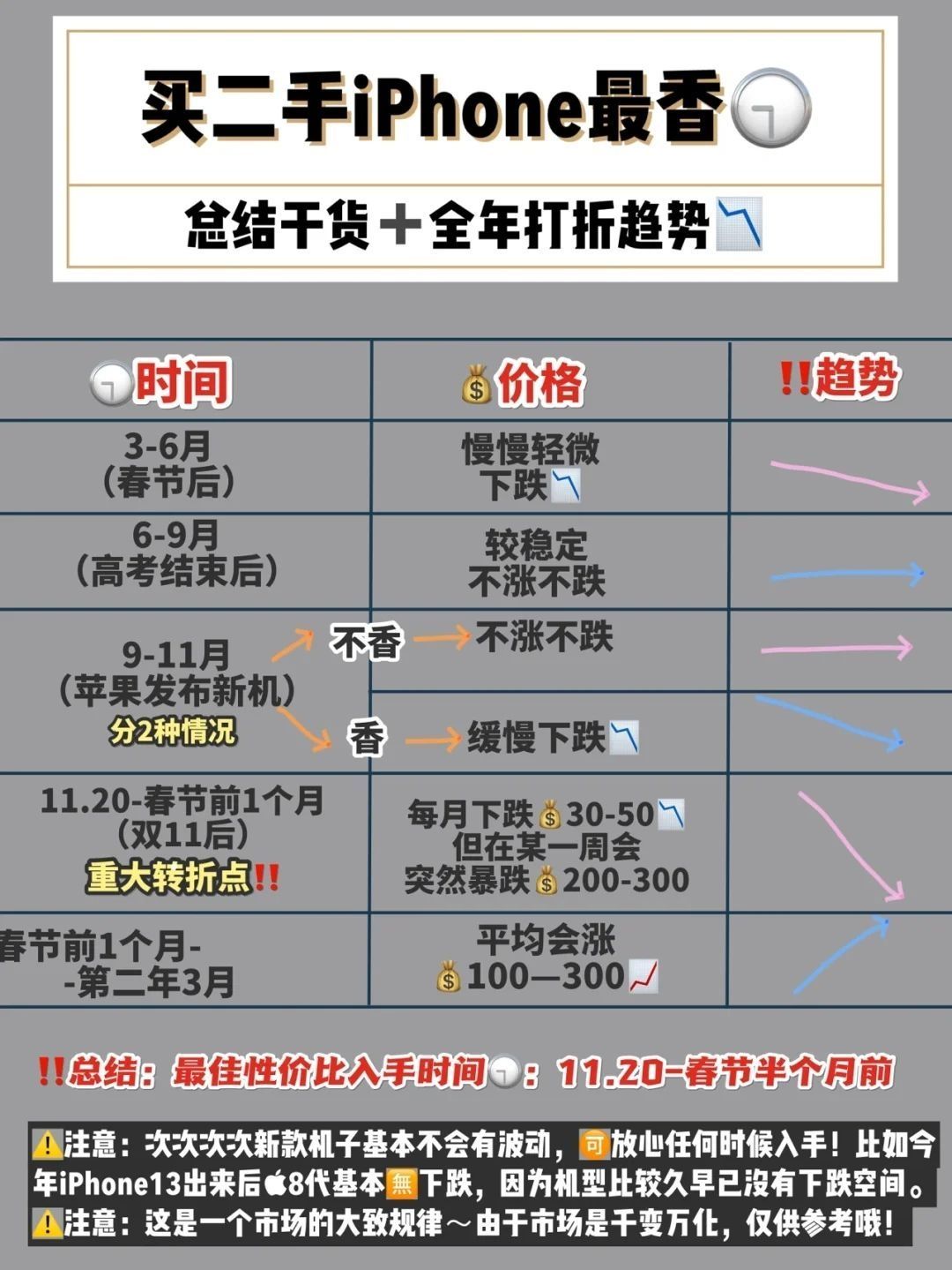 大家好~我是椿湫数码!二手行业圈内人 相信姐妹们在考虑、选择二手iPhone手机时,担心买完就降价📉,直接血亏🩸的情况! 那什么时候买二手苹果手机📱zui划算呢?以及二手iPhone在一整年的价格趋势是怎么样的呢?所以椿湫给大家总结了这份干货⬇️⬇️⬇️ ✨【什么时候买二手iPhone最划算】✨ P2⃣️:二手iPhone全年打折📉趋势总结 P3⃣️:iPhone十不买! P4⃣️:靠谱商家店铺几...