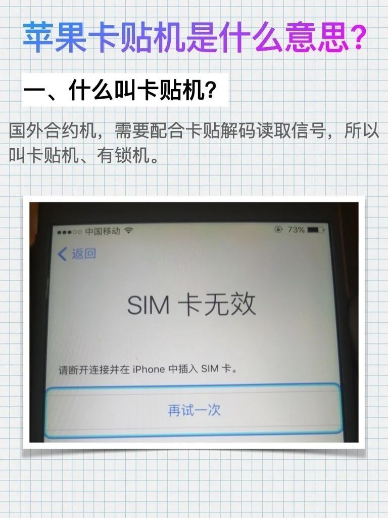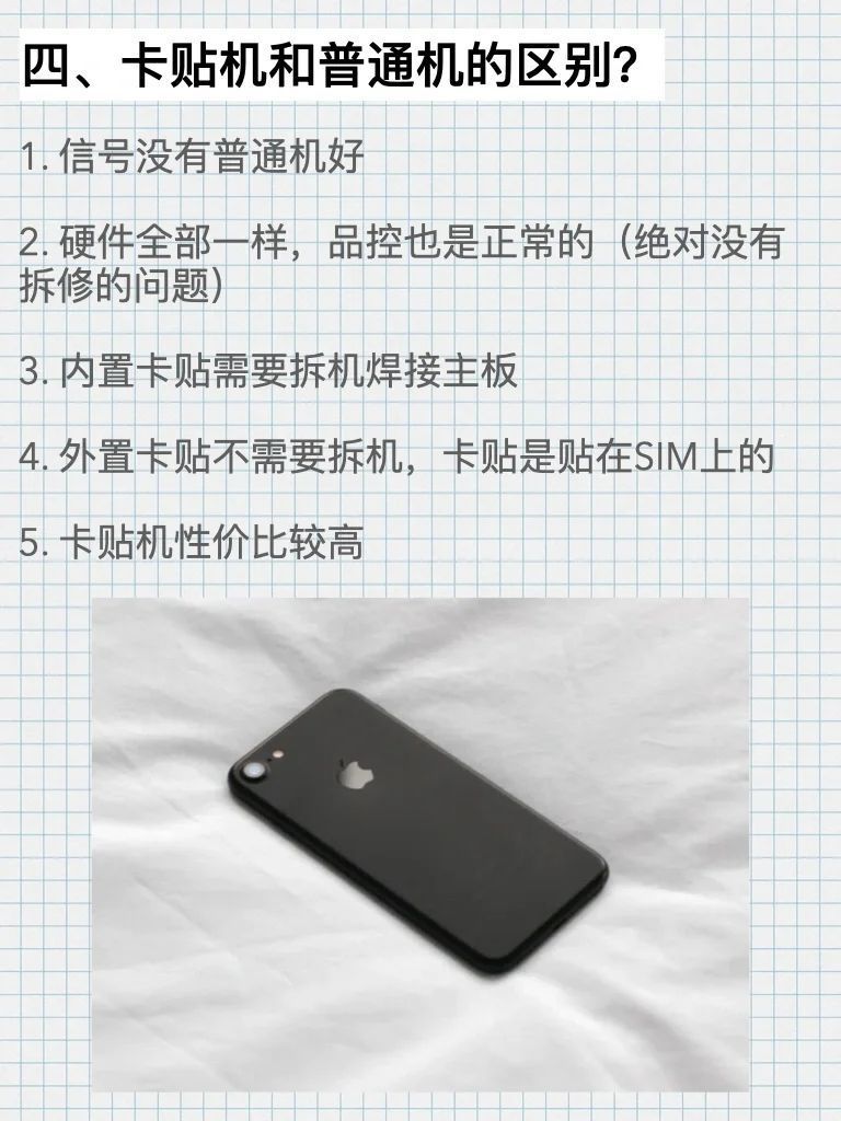🤔就是在机器中焊上一卡贴,让有锁的手机变成无锁手机,能够方便使用国内运营商电话卡; 😘卡贴的尺寸大小和sim卡的大小是完全一样的,把卡贴和要使用的sim卡重合在一起,放到手机里面; 🤔卡贴上面有芯片,芯片内保留移动运营商信息,手机开机后,卡贴芯片内的信息,这样就可以通过运营商定制苹果手机身份认证。 🧐运营商会认为是他的合法手机用户,苹果手机就可以正常使用了。 你了解到了嘛!友友们!