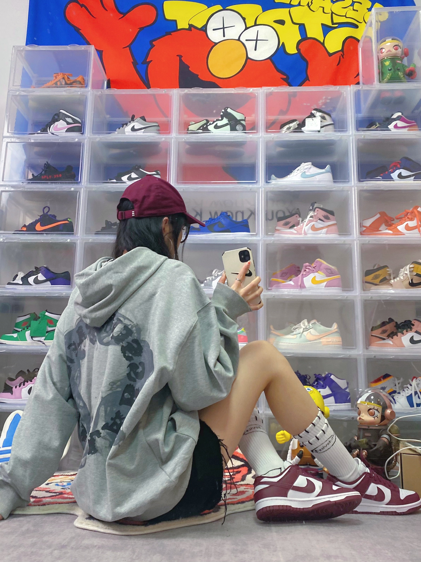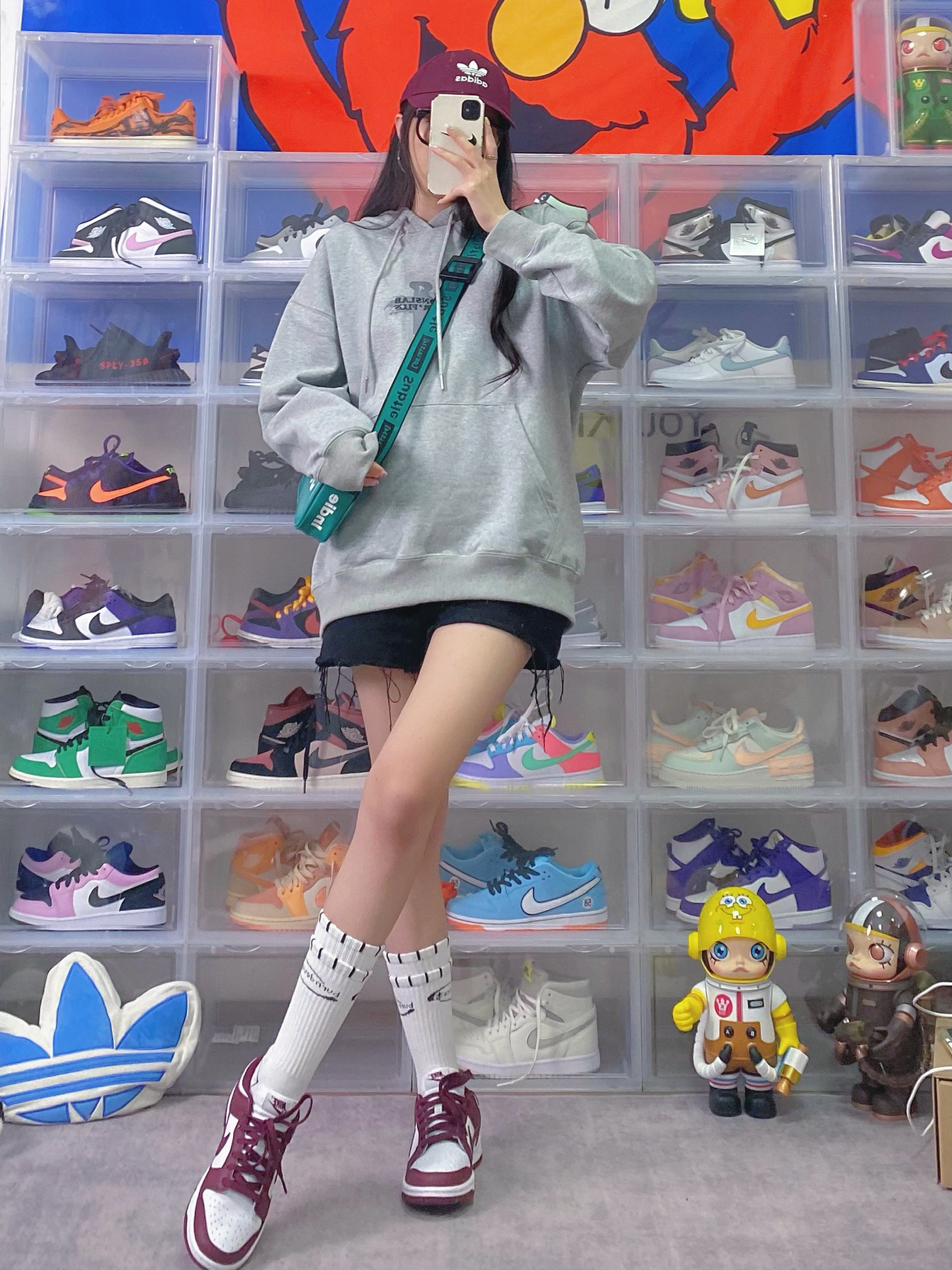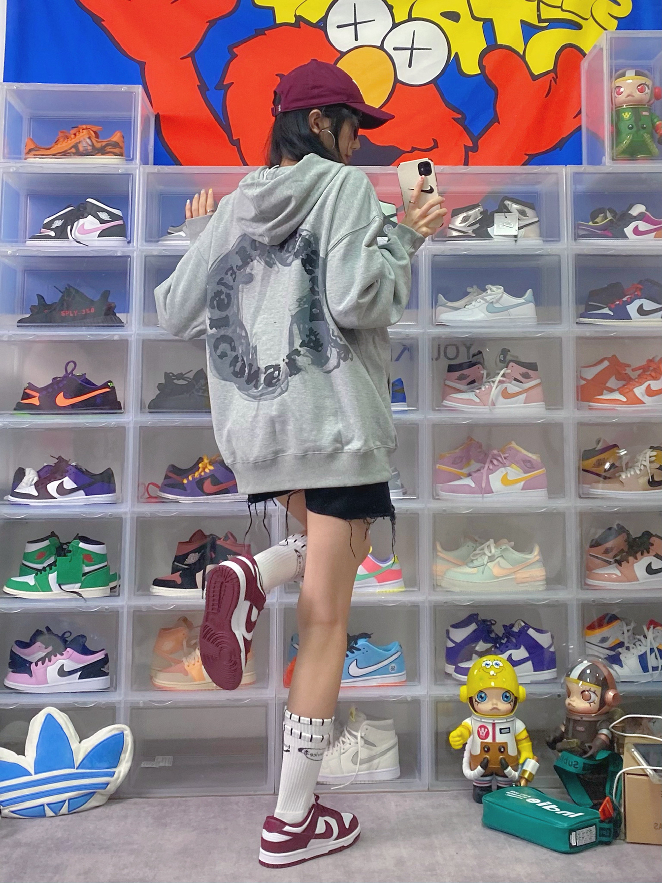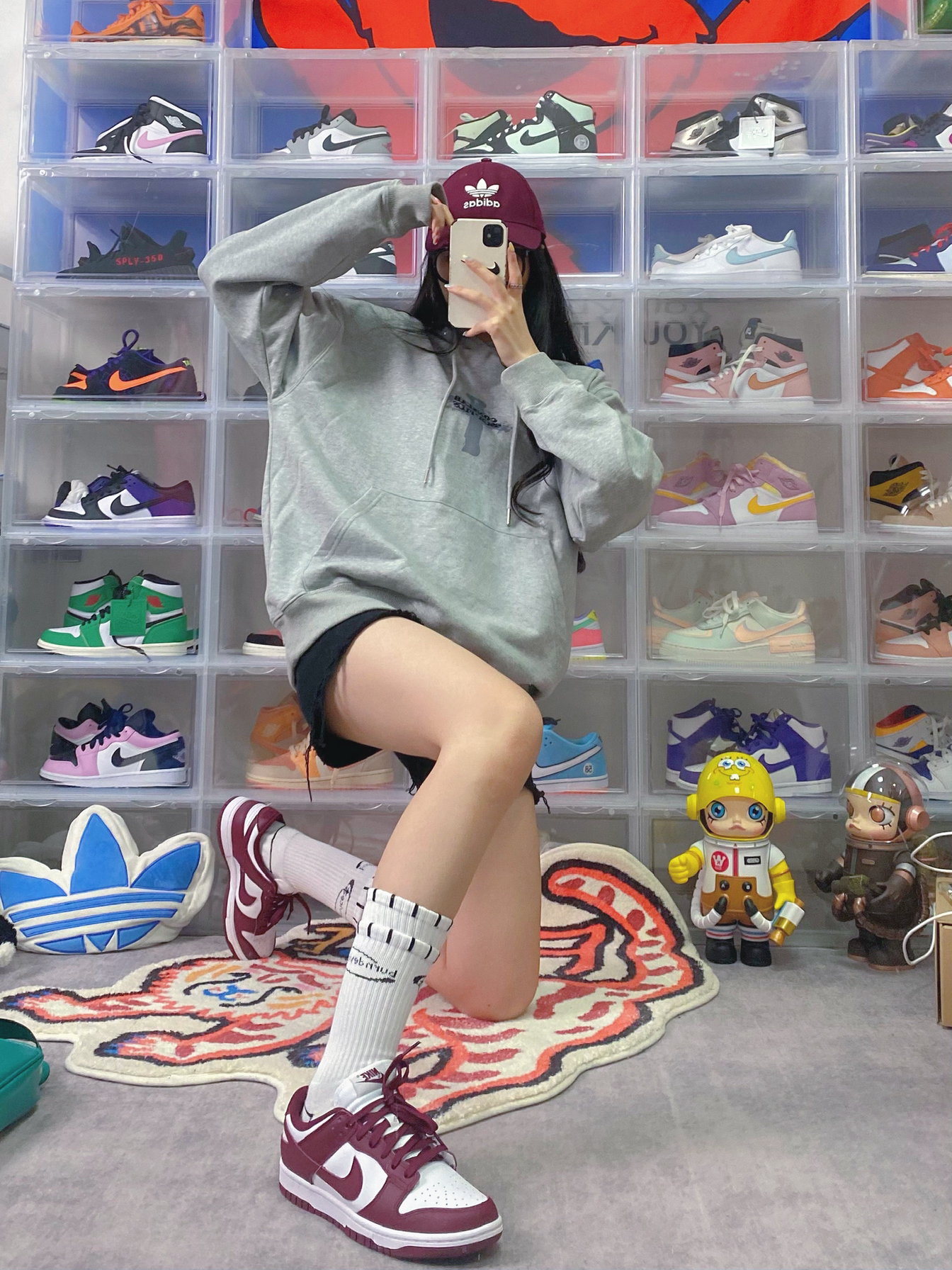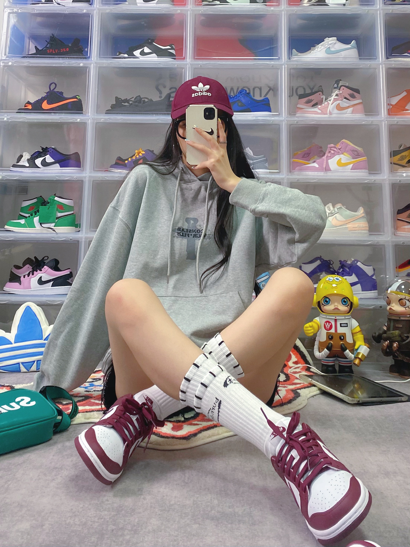 👔:iconslab 🧦:BURNDEVICE燃烧装置 👟:dunk酒红 栗子又入新鞋啦 对酒红色也是毫无抵抗力 这双dunk酒红色很有复古学院风的味道 白色假两层的袜子也很潮 搭配灰色卫衣也是一绝 卫衣背后是很🔥的烟圈设计 宽松版型我很喜欢