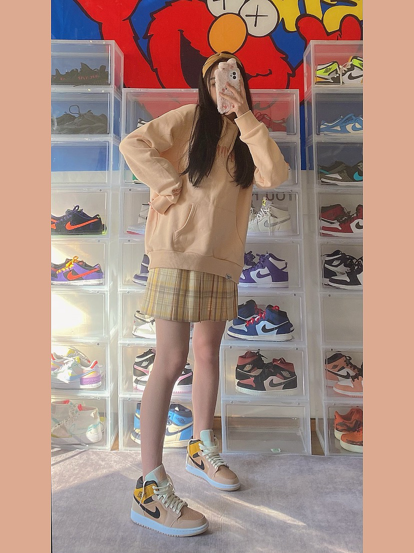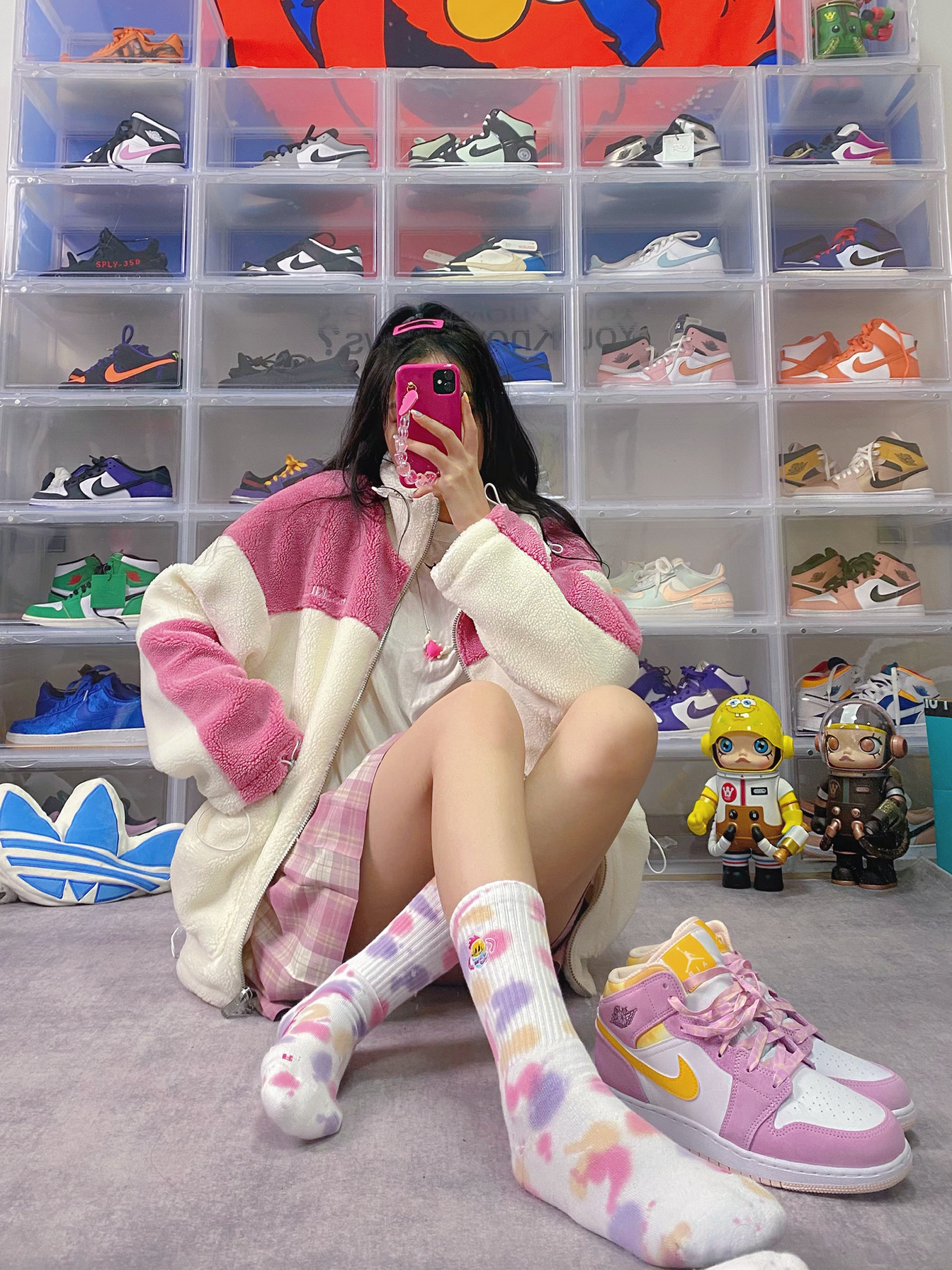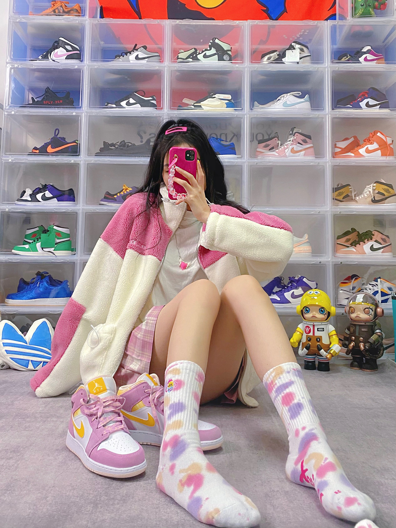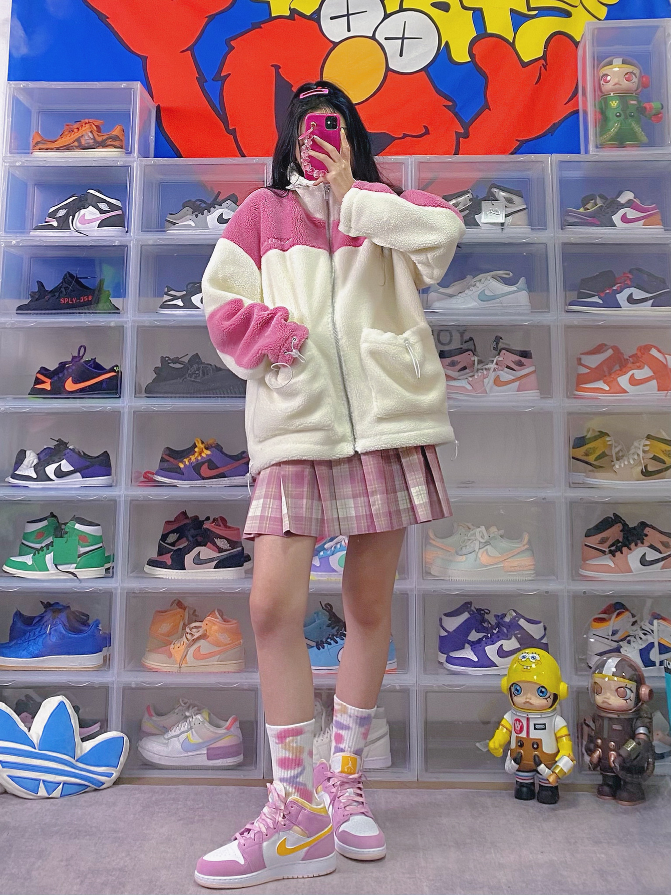 🧥:BTK 🧦:UZIS 👟:aj1 樱花粉 衣服背后超可爱的小怪兽 粉色拼接也太减龄! 羊羔毛很软糯 喜欢这件衣服的细节设计 袖口领子和口袋处都装了抽绳 冬天就不会进风啦 袜子粉紫扎染 很梦幻! 果然樱花粉配色的鞋子永远吸引女生!