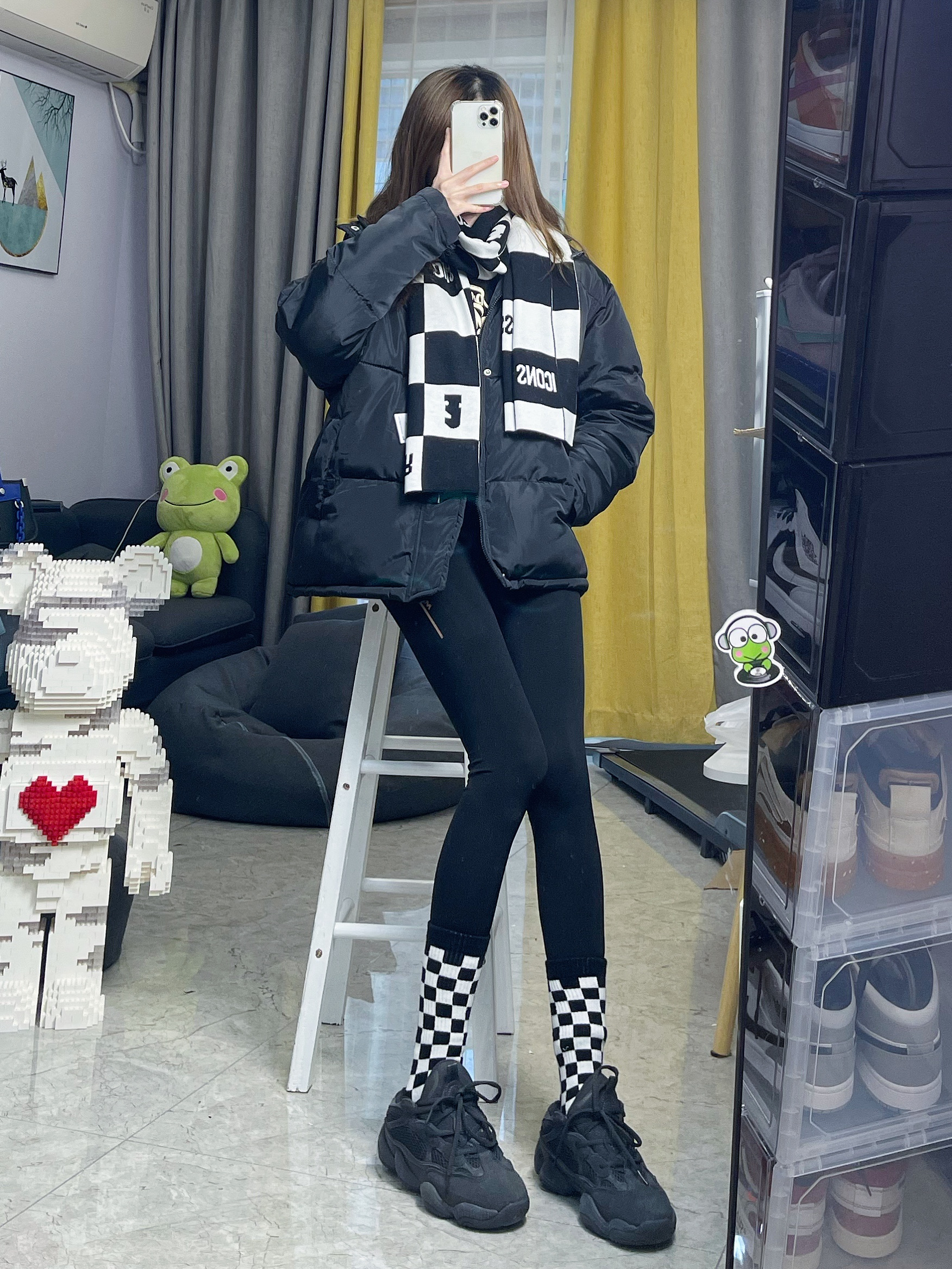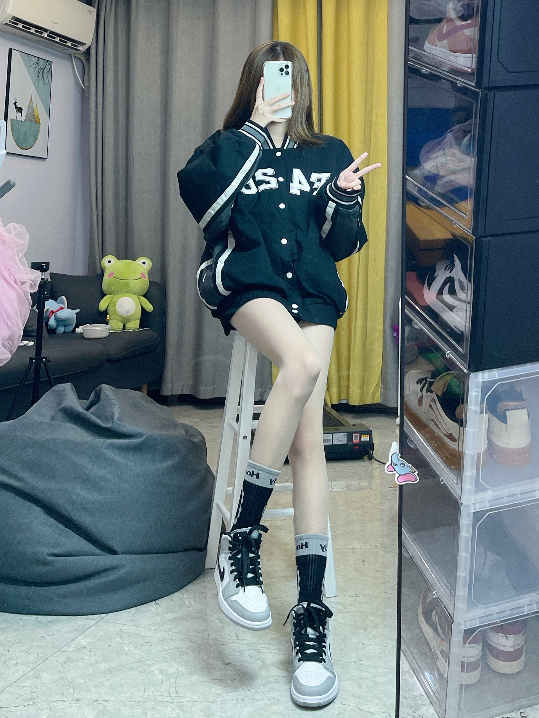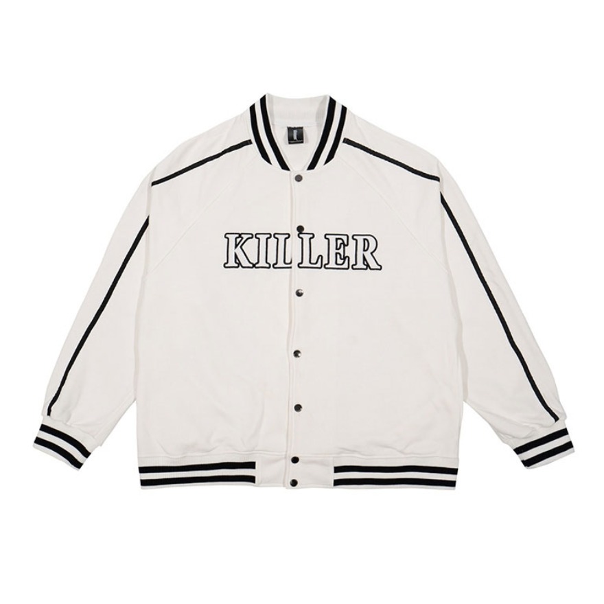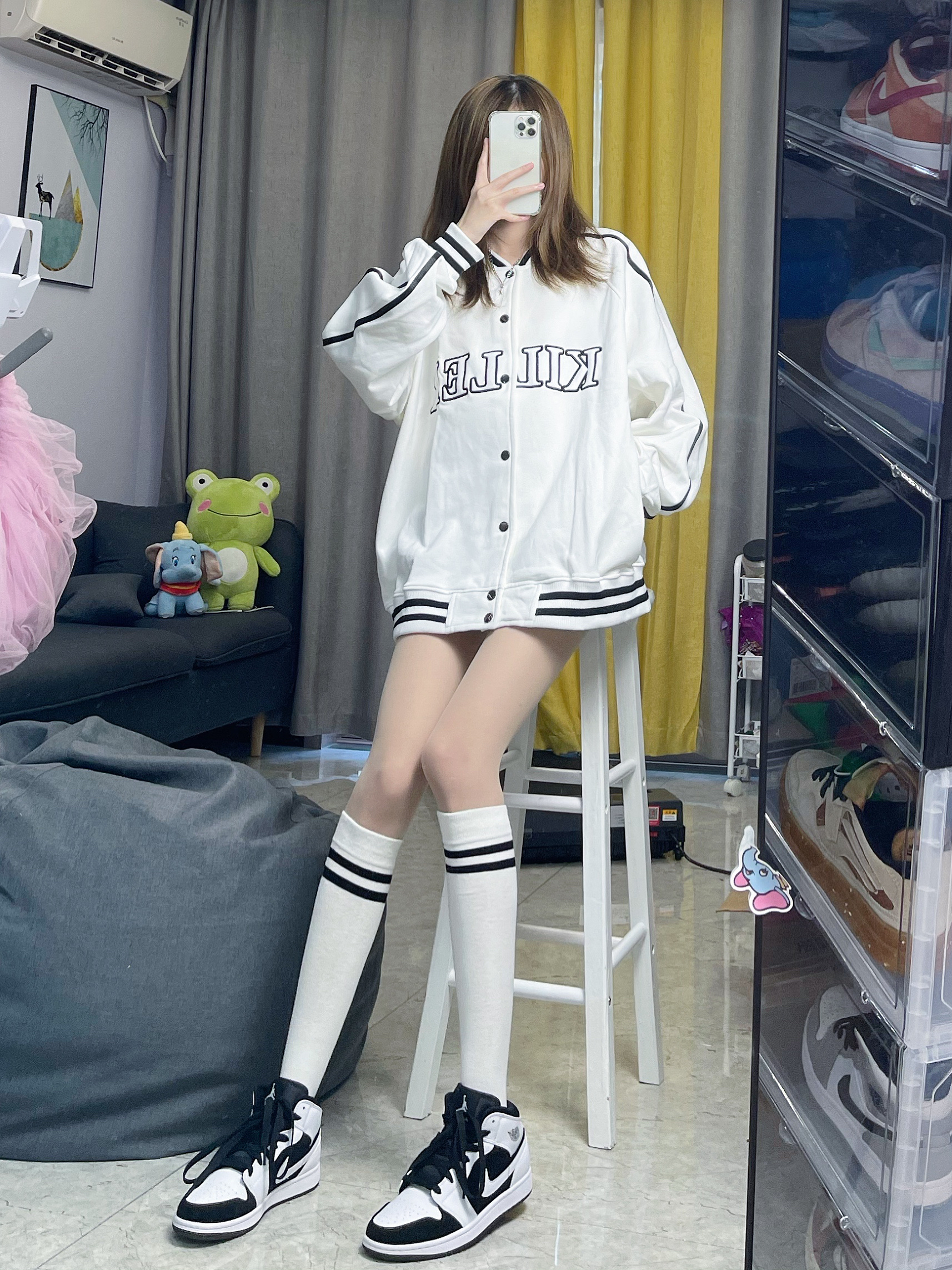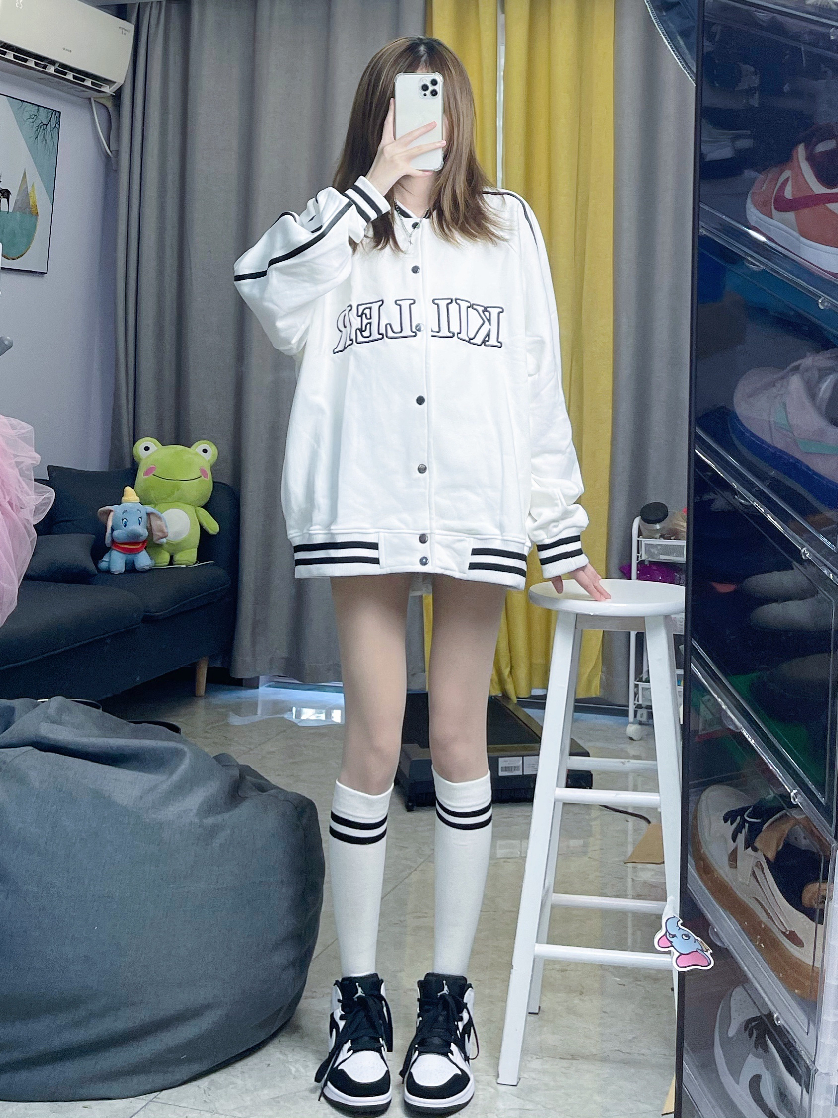 👔棒球服:killwinner 白色是蛮显眼的,超级好看,而且我好喜欢这个棒球服上面的logo超级好看,哈哈哈哈特别吸眼球,衣边是黑杠显得很学院,整件衣服简约又清爽 👟鞋子:aj1熊猫 这款aj是我最喜欢的