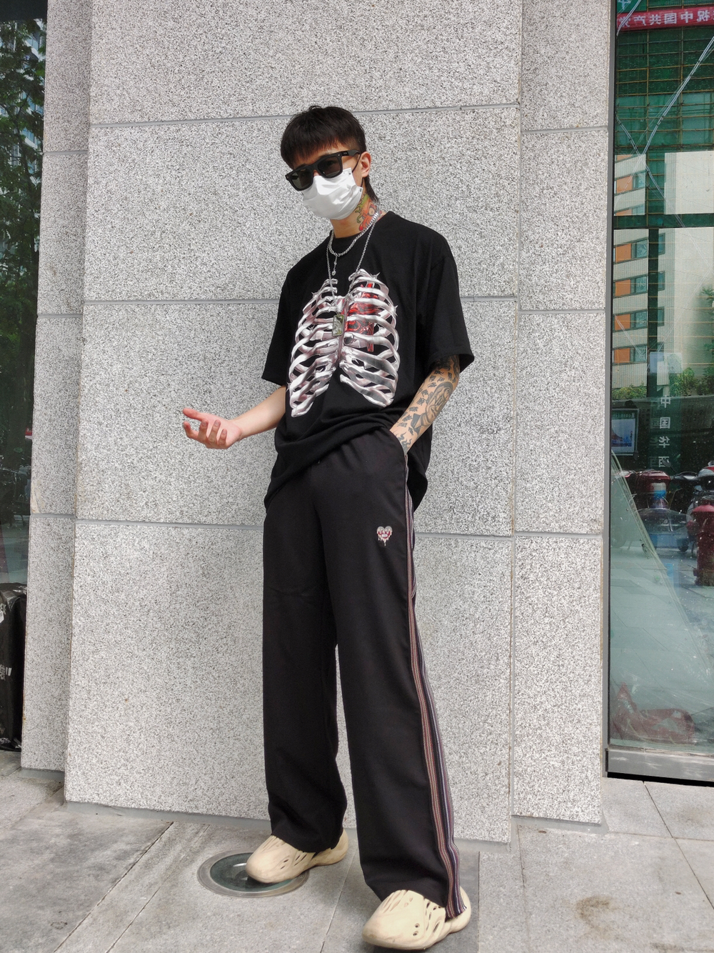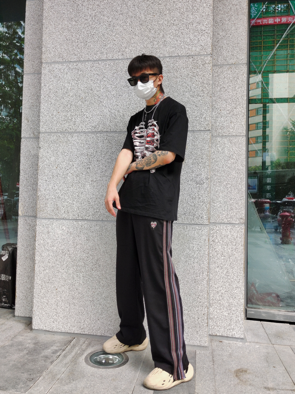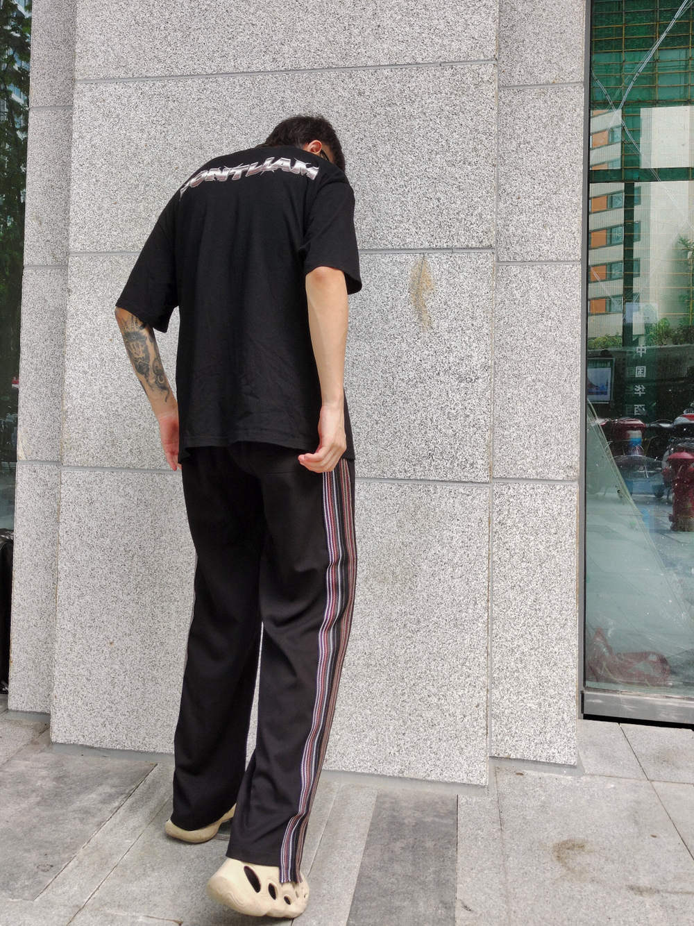 这款裤子真的超显腿长!宽松直筒的版型很好搭配鞋子,而且会在视觉上拉长腿型。黑色的底色配上侧边绣花织带,有一些做旧效果,质感不错。