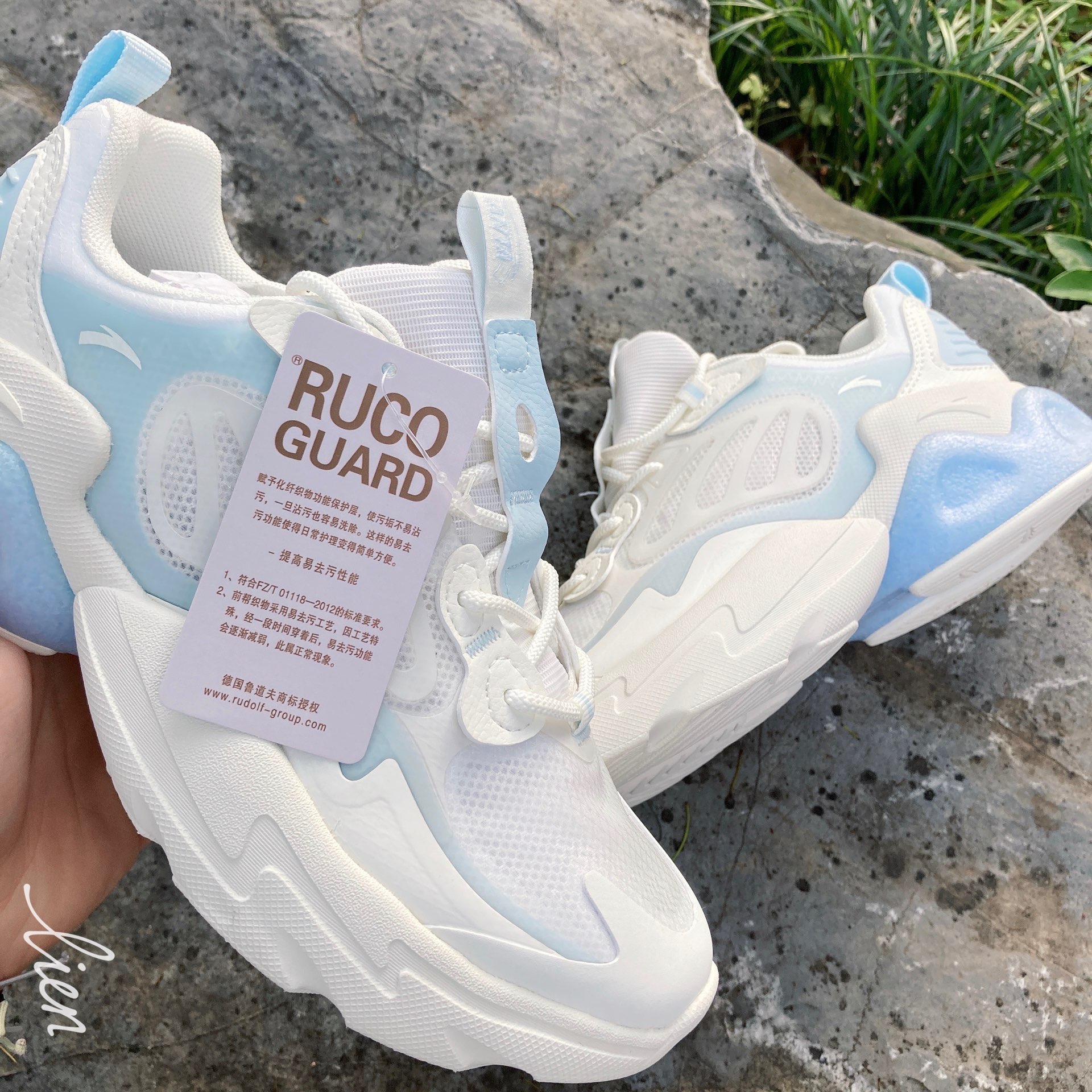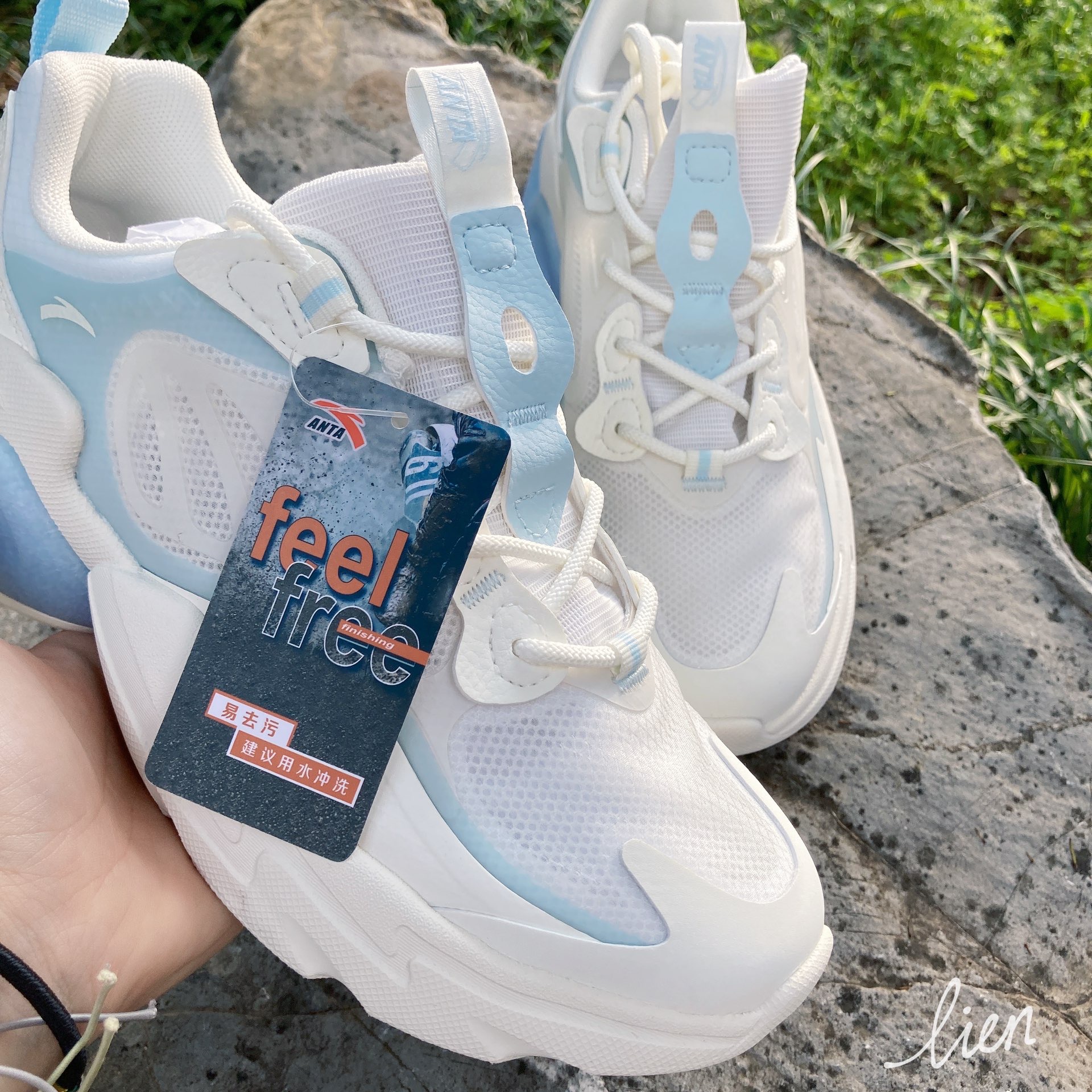 👟鞋款名称 【关晓彤同款】Anta安踏 千禧2.0 低帮老爹鞋 白蓝 女款 😆外观配色 我更愿意称它为冰蓝,第一眼就给人很清爽的感觉 👀设计细节 鞋面采用鲁道夫三防处理剂RUCO-GUARD,赋予化纤织物功能保护层,不易沾染污垢,即便沾上也容易洗除。这就很方便清洁了,“洗一洗,搓一搓,晒一晒”又是一双新鞋😬 😀上脚感受 脚感一般,没有说那种非常软的,但是轻薄的鞋面非常适合夏天 个人感觉,偏大了半码...