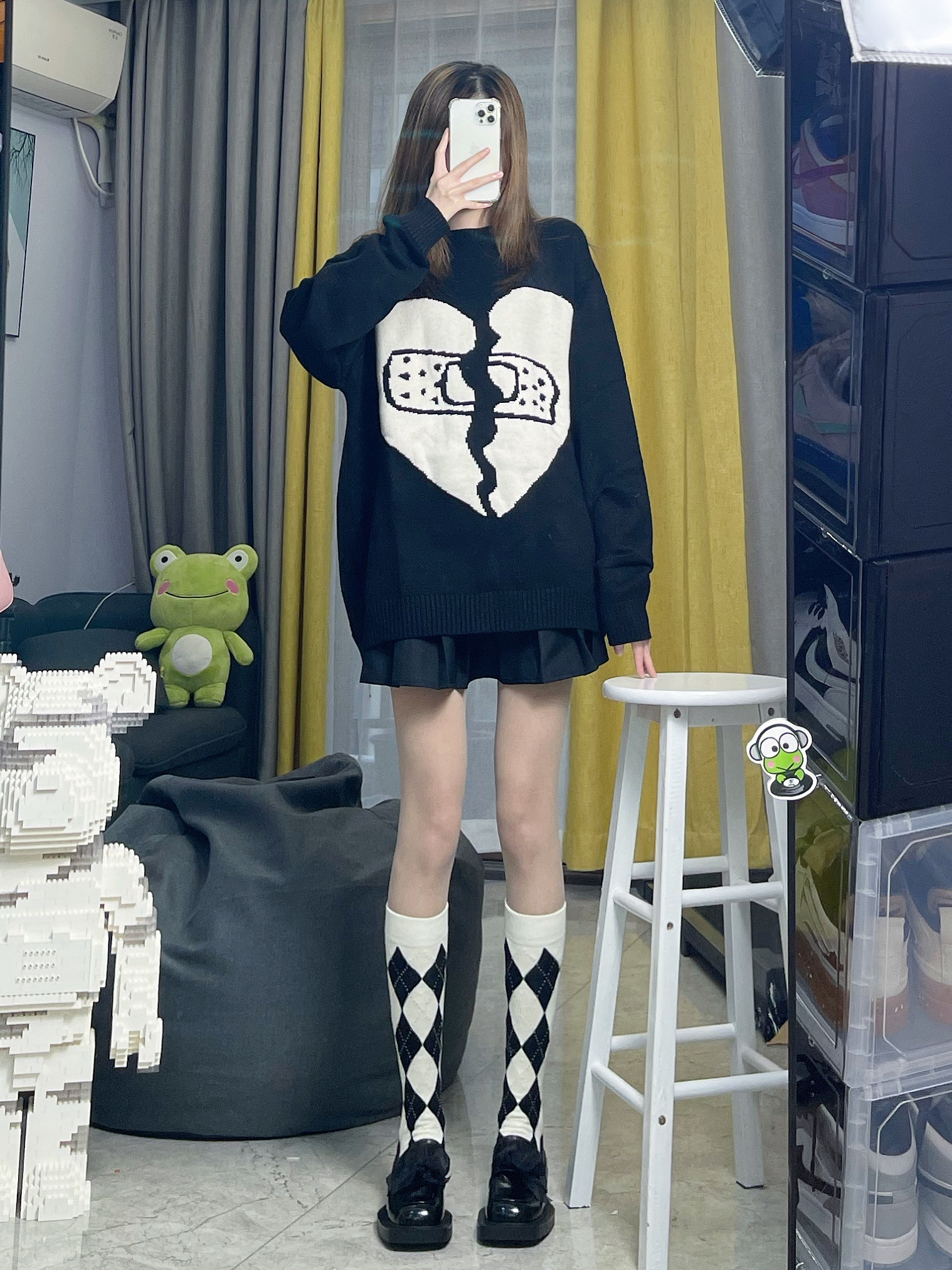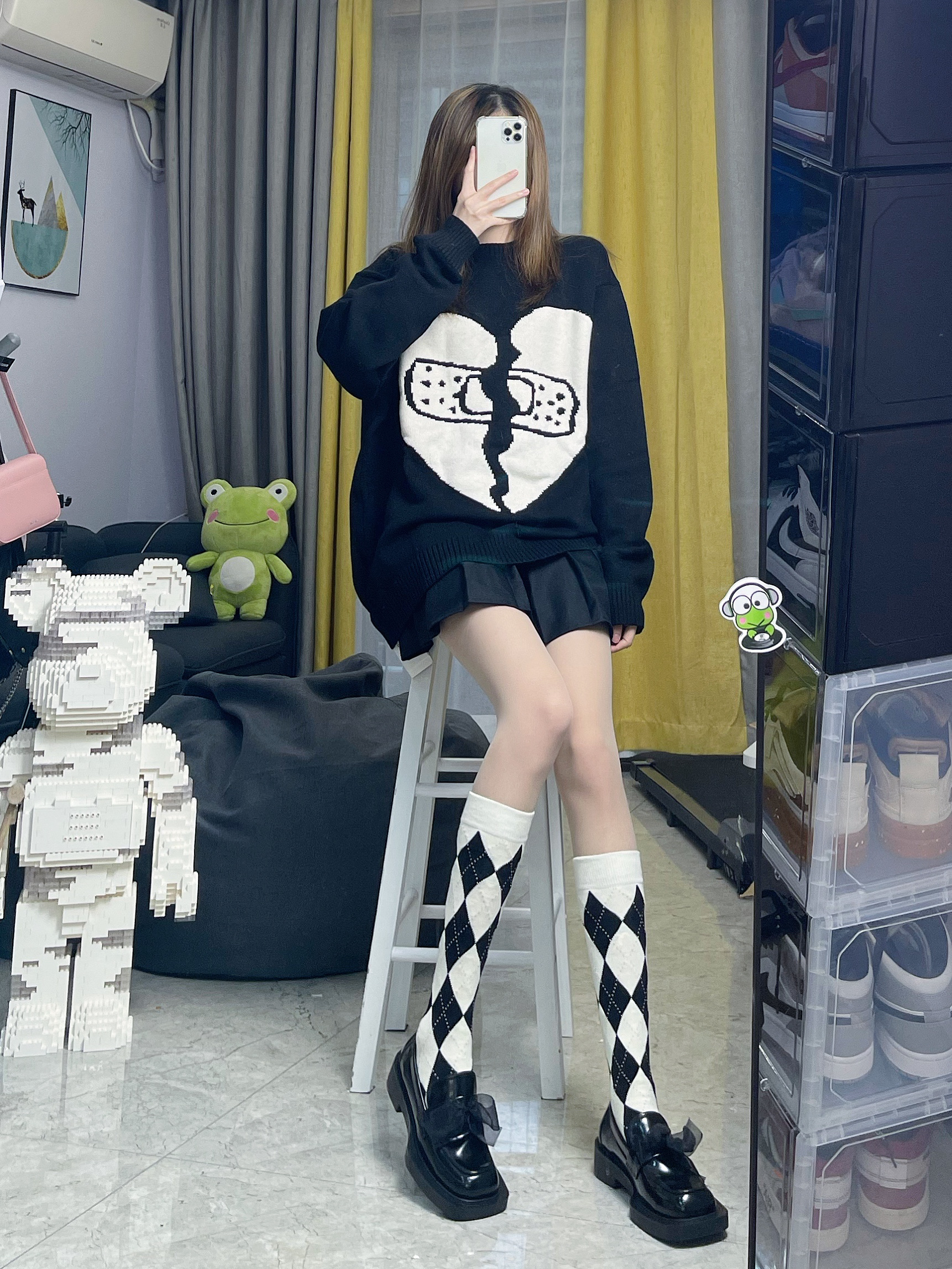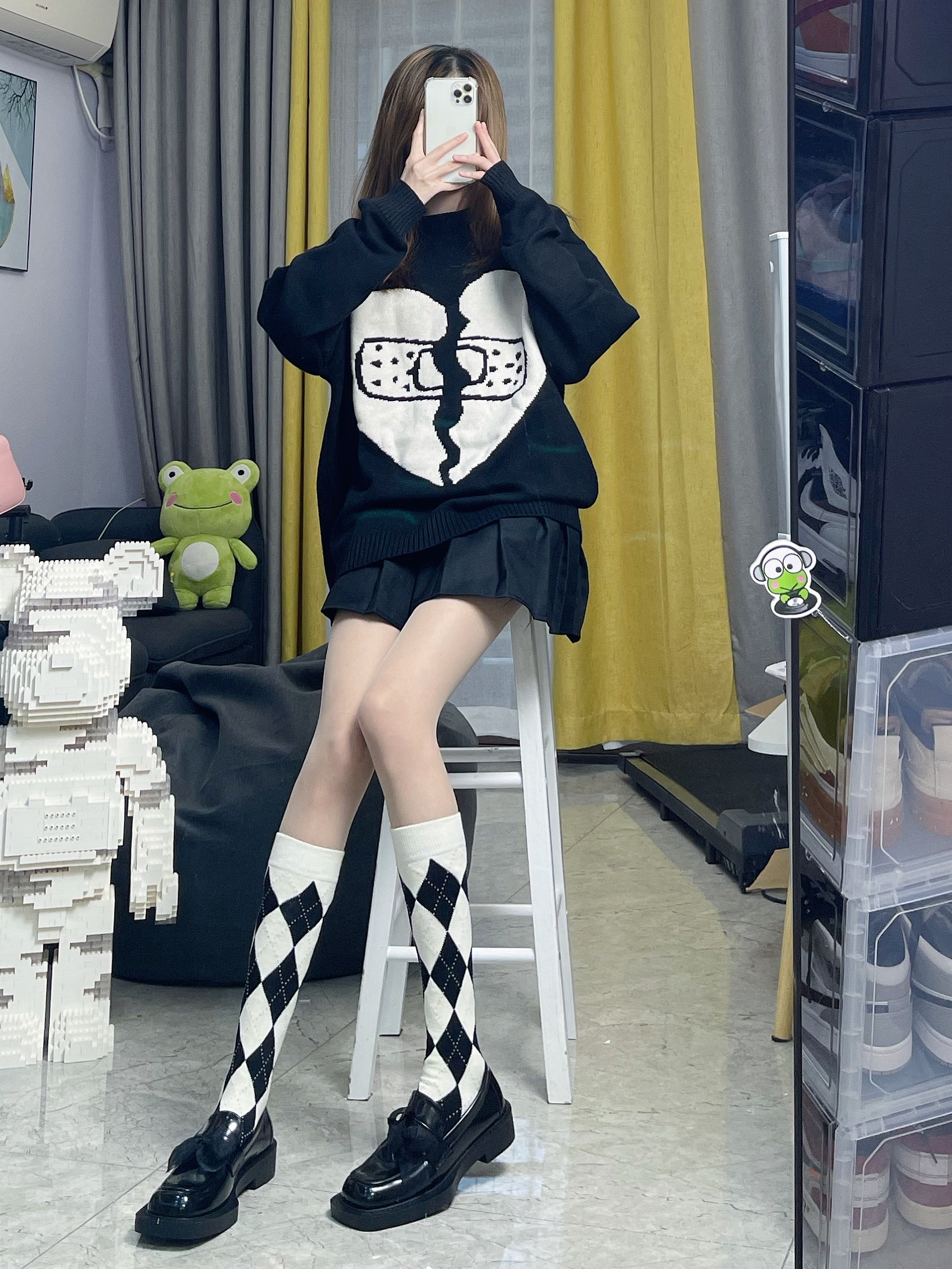 👔心碎创可贴毛衣:SanjatiCrane 好喜欢这个图案[捂脸],之前入了蓝色的哈哈。下半身失踪又很显身材比例!这套适合慵懒日常,幂式穿搭绝绝子!穿这种宽松的毛衣在男朋友面前就是小小的一只~ 🧦长筒袜: primeet 一开始挺拒绝的哈哈,但是没想到挺好看的 👞玛丽珍鞋:An old man 鞋面上有丝带蝴蝶结🎀,吸睛小能手,方头设计又甜又酷~