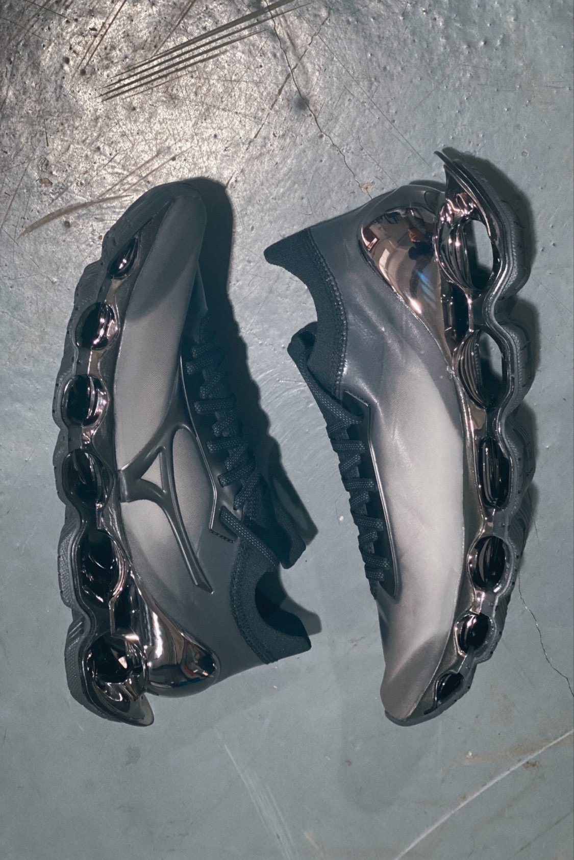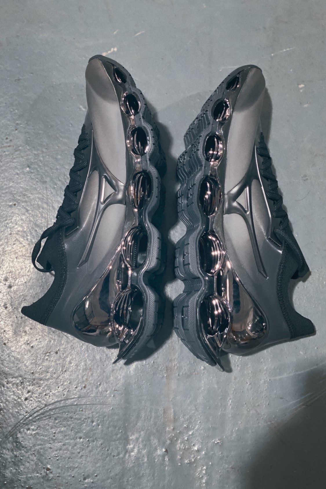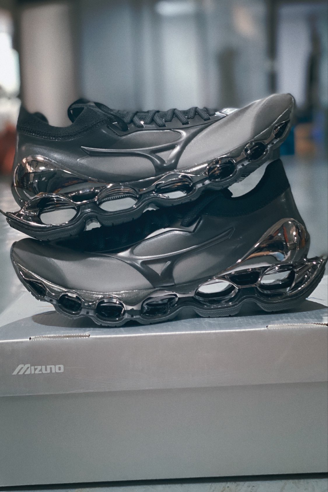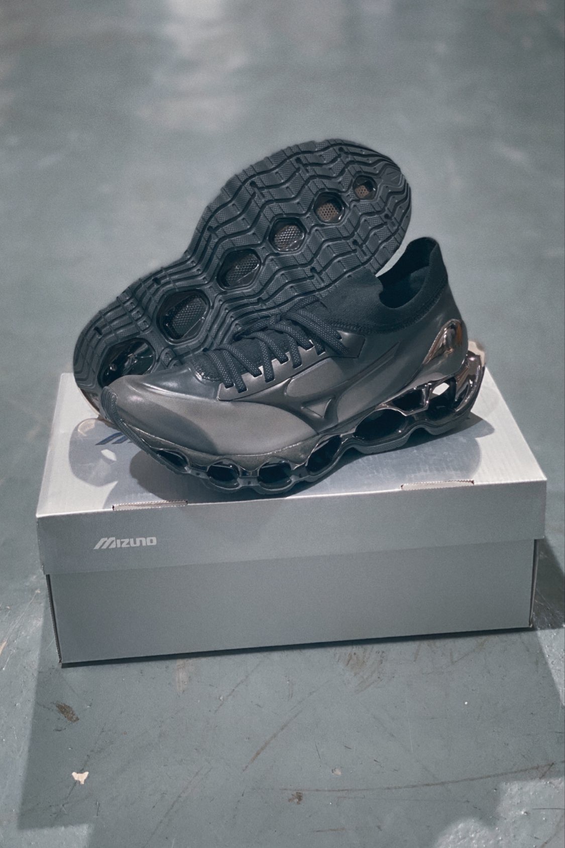 👟鞋款名称 【品牌专供:9月4日10点原价发售】Sorayama x Mizuno Wave Prophecy 空山基联名 黑色 😆外观配色 半透明鞋面烘托暗影黑的层次感 👀设计细节 中底镂空设计 😀上脚感受 彳亍 👕搭配建议 建议一身黑~搭配宽脚西裤 #Mizuno
