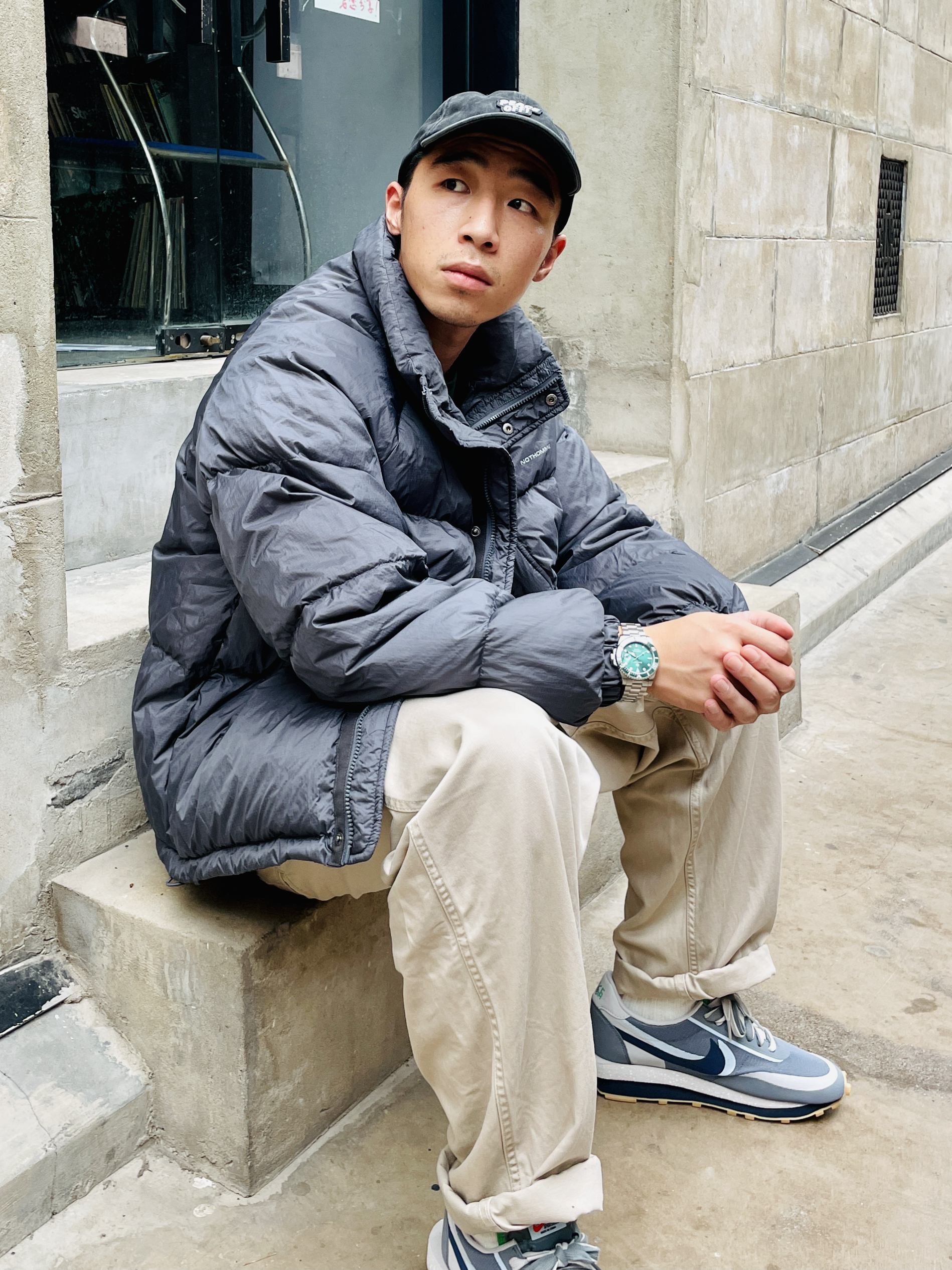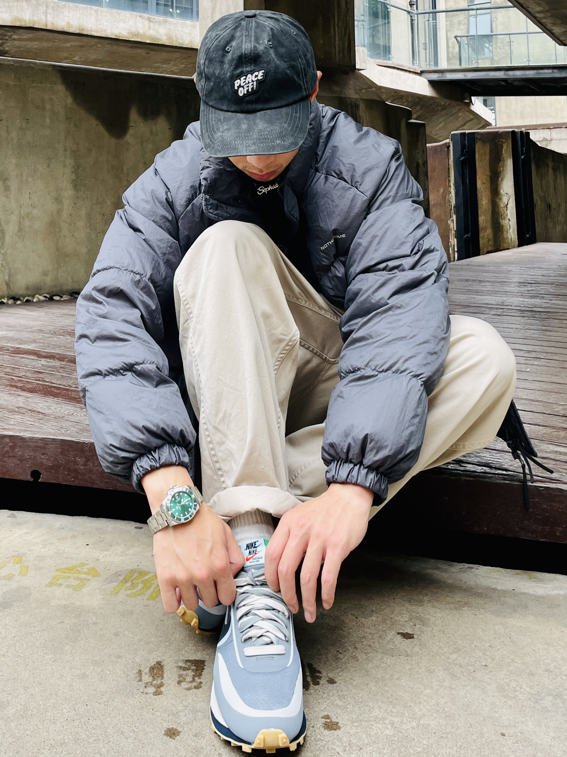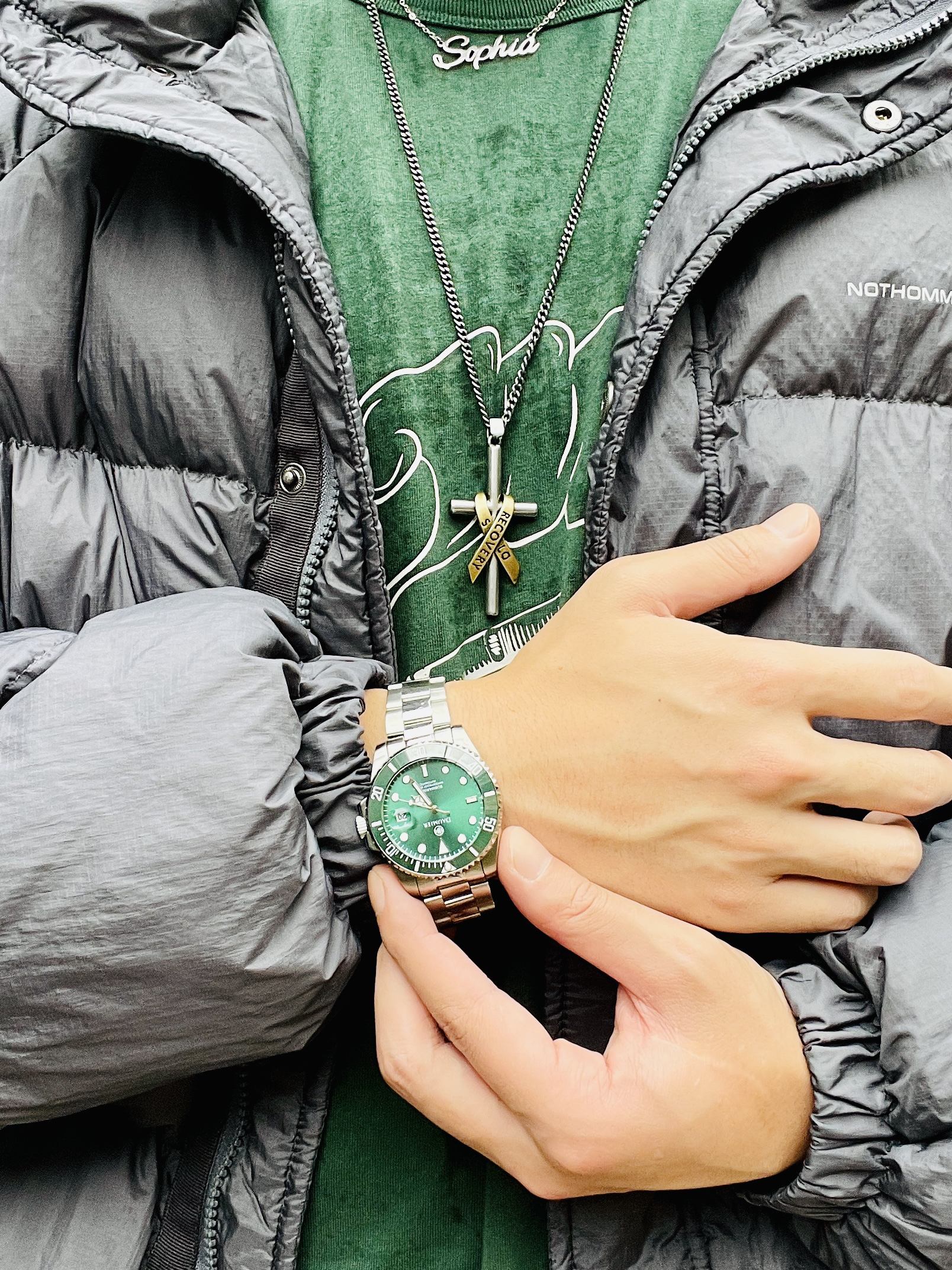 # 182 | 68kg 🐷 随性穿搭 丶 今日主打 ~ 灰绿~ 跟着鞋子来搭配穿搭~ 简单易学却又不失细节的搭配~ 深灰色外套和绿色短袖很好的呼应鞋款~ 少不了的配件~ ⌚️ ~ DAUMIER丹瑪 性价比很高的一款平价绿水鬼~ 人工合成蓝宝石镜面~镜面坚硬耐磨~ 机械机芯满足男生对机械的热爱~ 钢制表带质感的代名词~ 水鬼的羽毛🪶~日系经典的搭配组合~ SOLO 家这款联名的十字架✝...