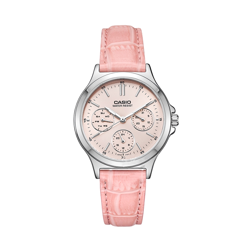 本篇笔记关联了Casio/卡西欧 DRESS系列 休闲经典指针三眼六针罗马刻度防水不锈钢表带电子石英女表 粉色皮带 LTP-V300L-4A等商品,为用户提供真实的使用体验和购买参考。