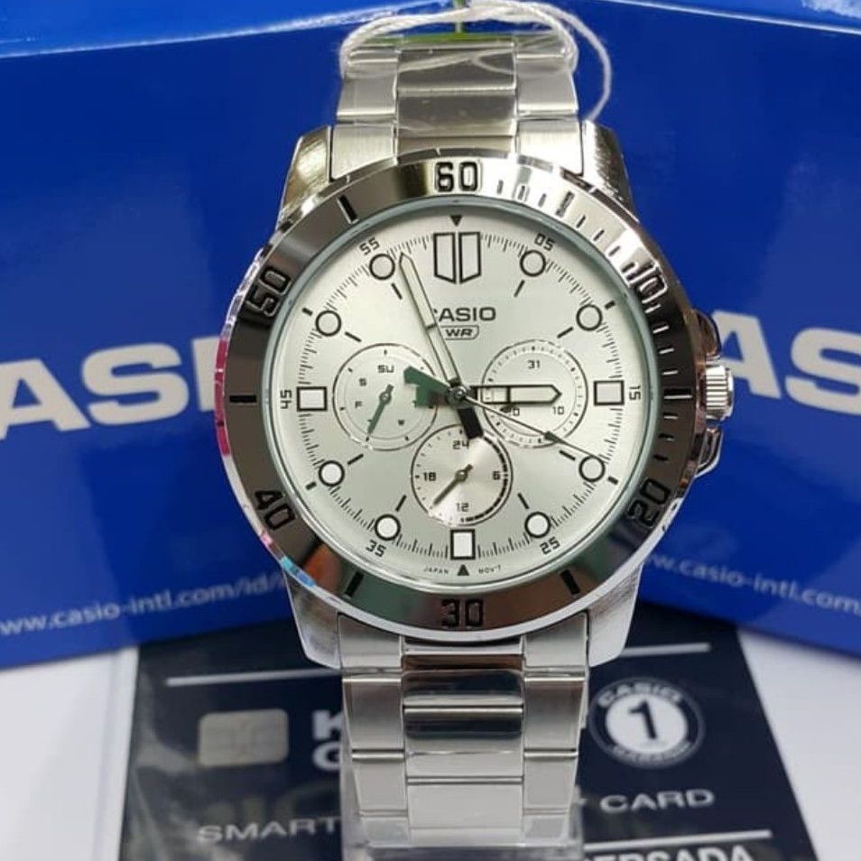 款式名称:Casio/卡西欧 休闲经典三眼指针石腕表 MTP-VD300 风格:日常穿搭 适用场景:运动 休闲 约会 适用人群:男 卡西欧的这款腕表,款式新颖,设计时尚大气,精钢表带佩戴起来十分舒适,非常不错的一款手表 图源网络,侵删
