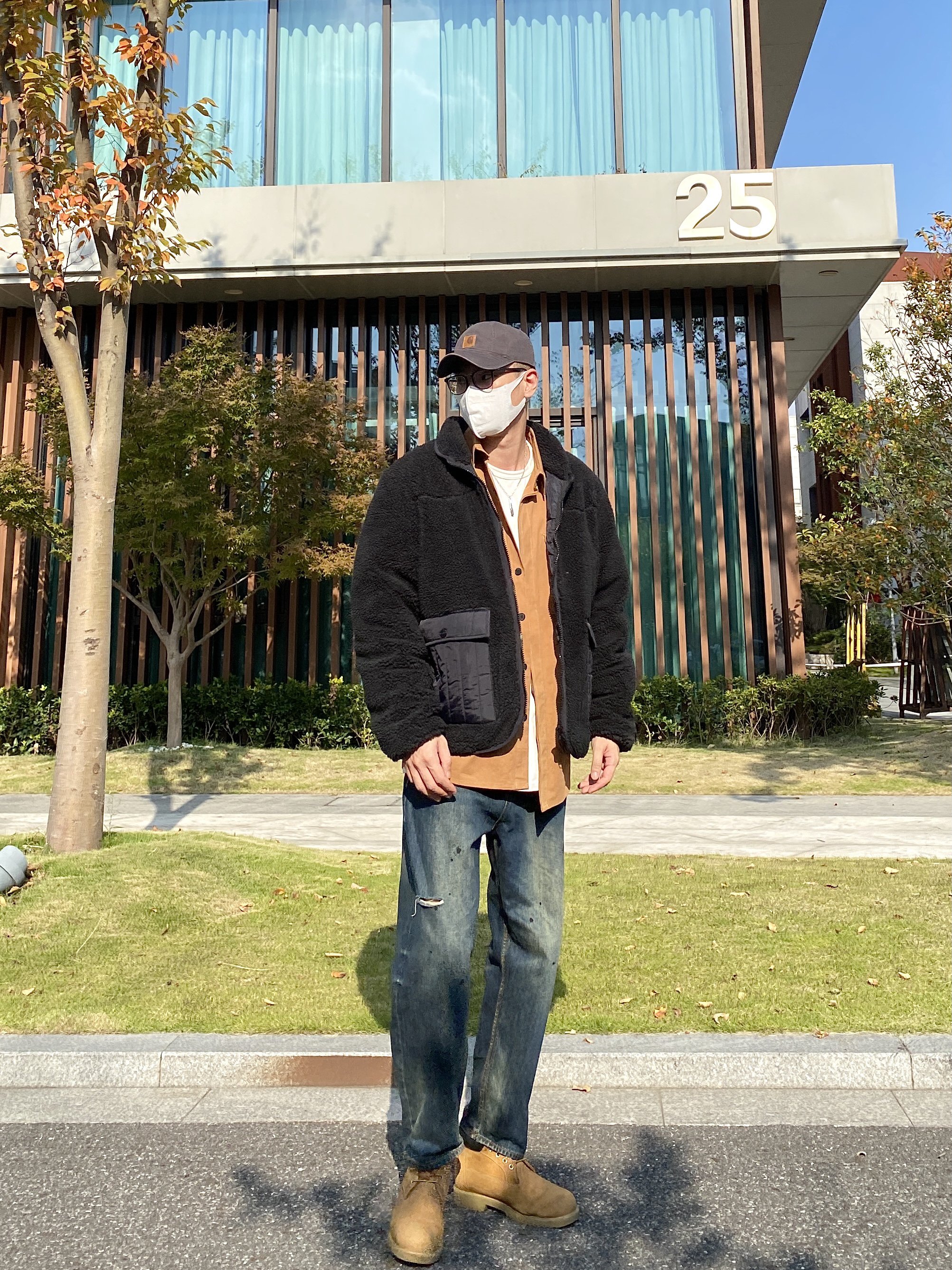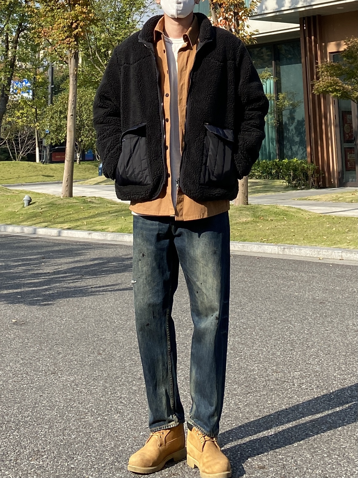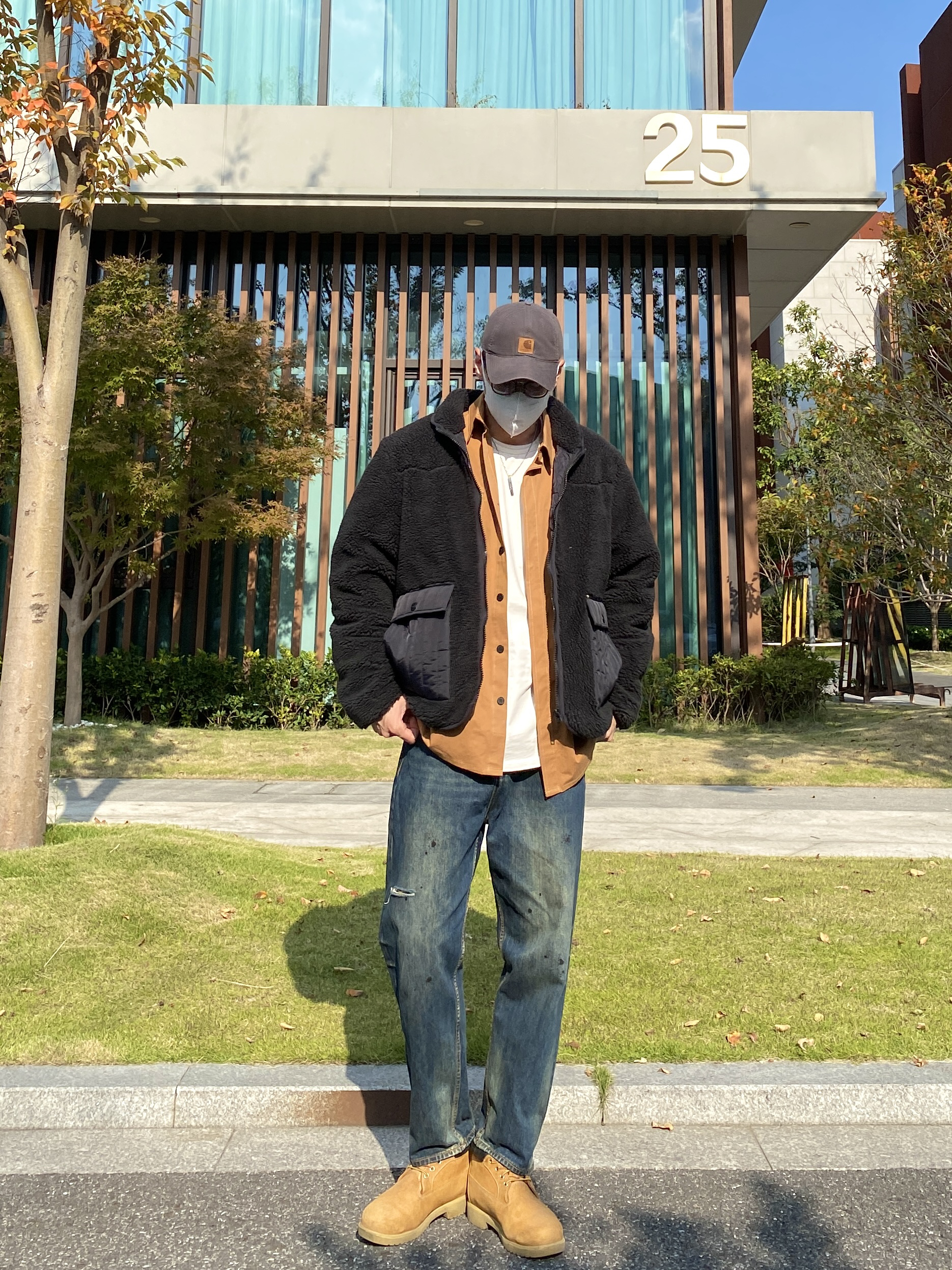 今天这套先用宽松圆领白T做打底,内搭叠穿一件多口袋姜黄色工装衬衫,裤子选择泼墨刀割直筒牛仔裤,鞋子上脚硬汉必备的沙漠黄工装靴,接着套上保暖的羊羔毛短款拼接加厚外套,最后戴一顶水洗棒球帽,OK,出门看看搭配效果吧! - 外套:wrangler威格 衬衫:nice lili 裤子:nice lili