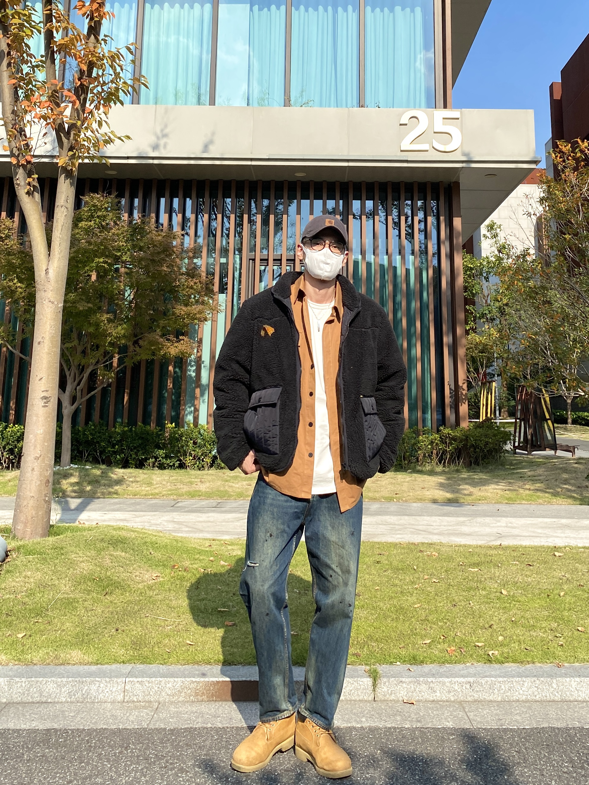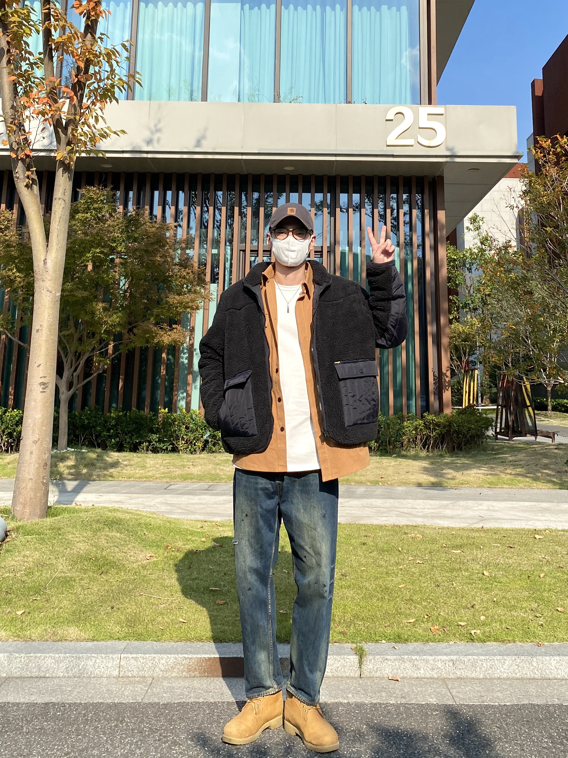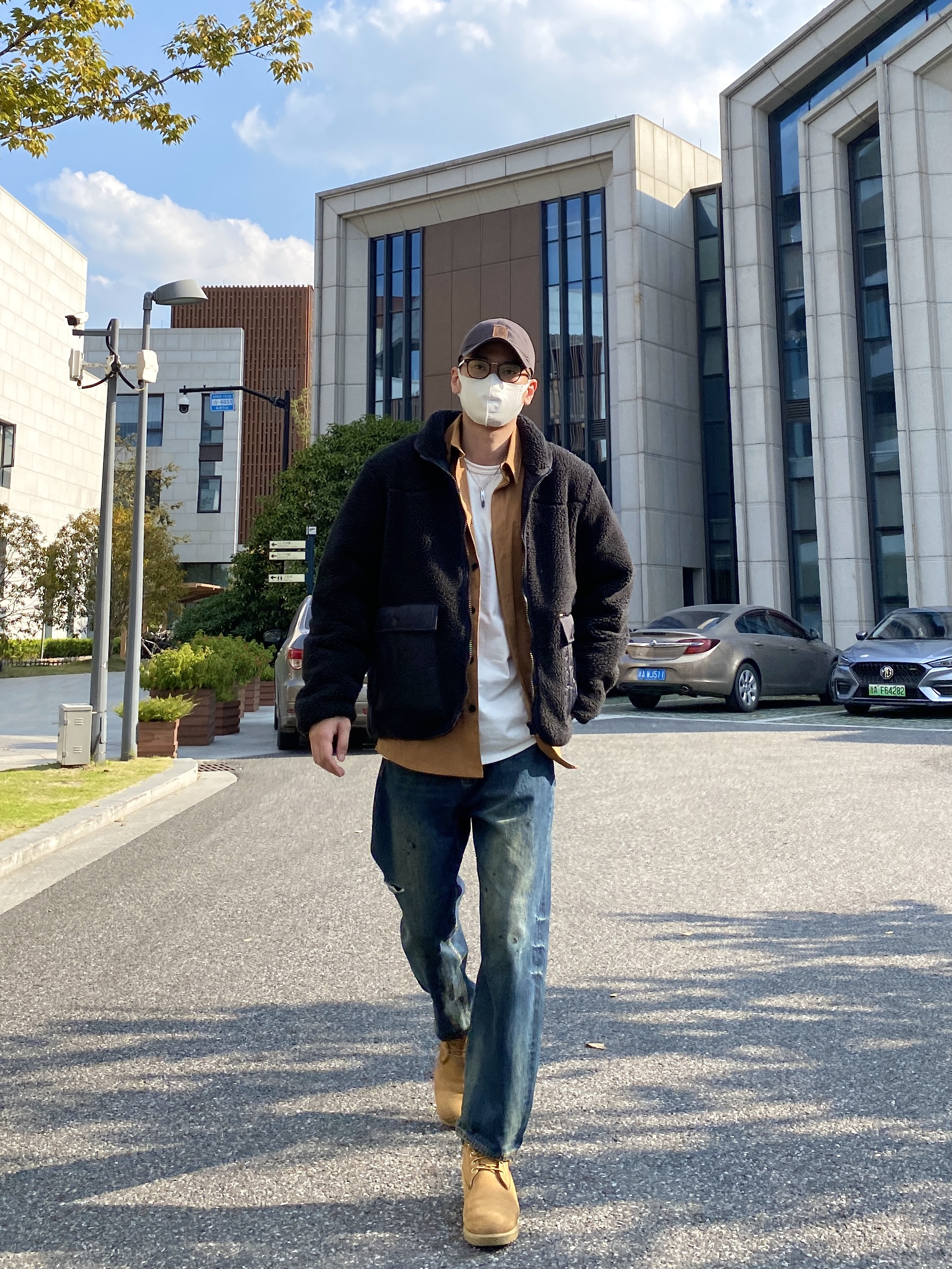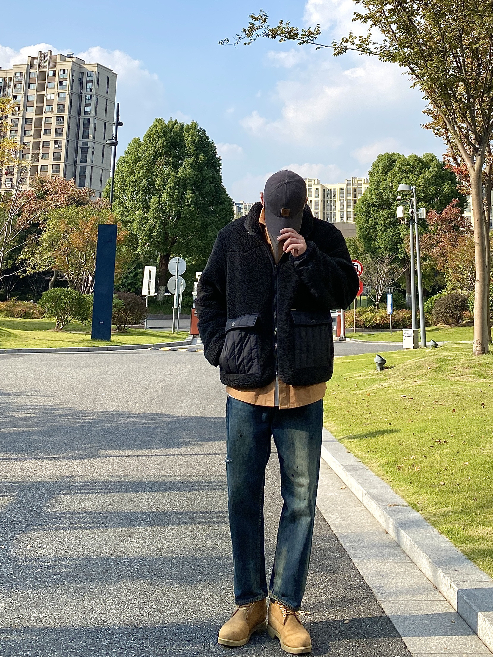 今天这套先用宽松圆领白T做打底,内搭叠穿一件多口袋姜黄色工装衬衫,裤子选择泼墨刀割直筒牛仔裤,鞋子上脚硬汉必备的沙漠黄工装靴,接着套上保暖的羊羔毛短款拼接加厚外套,最后戴一顶水洗棒球帽,OK,出门看看搭配效果吧! - 外套:wrangler威格 衬衫:nice lili 裤子:nice lili