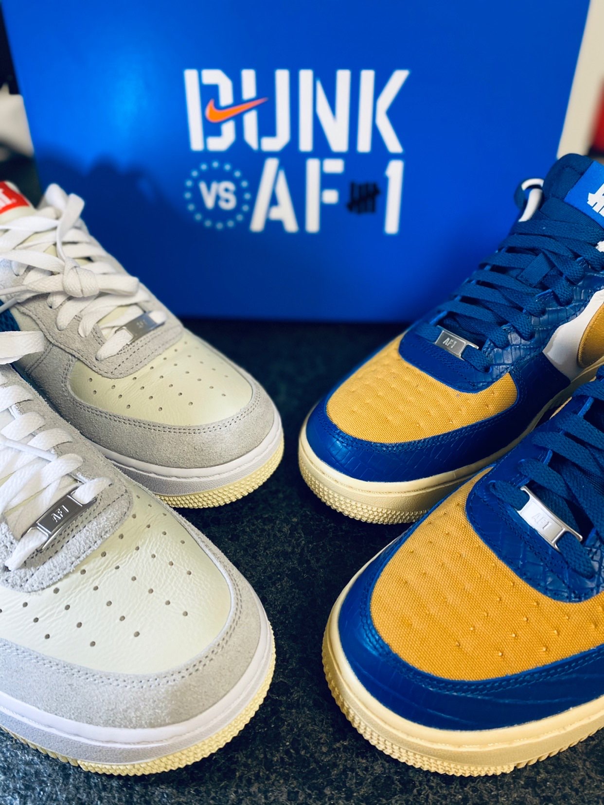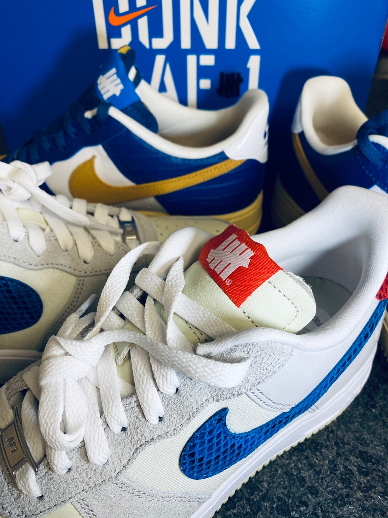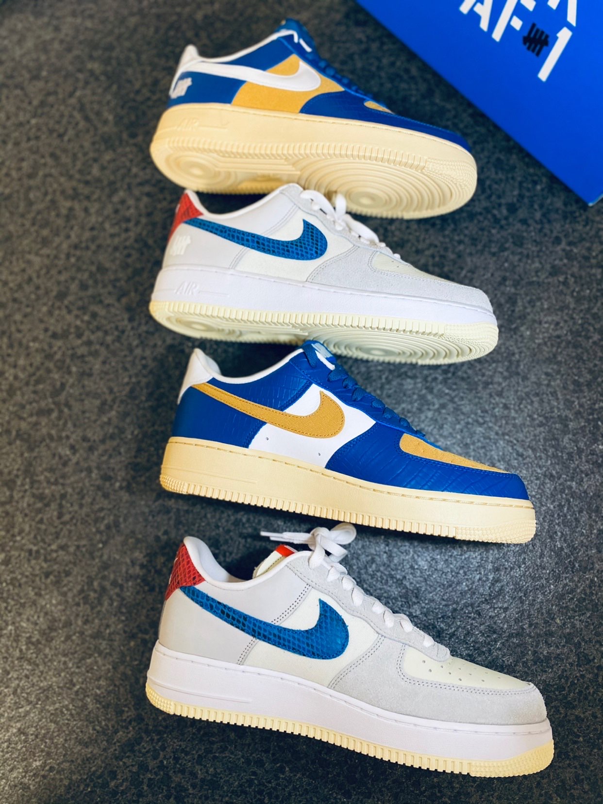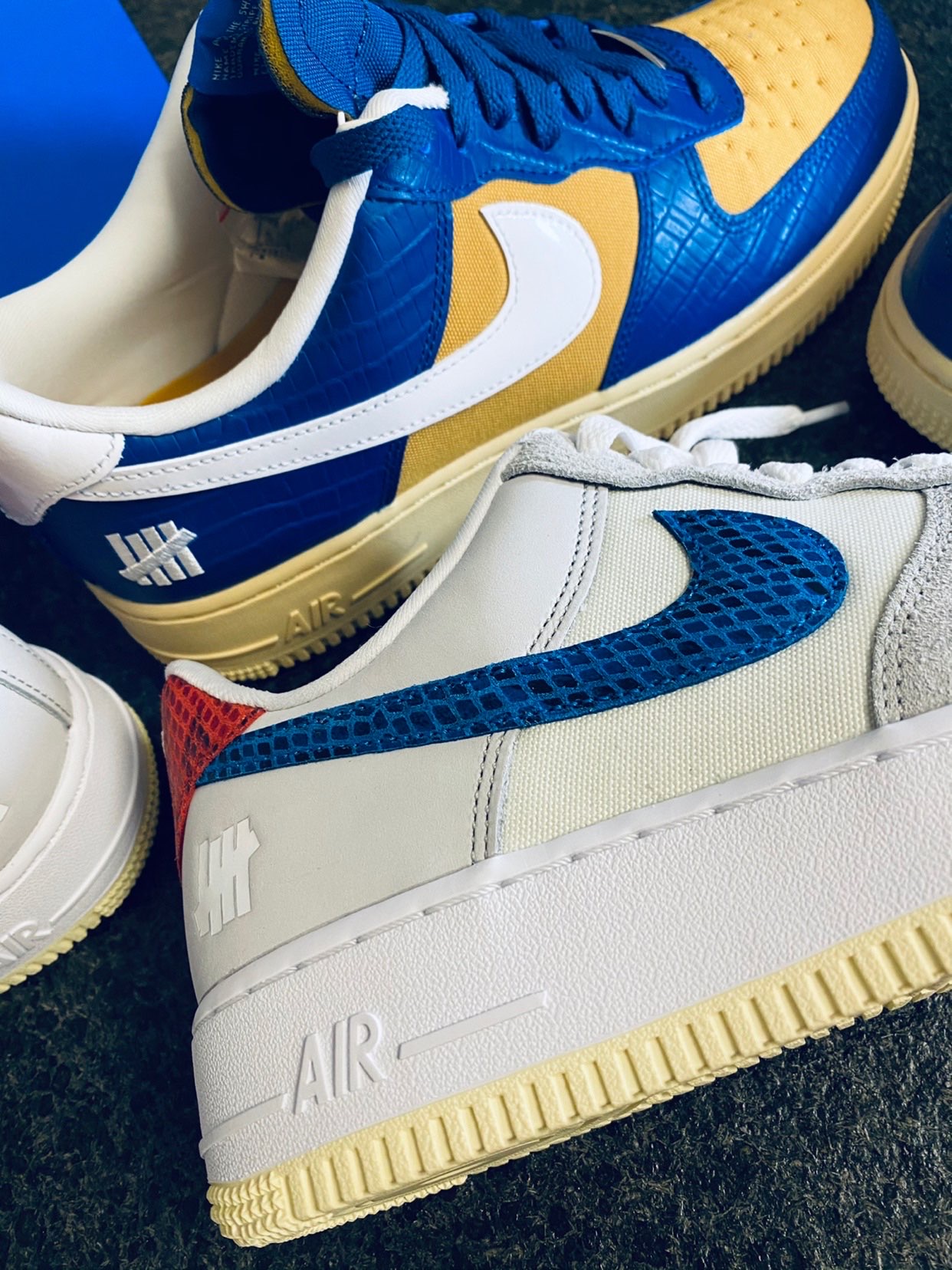 👟鞋款名称: Undefeated x Nike Air Force 1 Low SP "5 On It" 蓝黄 鳄鱼纹&灰蓝红 蛇纹 ⚡️设计细节: 作为突出重新定义了“5 ON IT”设计思路的第三双AF1,设计理念同样是源于Undefeated品牌“五道杠”Logo,在这双球鞋上融入了五种独特材料,融合形成了这双球鞋。 1⃣️蓝黄款: 鞋头和鞋身大部分采用了鳄鱼纹路蓝色皮质、鞋面和鞋身内侧为...