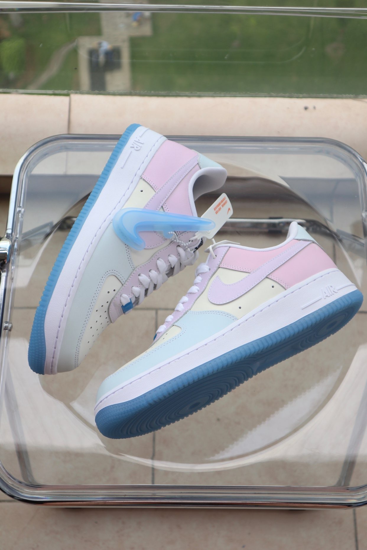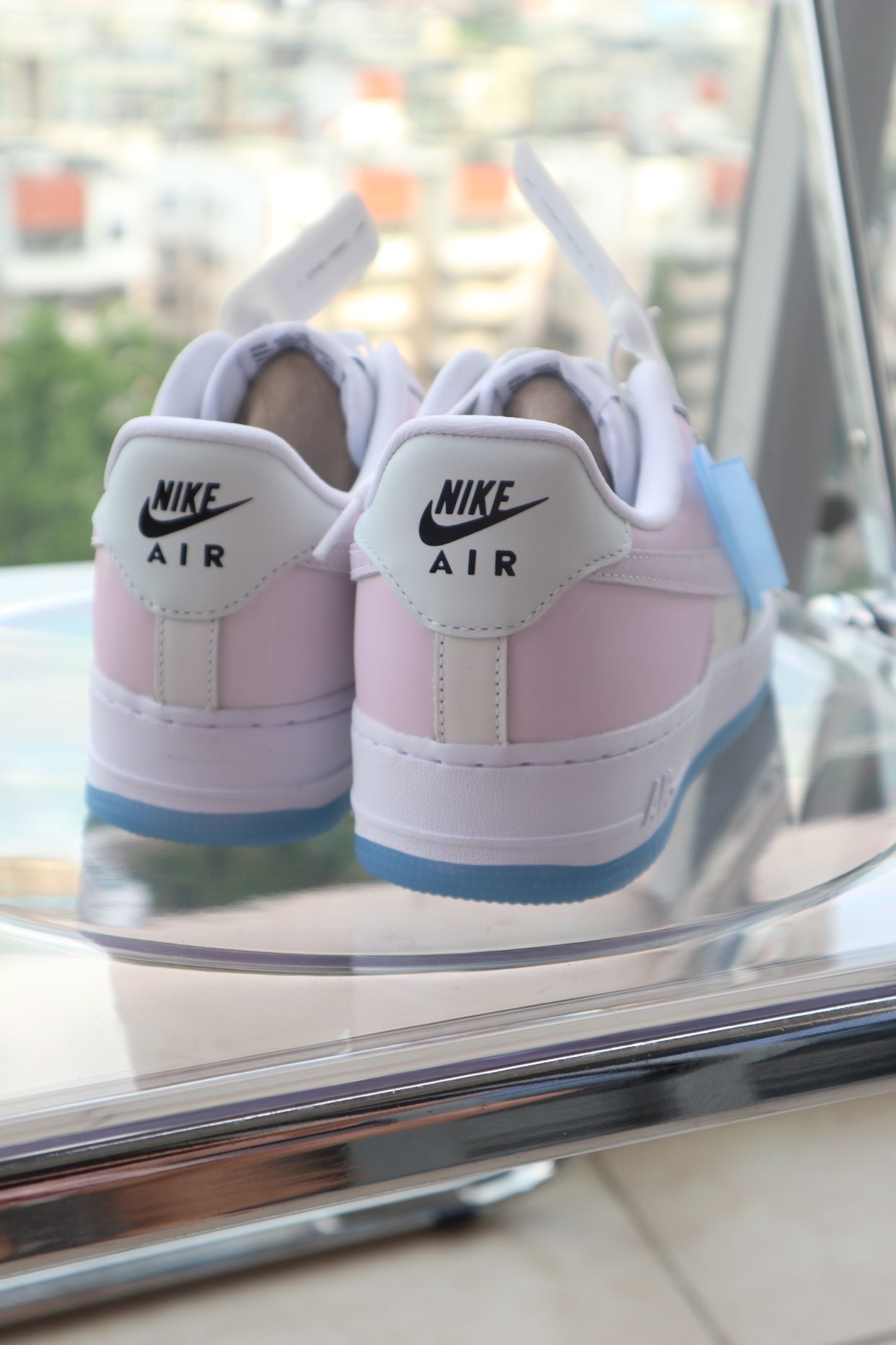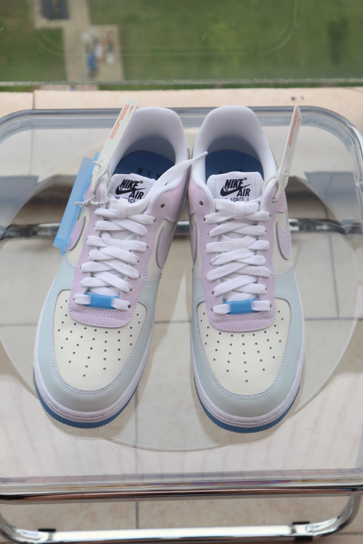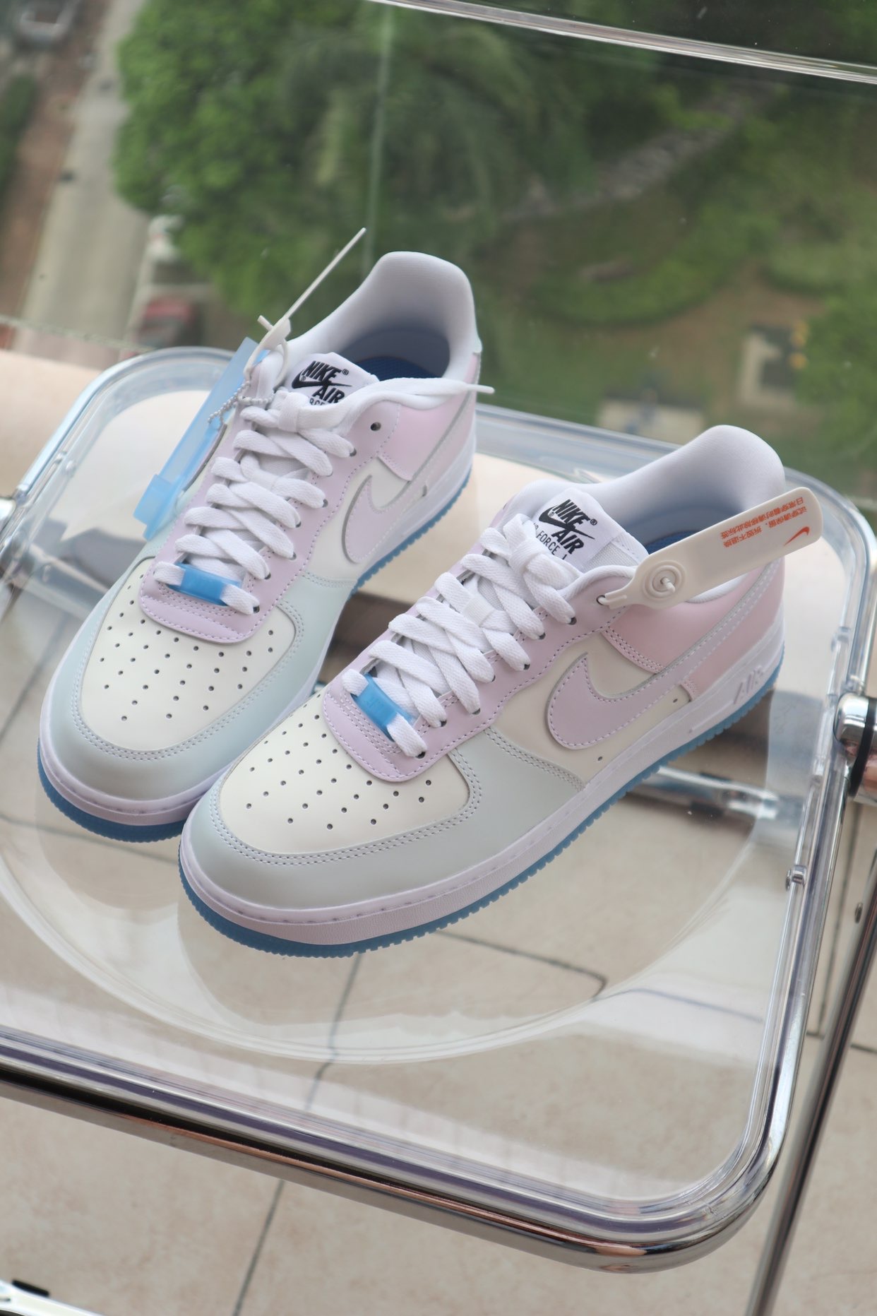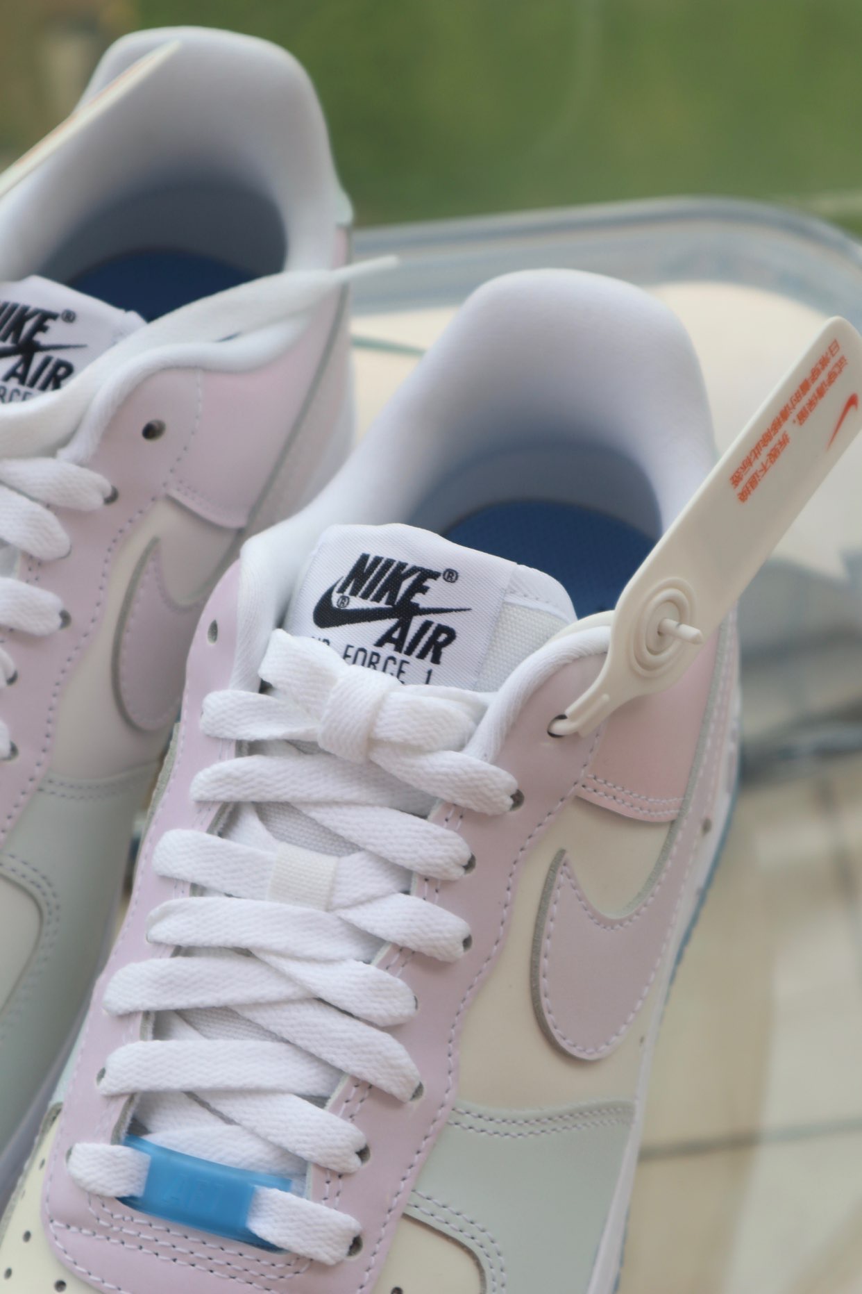 👟鞋款名称 Nike Air Force 1'07 LX "Photochromic" 女款 白蓝粉 热感应 👀设计细节 热感材料一直很受鞋友们欢迎高科技材料与鞋子的结合 总能给到鞋友们奇特的视觉体验这款热感应也是让很多鞋友称赞 纯白AF1白色鞋面运用了质感更好的荔枝皮铭牌及鞋底同样是半透明的冰蓝色相互呼应视觉的效果也是非常的nice 原本白色的鞋面在阳光下受热就会改变颜色 蓝色的水晶...