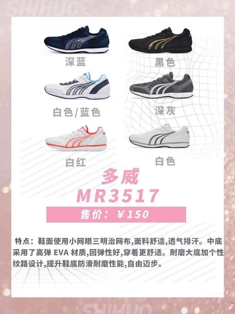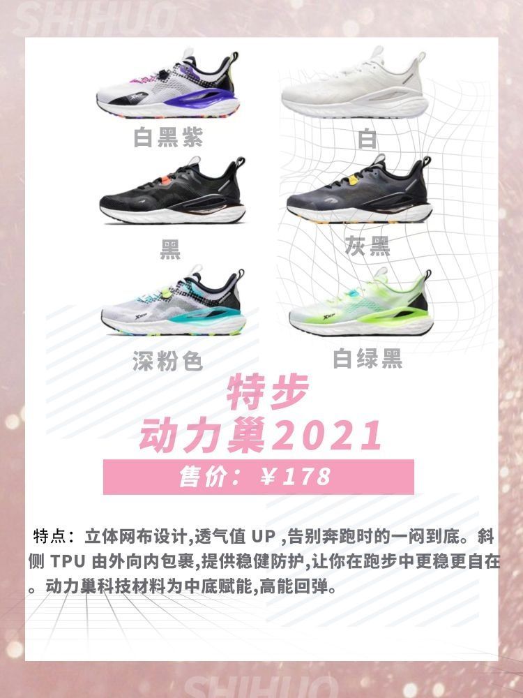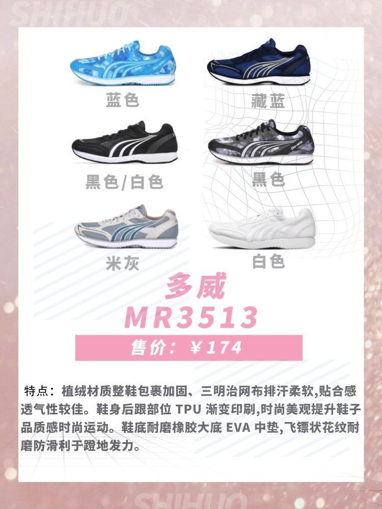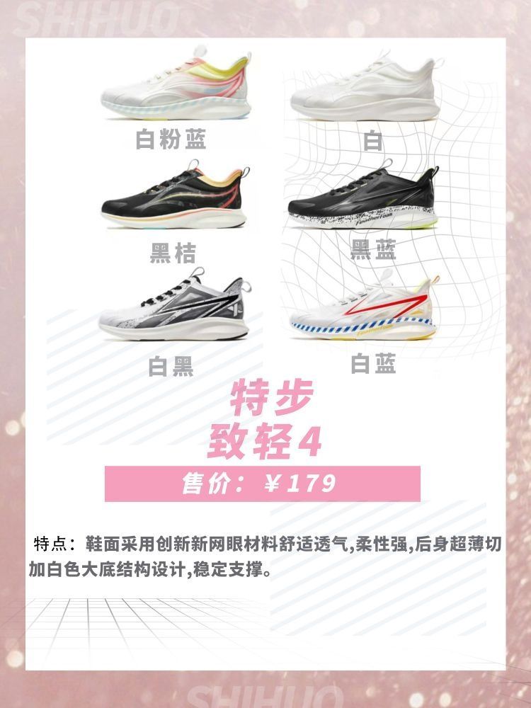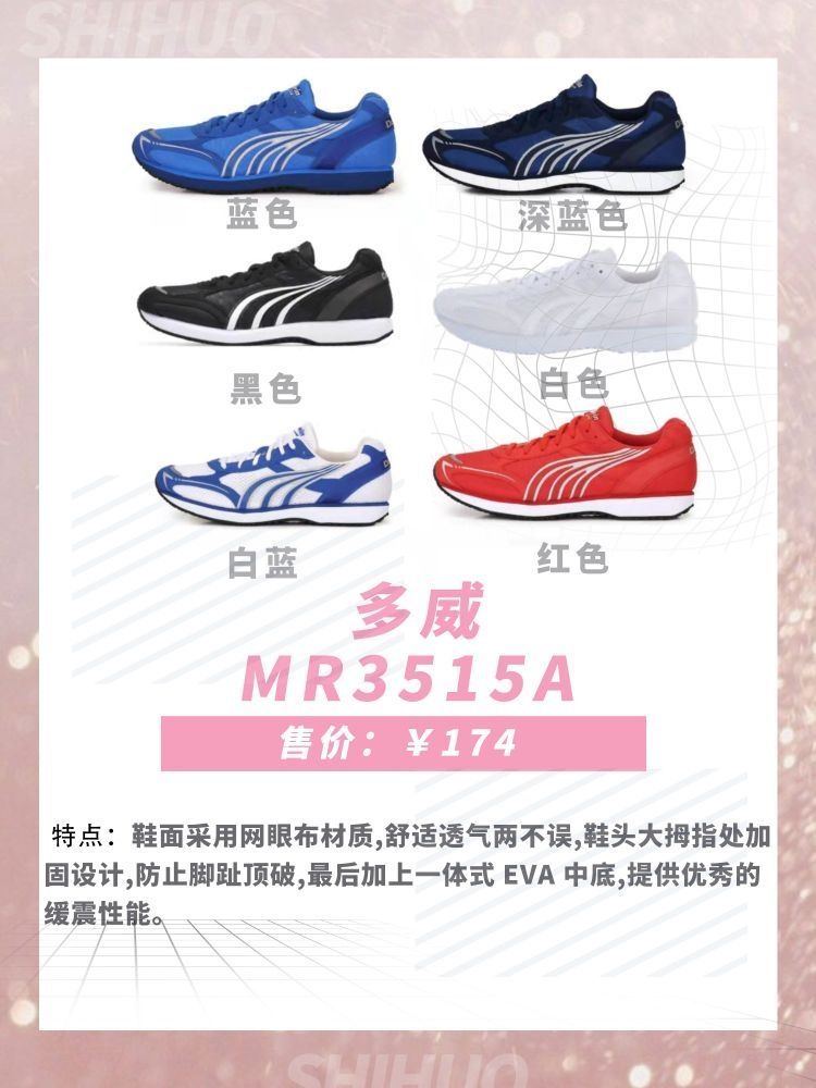 1.特步致轻4 鞋面采用创新新网眼材料舒适透气,柔性强,后身超薄切加白色大底结构设计,稳定支撑。 2.特步动力巢2021 立体网布设计,透气值 UP ,告别奔跑时的一闷到底。斜侧 TPU 由外向内包裹,提供稳健防护,让你在跑步中更稳更自在。动力巢科技材料为中底赋能,高能回弹 3.多威MR3517 鞋面使用小网眼三明治网布,面料舒适,透气排汗。中底采用了高弹 EVA 材质,回弹性好,穿着更舒适。耐磨...