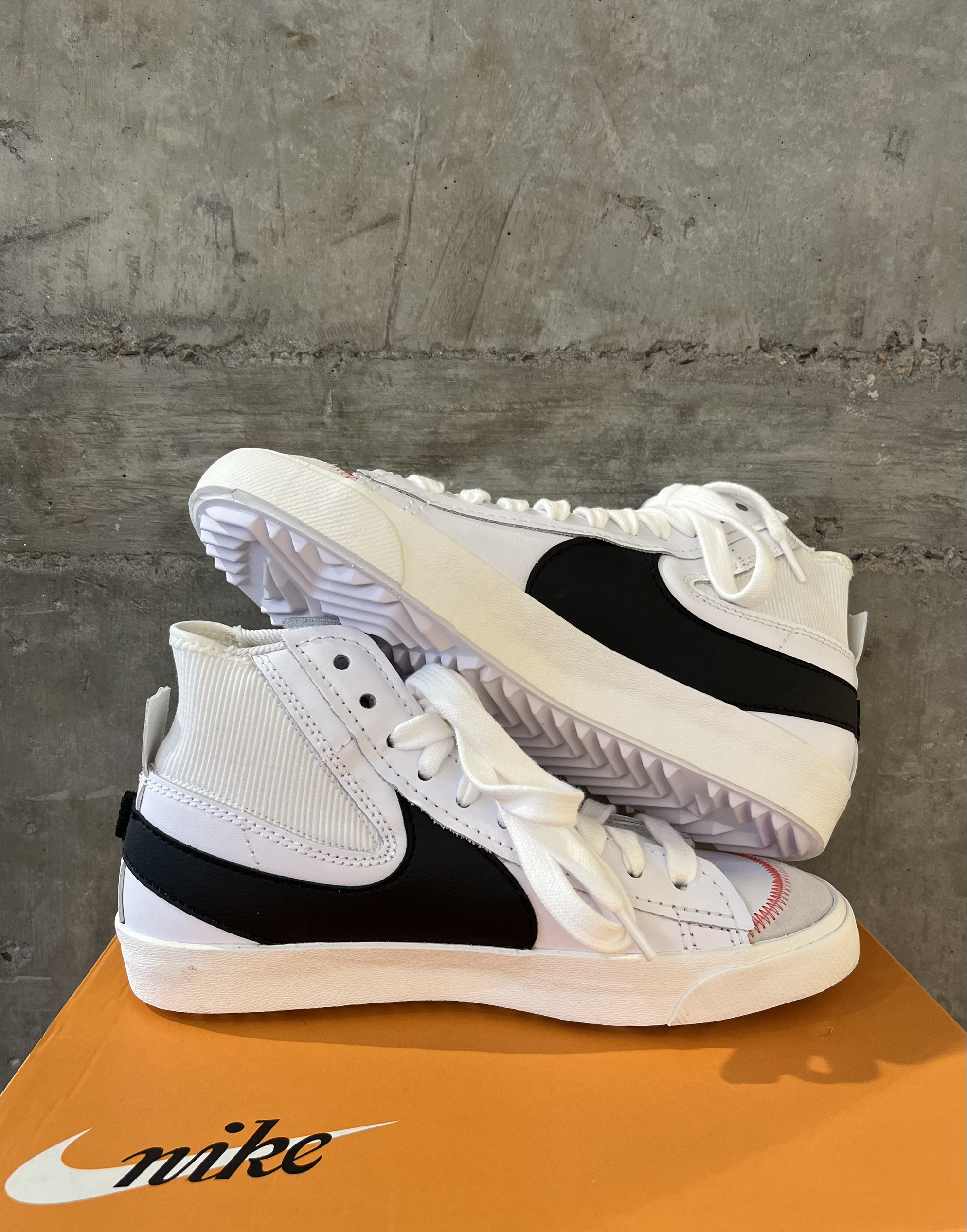 ❓大家对Blazer开拓者这个鞋款的印象是怎么样的呢?比如:好看但是太硬了、经典百搭但是看得有点疲劳了。 ✔️这次的Blazer板鞋全新升级,鞋型和脚感上带来了全新体验,而且外型很酷,甚至有了OW联名的高级感。 👟Nike Blazer Mid '77 Jumbo 复古休闲板鞋 白黑 解构 🤩白色主色调,夸张的大钩子设计,外侧连接后跟到内侧,外露式海绵鞋舌🧽,鞋头和后跟加入了缝线设计,增强了独特解...