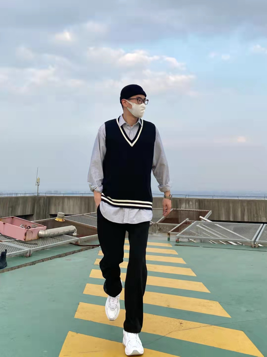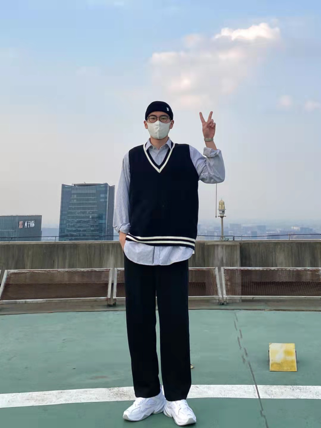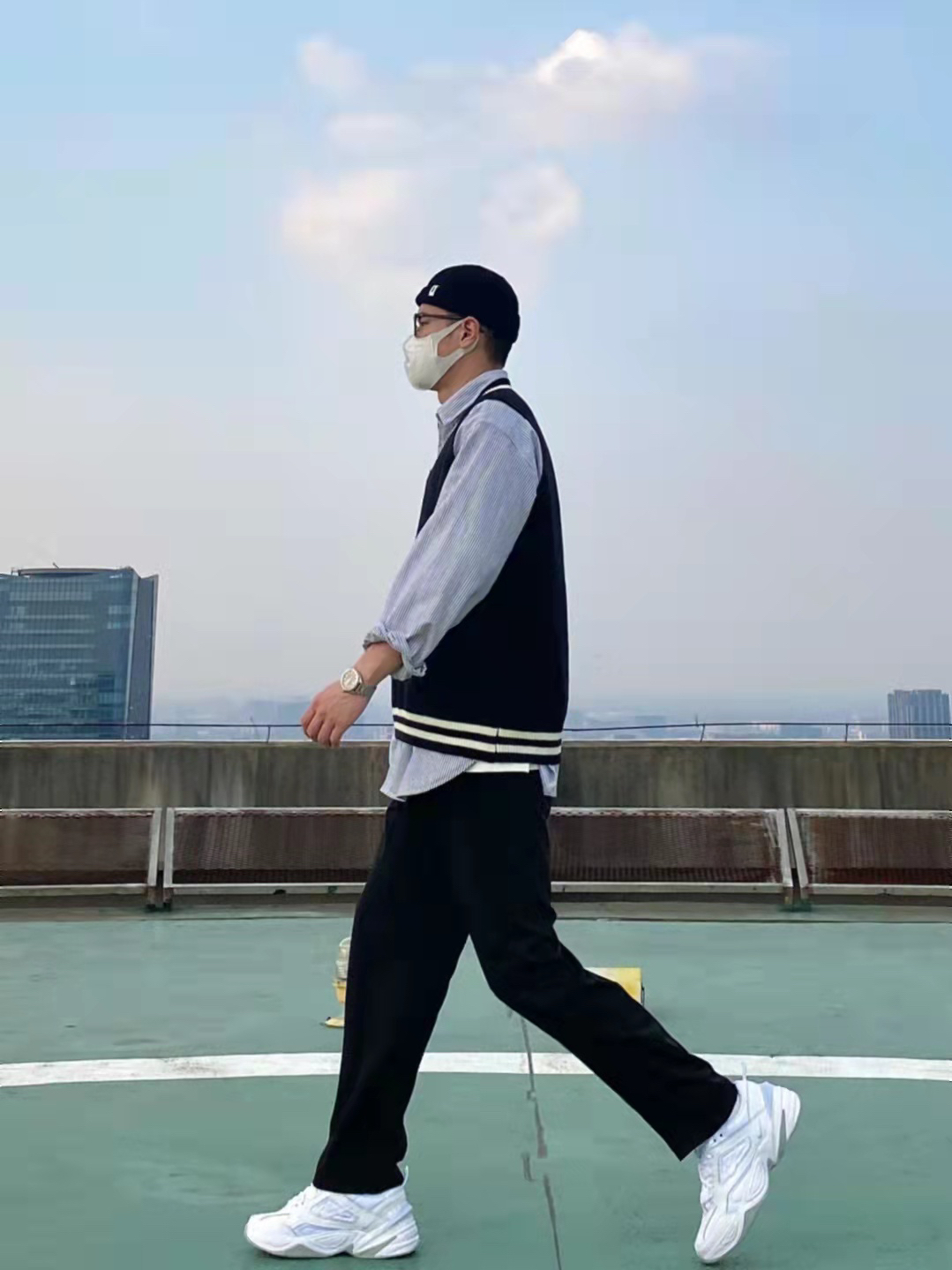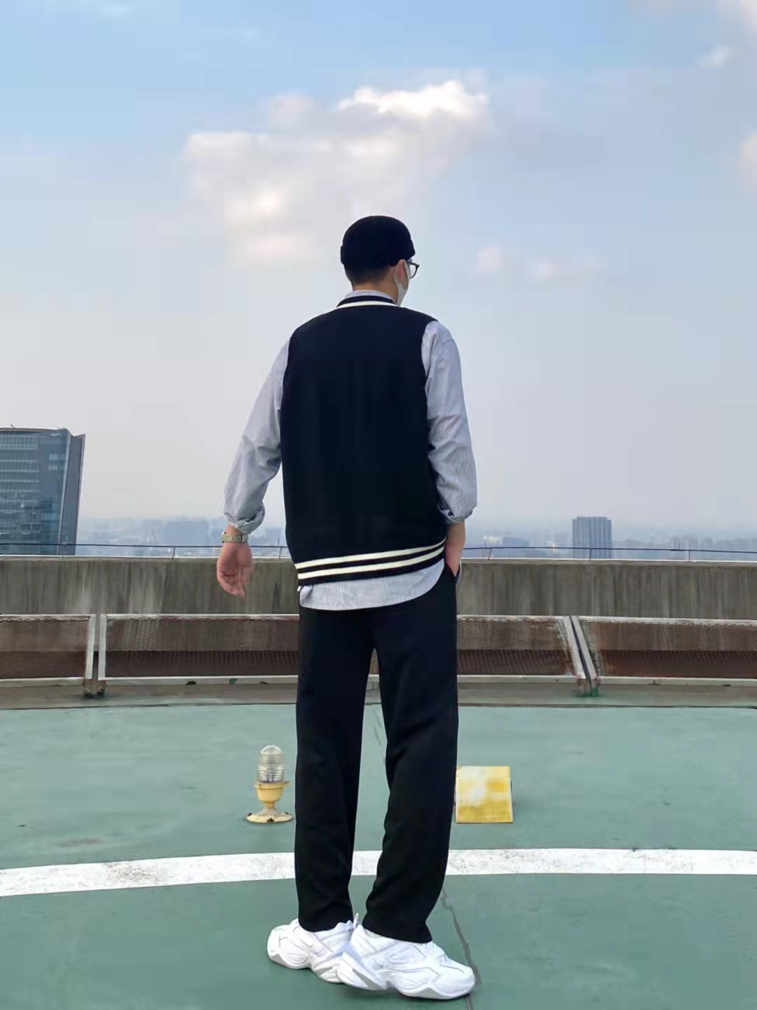 今天这套先用宽松阔版的灰色条纹衬衫做内搭,裤子选择显腿长的直筒垂感西装裤。鞋子上脚百搭舒适的纯白色Nike老爹鞋,最重要的的是增高效果还没很明显️。接着套上黑白拼色的韩版V领毛衣马甲,最后戴一顶黑色线帽呼应下裤子的颜色,OK,出门看看搭配效果吧! - 衣服裤子都来自:NICE LILI 鞋子:NIKE M2K