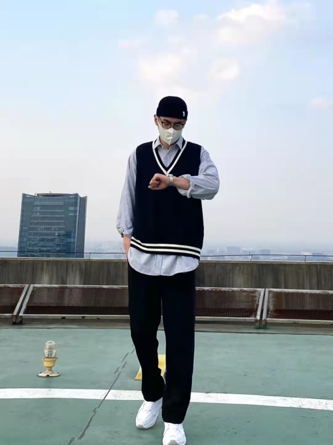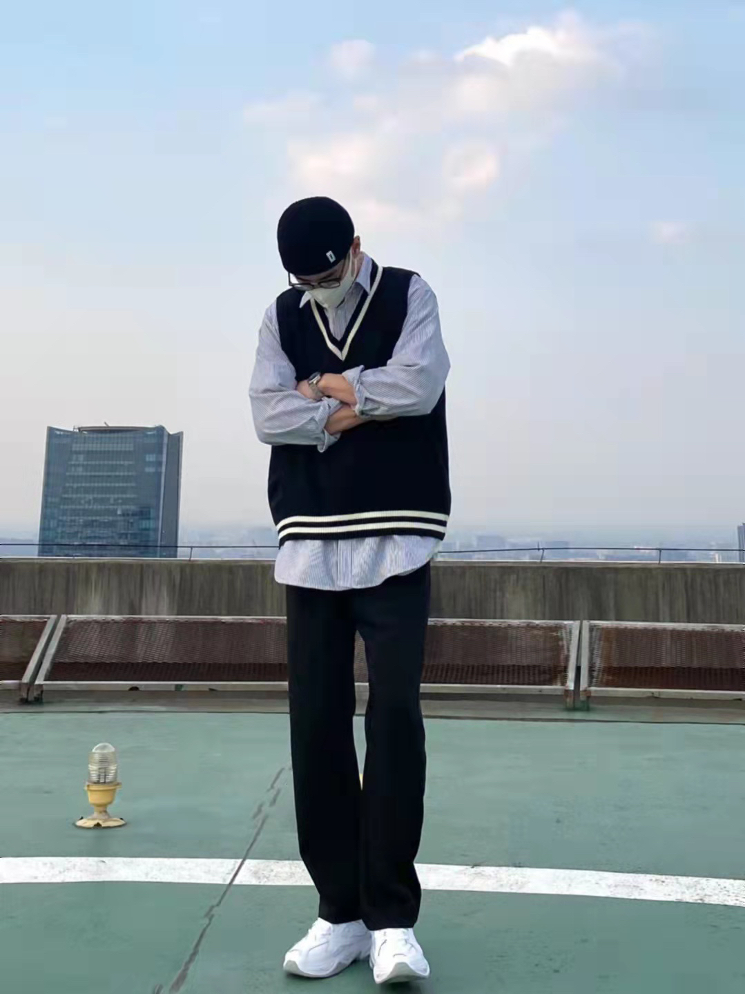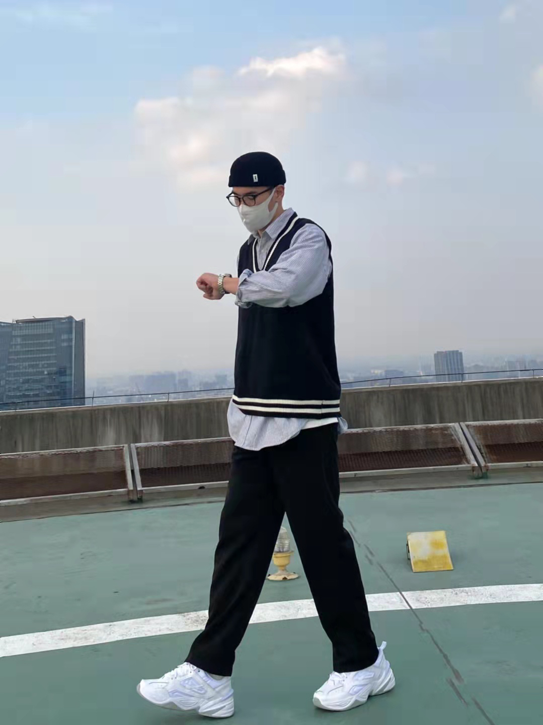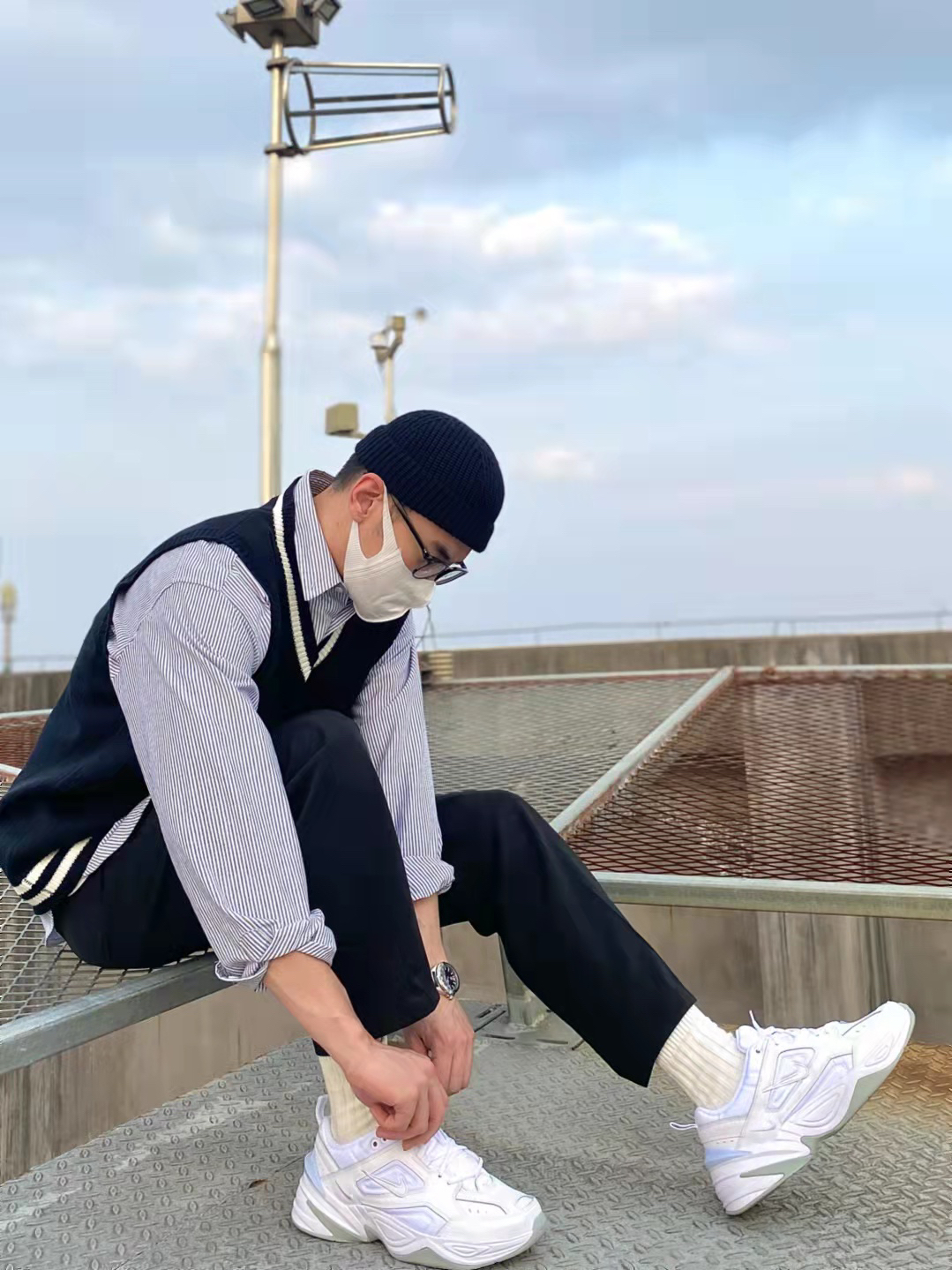 今天这套先用宽松阔版的灰色条纹衬衫做内搭,裤子选择显腿长的直筒垂感西装裤。鞋子上脚百搭舒适的纯白色Nike老爹鞋,最重要的的是增高效果还没很明显️。接着套上黑白拼色的韩版V领毛衣马甲,最后戴一顶黑色线帽呼应下裤子的颜色,OK,出门看看搭配效果吧! - 衣服裤子都来自:NICE LILI 鞋子:NIKE M2K