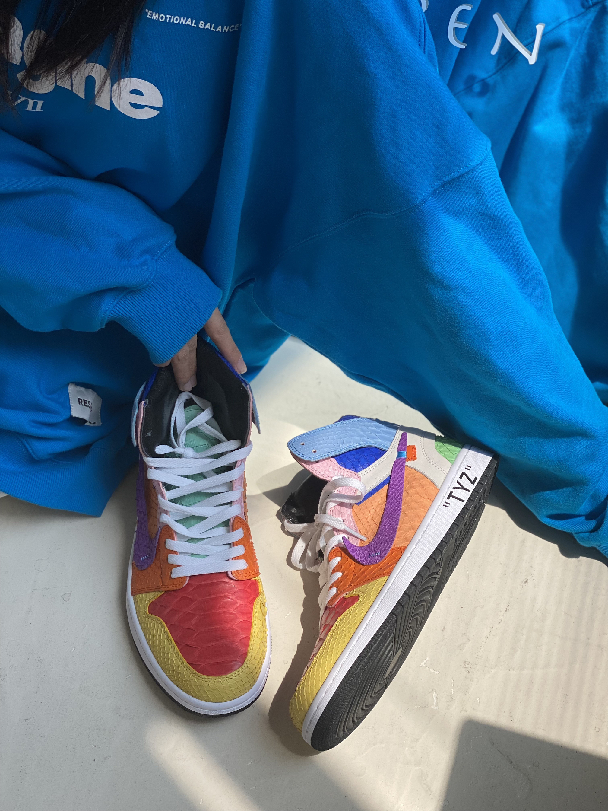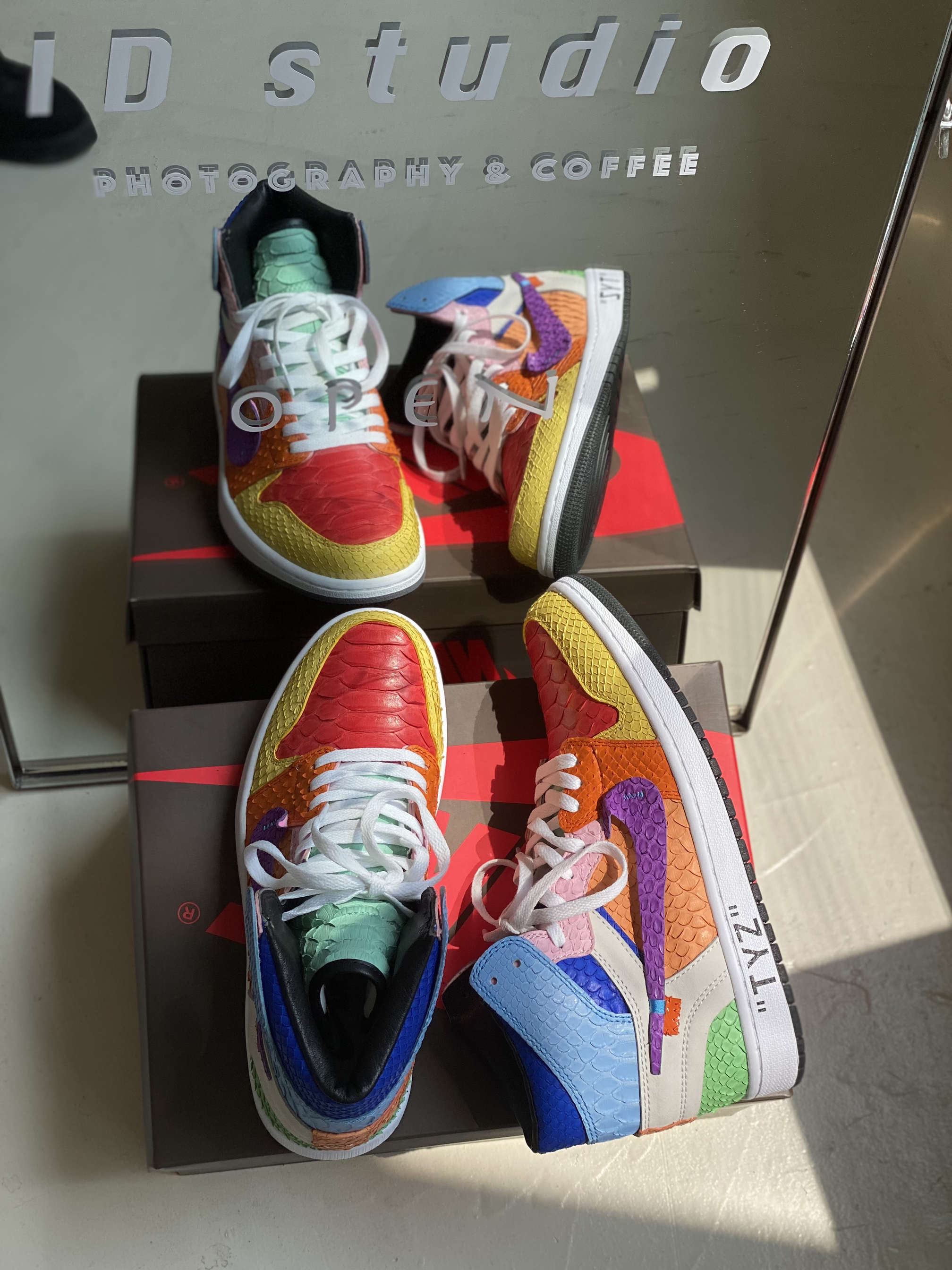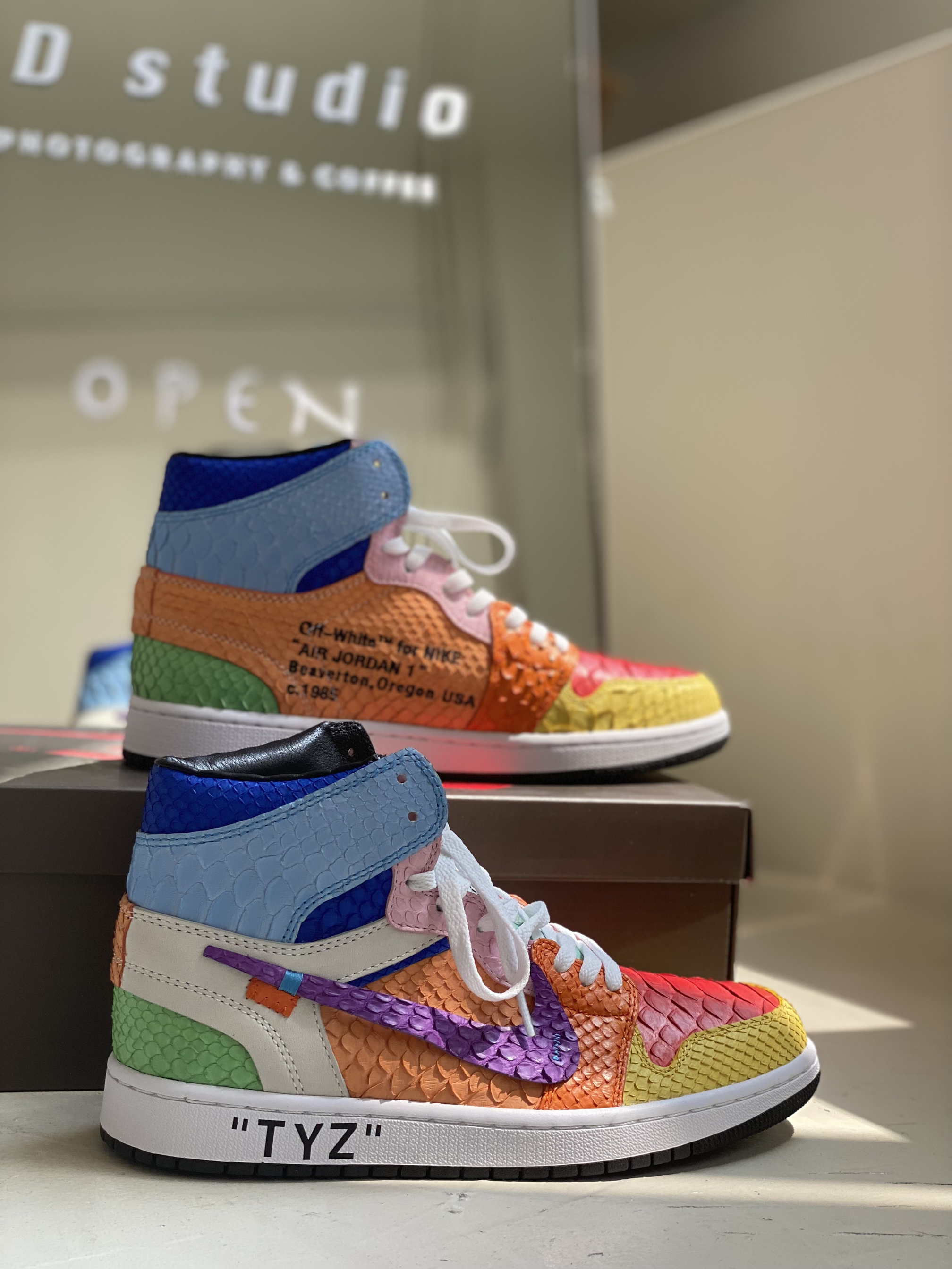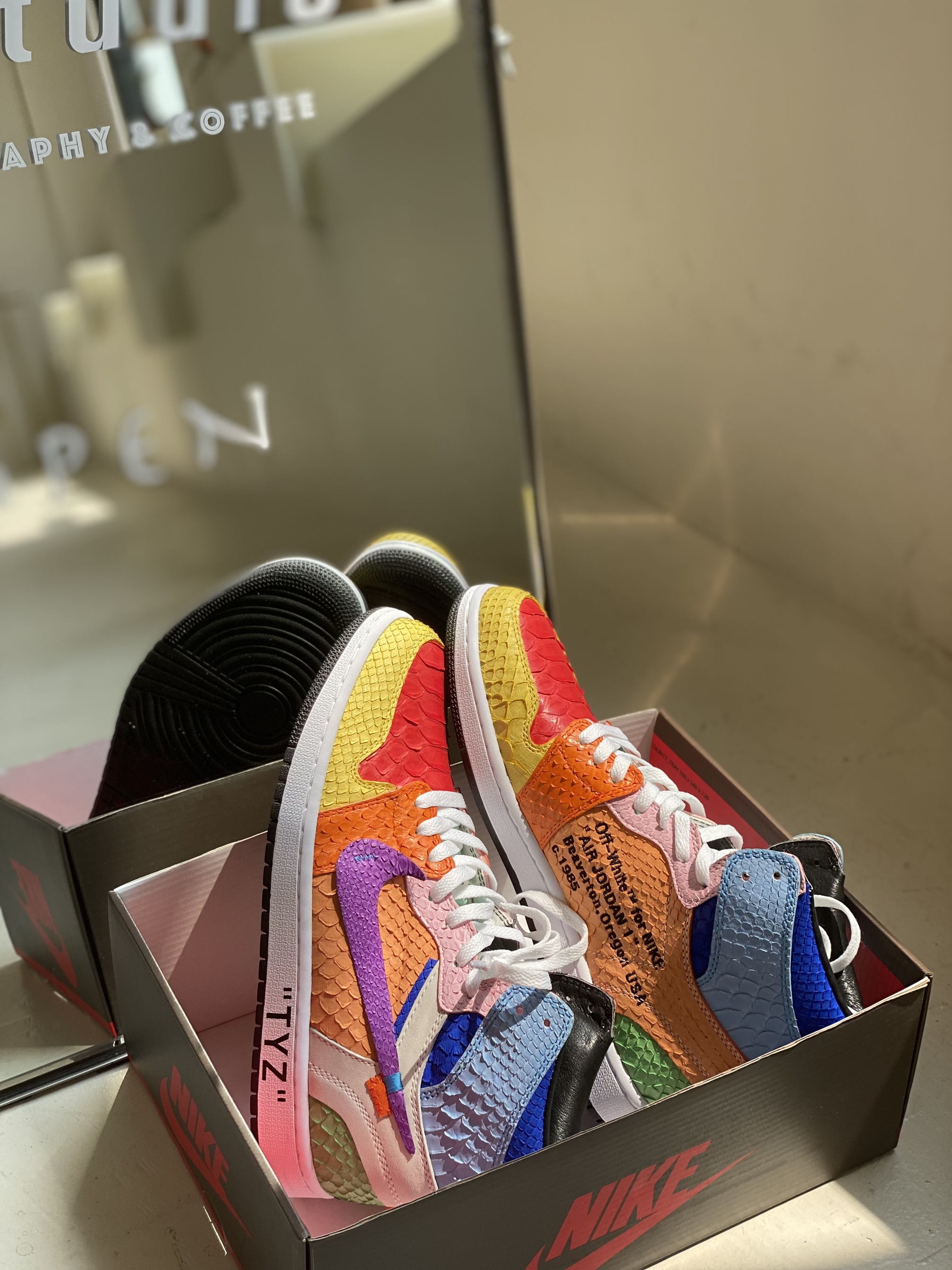 客制款全蟒蛇皮太阳花,致敬村上隆😃 今天是一个值得纪念的日子,等了这么久的鞋子终于到手,迫不及待的打开后,真是无比好看,该有的细节都有了。 对球鞋的热爱已经到了痴迷的境地,只要是喜欢的就想拥有,不知道有多少人和我一样,为了一对鞋子吃一个月馒头咸菜哈哈😃