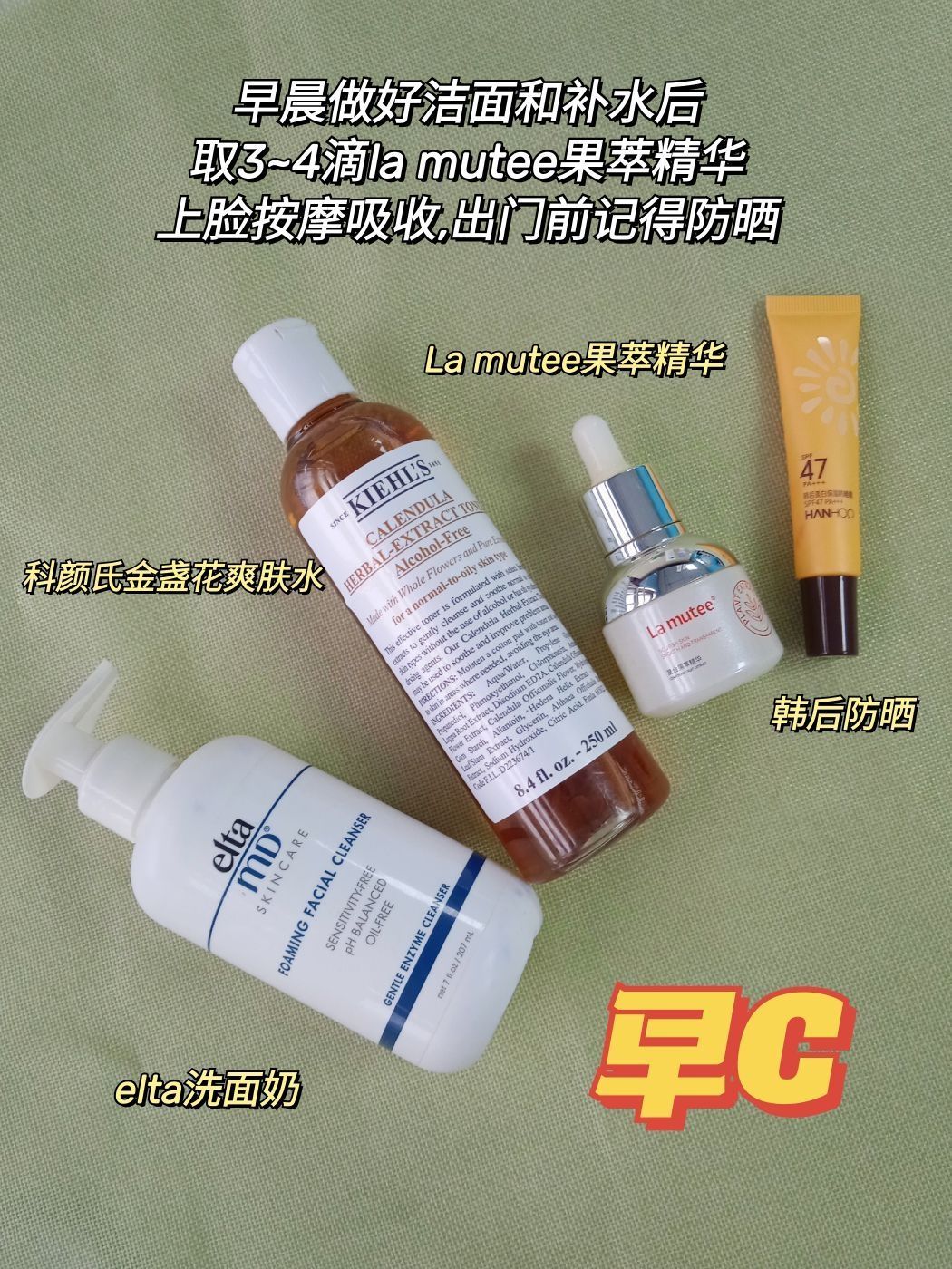 以前在脸上堆了很多护肤品,脸是白了但是摸着还是比较粗糙,脑门有闭口,下巴经常冒痘 但是!我才用了早c晚a大概20多天的时候,耐受逐渐建立起来以后! 脸上肉眼可见的闭口没有了!肤色更均匀了,也不爆痘了,脸也更嫩了,真的很绝! 要问什么护肤方法我可以用一辈子,必定是早c晚a 1、早C Elta洁面乳+科颜氏爽肤水+La mutee果萃精华+防晒 混油皮的我早上一般都会用洗面奶清洁洗脸,接着基础护肤滴...