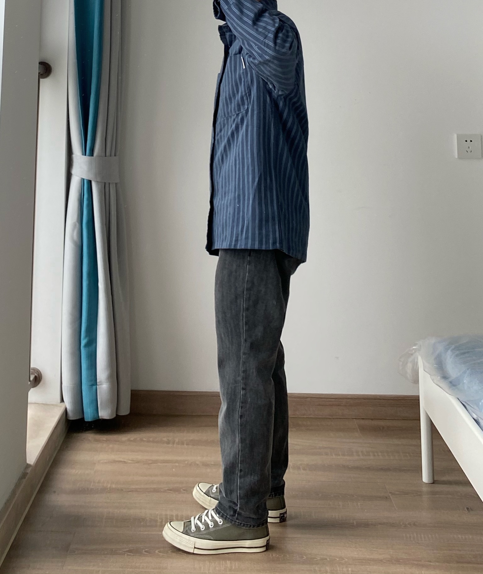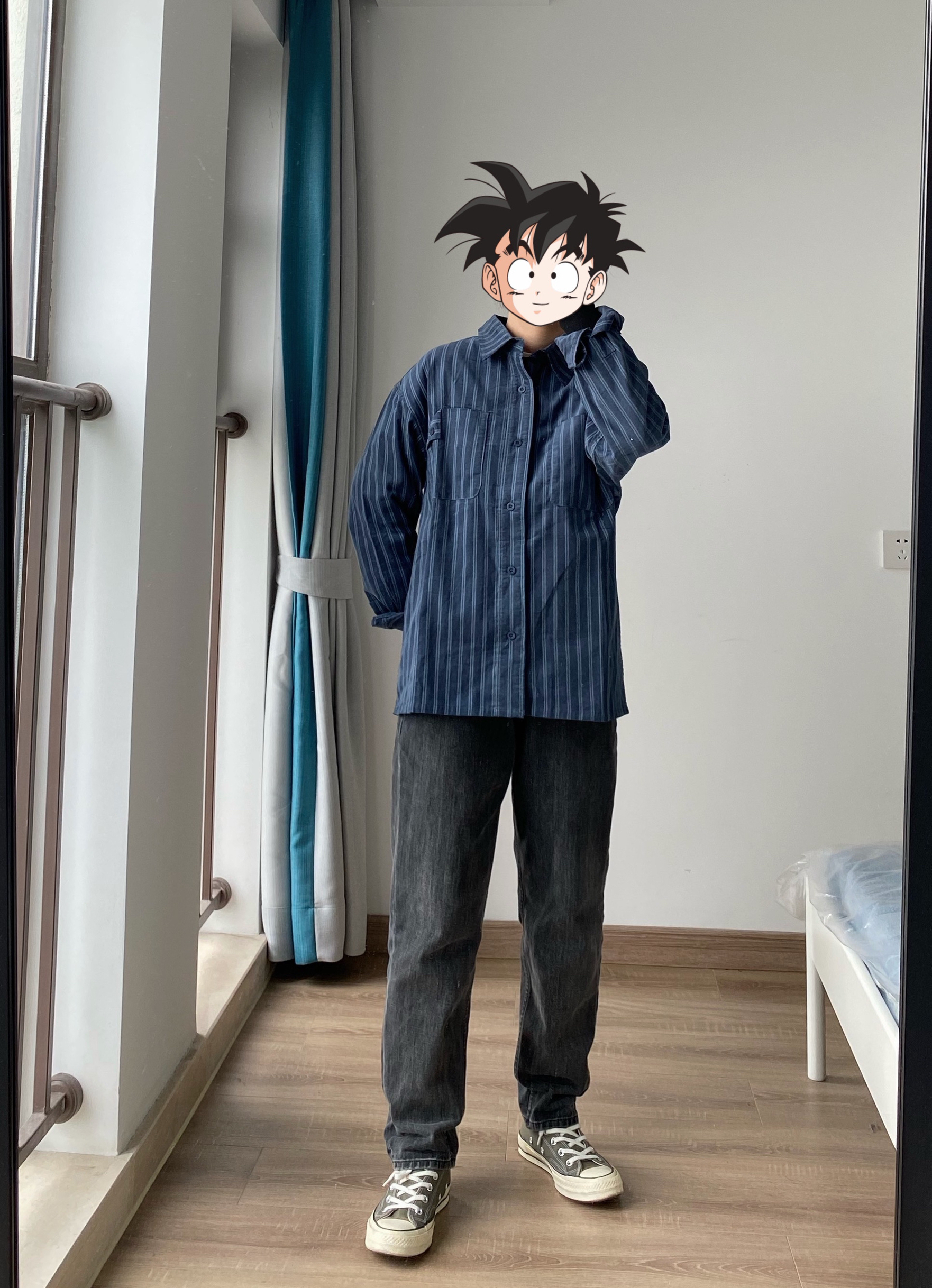 分享一款秋冬可以做内搭的磨毛条纹衬衫 👔:PIOXLEON兔先森的原创小铺 👖:黑灰色小脚牛仔裤在白告studio 👟:匡威Converse 1970s军绿色低帮(万年百搭款)便宜好穿