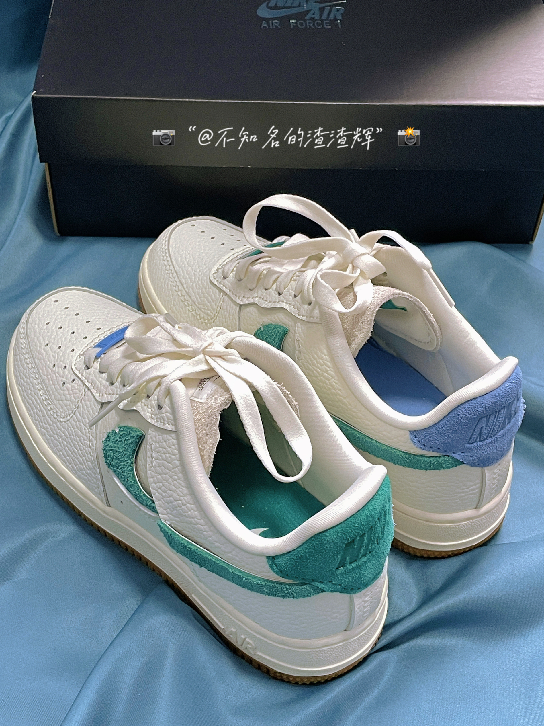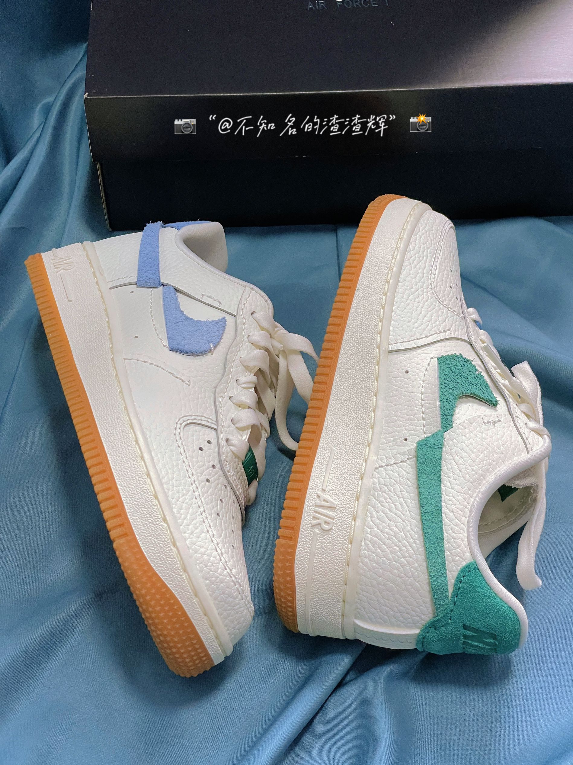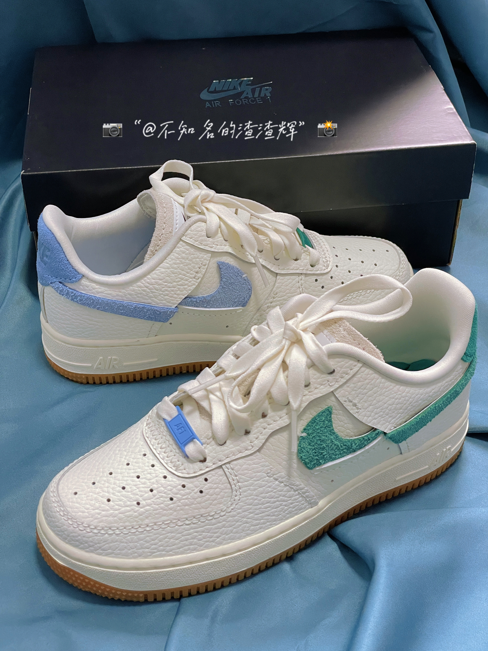 🎁:Nike Air Force 1 Vandalized 女款 解构 断钩 蓝绿鸳鸯 🎁:这双空军一号鞋身采用了米白色合成革材质荔枝纹纹路,Swoosh采用了翻毛皮鸳鸯解构设计,外侧采用绿色内侧采用蓝色,配色超级仙女,鞋舌AF1勋章和后跟Nike 字印也是采用了鸳鸯设计,鞋头半透气设计,设计感真的细节,中底采用了Air Sole缓震气垫,越穿越舒适 🎁:适合女孩子的一款空军,空军还是比较适合...