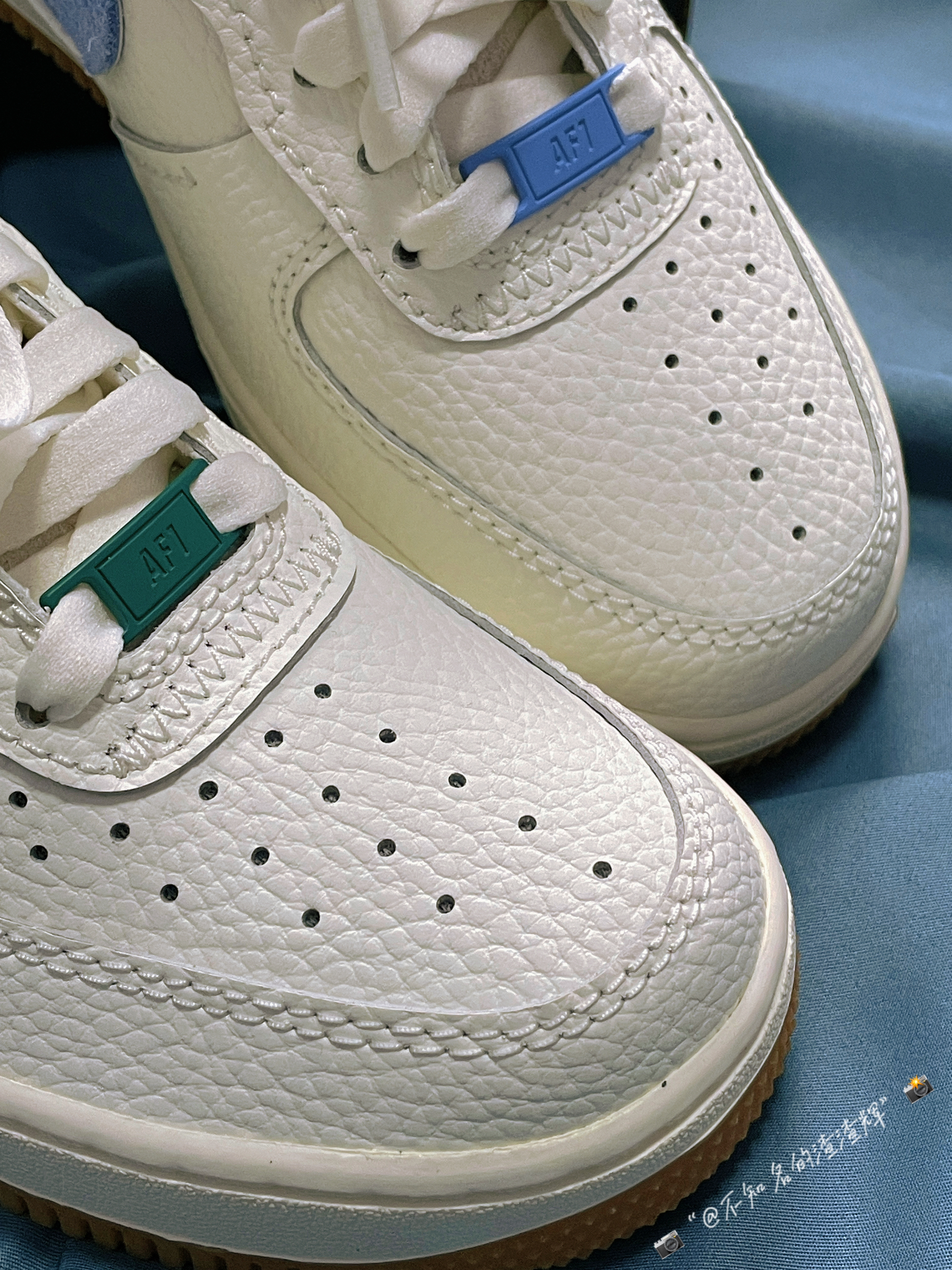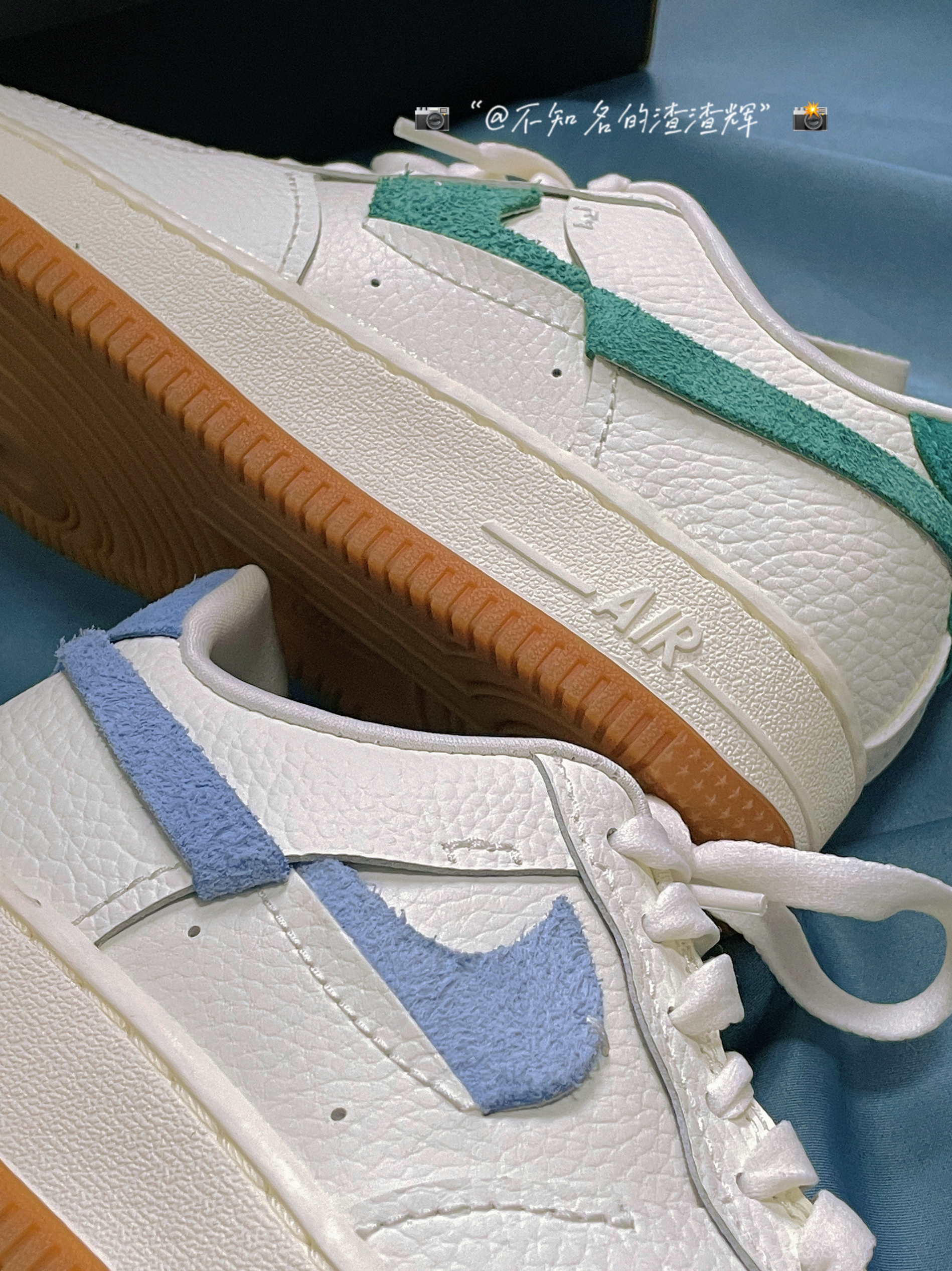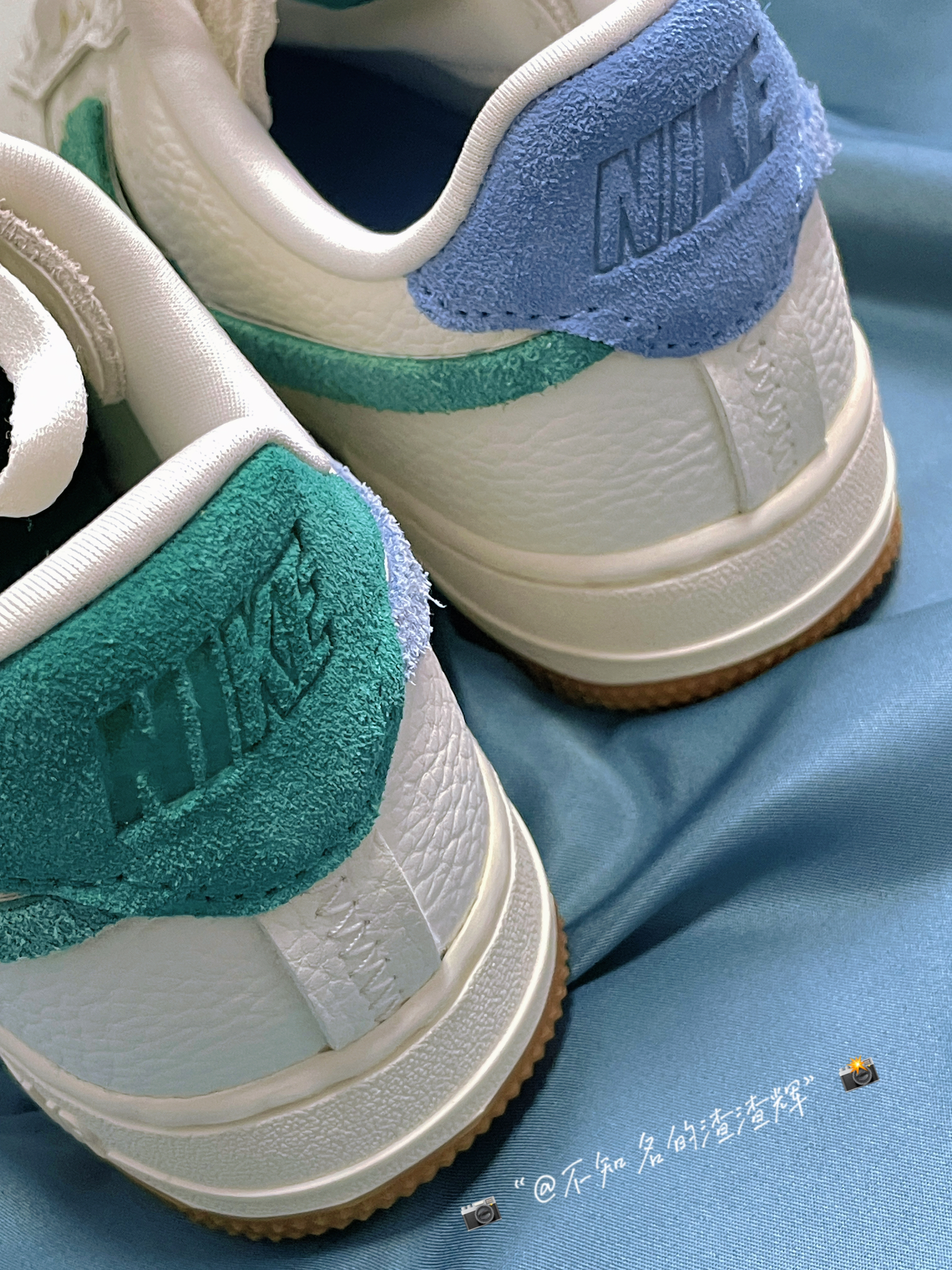 🎁:Nike Air Force 1 Vandalized 女款 解构 断钩 蓝绿鸳鸯 🎁:这双空军一号鞋身采用了米白色合成革材质荔枝纹纹路,Swoosh采用了翻毛皮鸳鸯解构设计,外侧采用绿色内侧采用蓝色,配色超级仙女,鞋舌AF1勋章和后跟Nike 字印也是采用了鸳鸯设计,鞋头半透气设计,设计感真的细节,中底采用了Air Sole缓震气垫,越穿越舒适 🎁:适合女孩子的一款空军,空军还是比较适合...