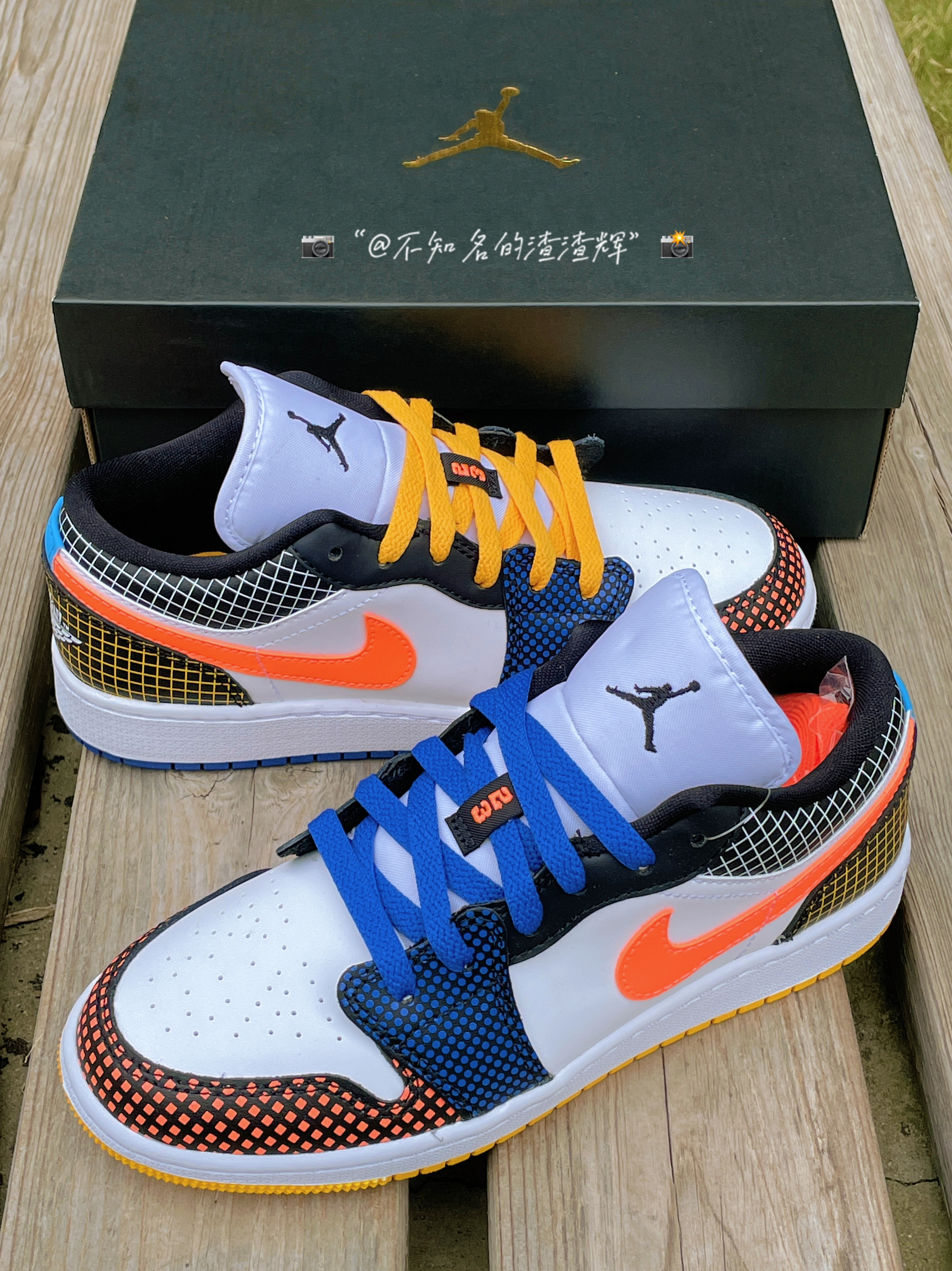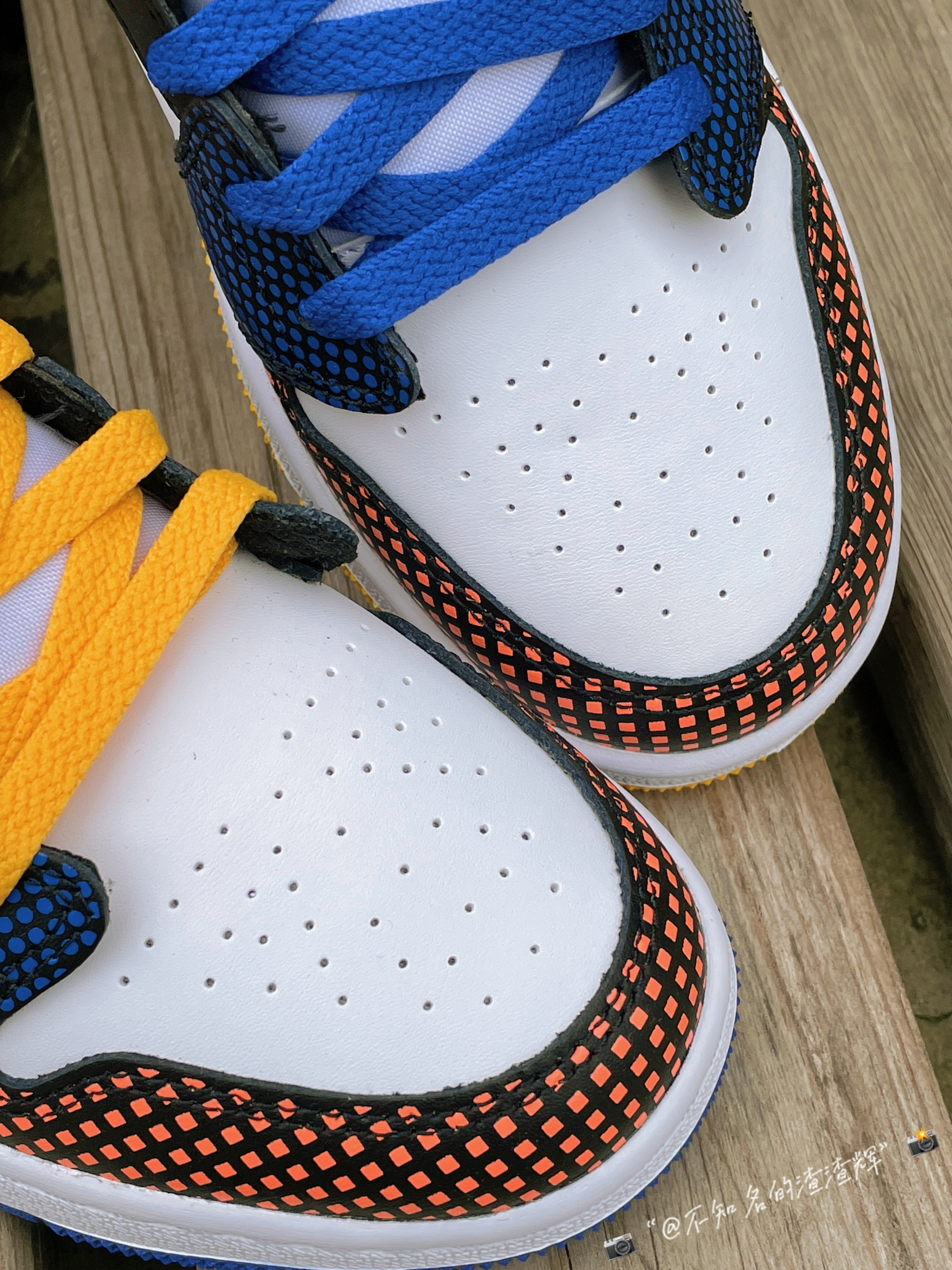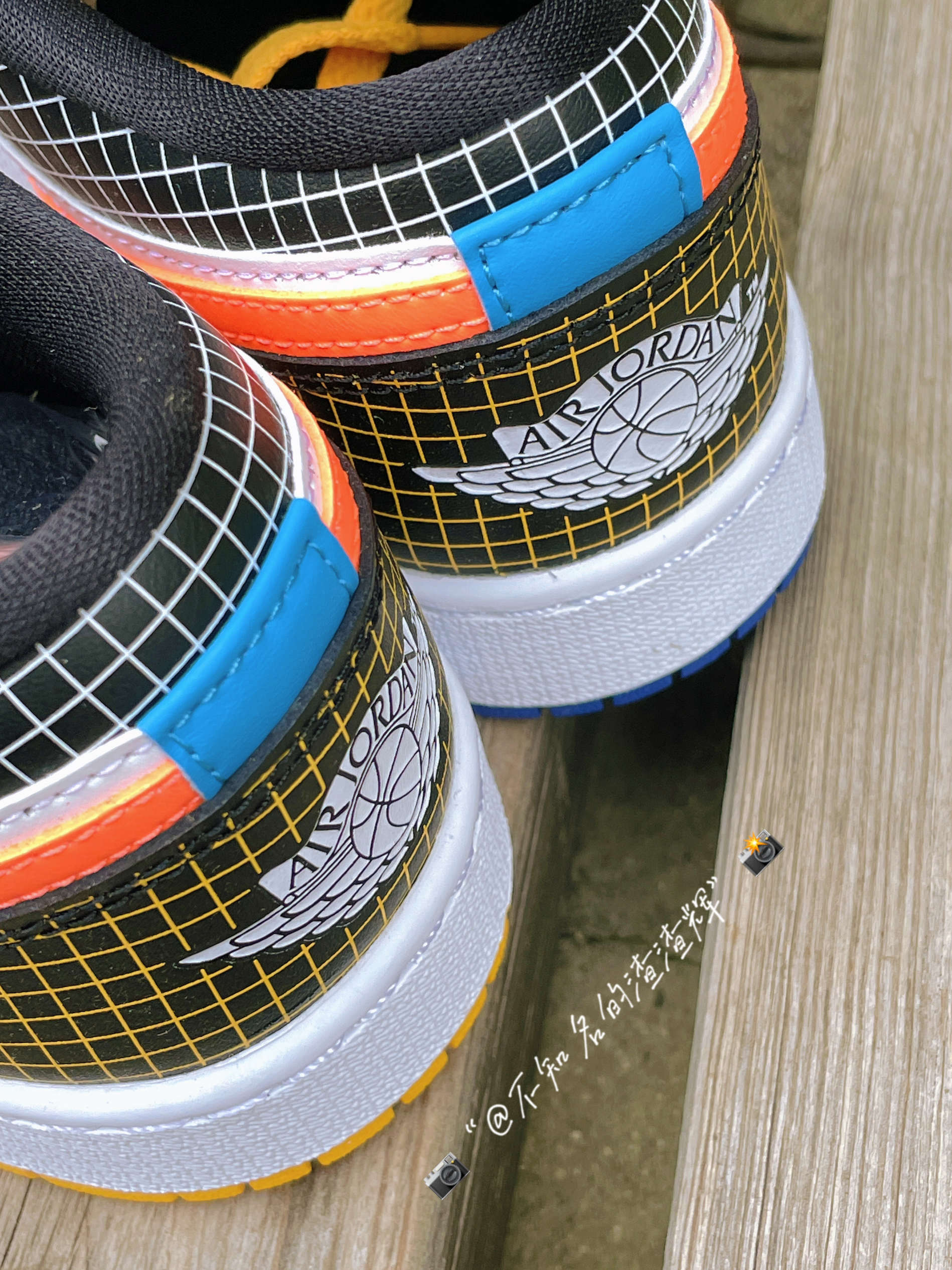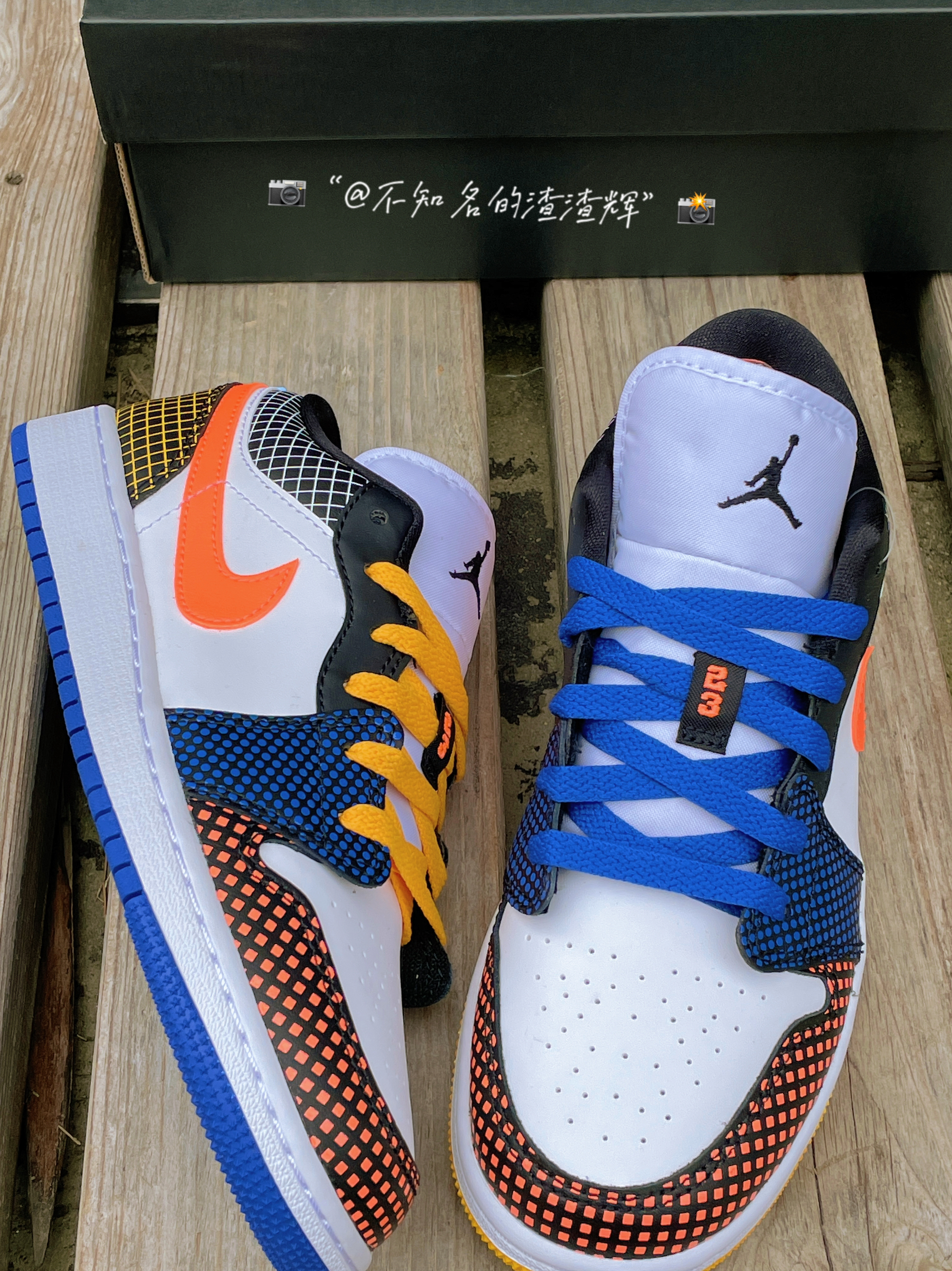 💫:Air Jordan 1 Low(GS)多彩拼接 鸳鸯 格子印花 💫:这双鞋子鞋面、鞋舌、鞋身、中底采用了白色,鞋头、后跟都是采用了网格设计,Swoosh采用了橙色,鞋带和鞋底都是采用了黄蓝鸳鸯设计,鞋舌有着乔丹飞人Logo,后跟有着飞翼Logo 💫:一款性价比不错的鞋子,适合女孩子春秋季节穿 💫:尺码推荐:正常尺码