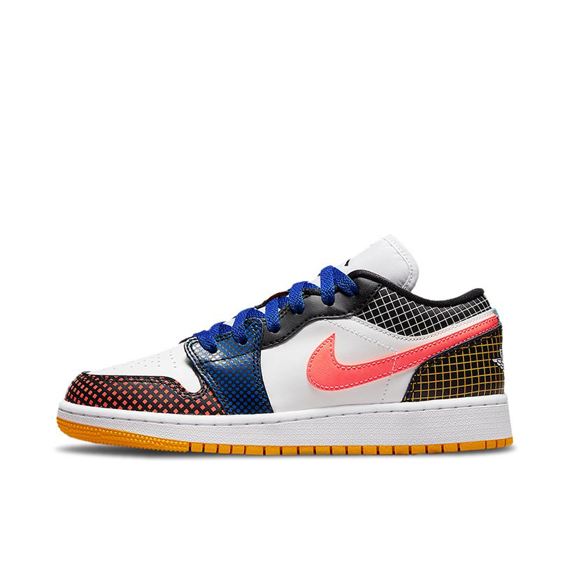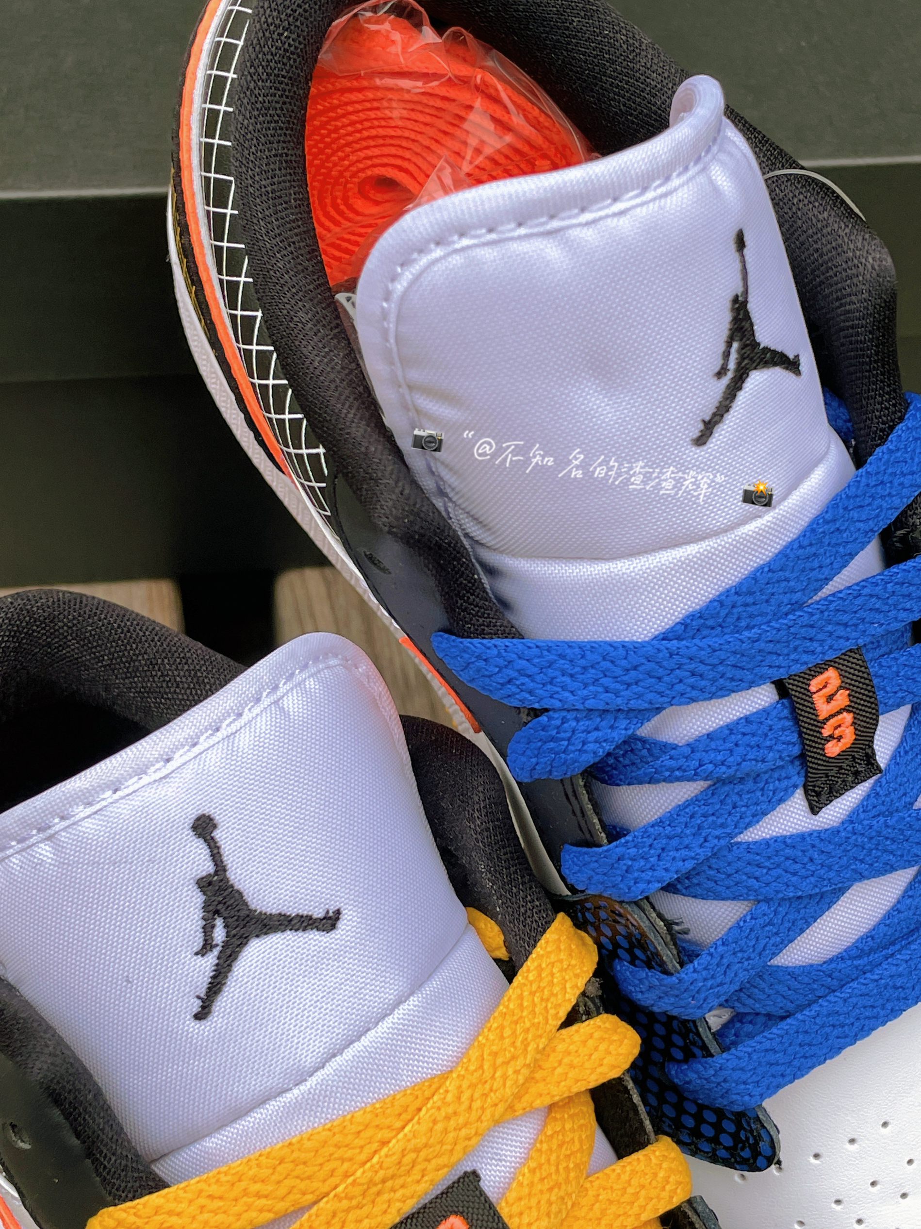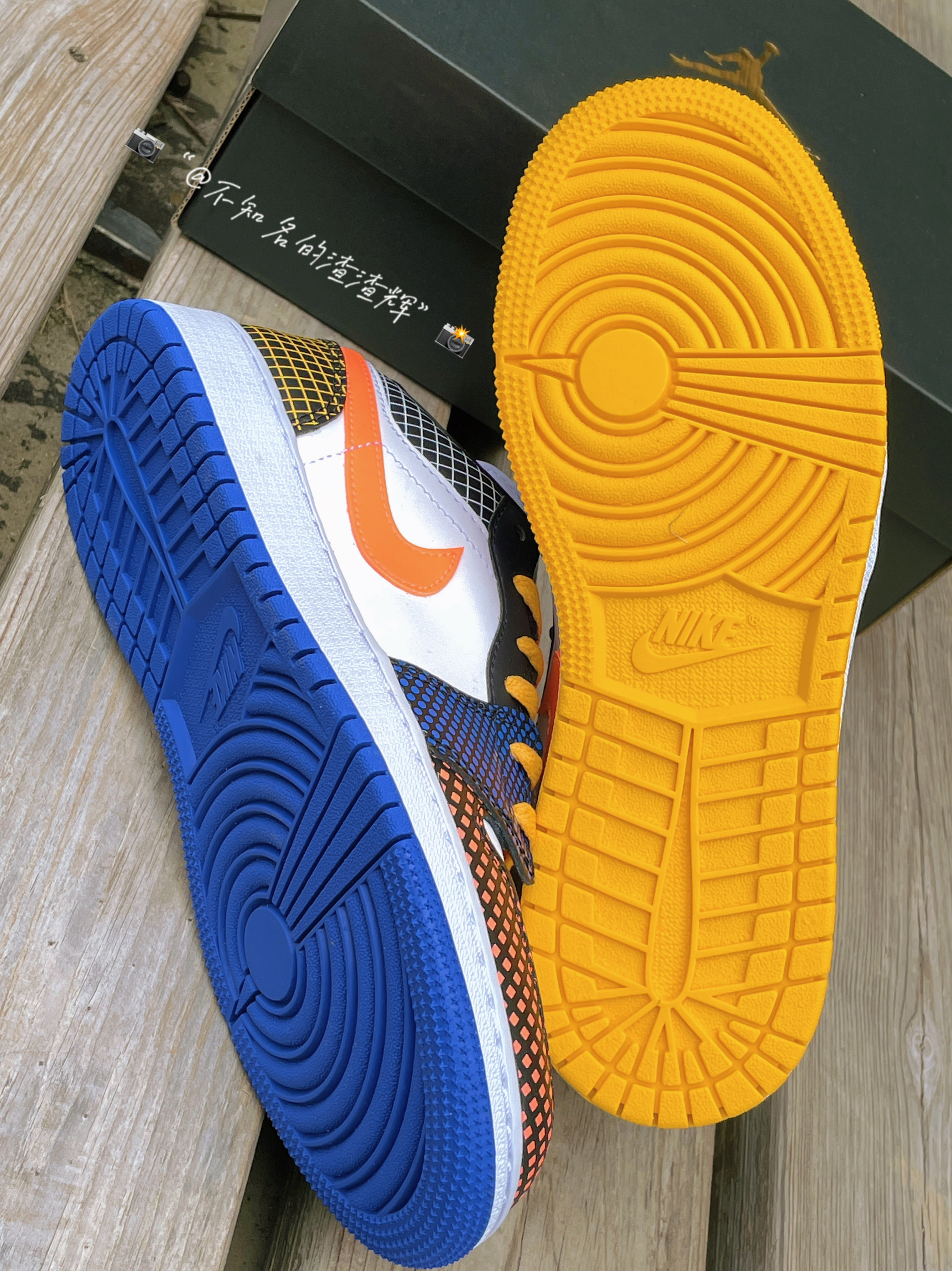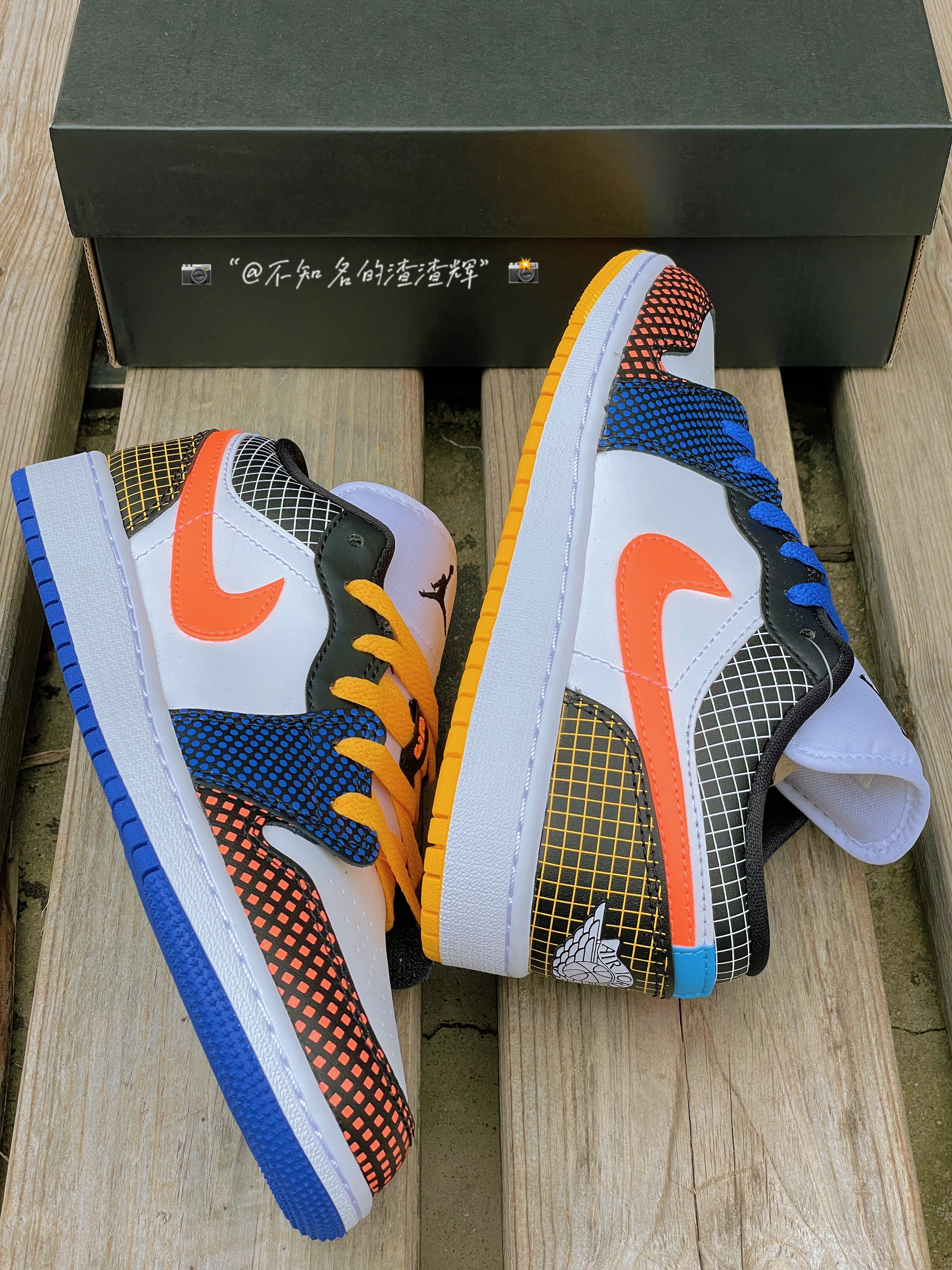 💫:Air Jordan 1 Low(GS)多彩拼接 鸳鸯 格子印花 💫:这双鞋子鞋面、鞋舌、鞋身、中底采用了白色,鞋头、后跟都是采用了网格设计,Swoosh采用了橙色,鞋带和鞋底都是采用了黄蓝鸳鸯设计,鞋舌有着乔丹飞人Logo,后跟有着飞翼Logo 💫:一款性价比不错的鞋子,适合女孩子春秋季节穿 💫:尺码推荐:正常尺码