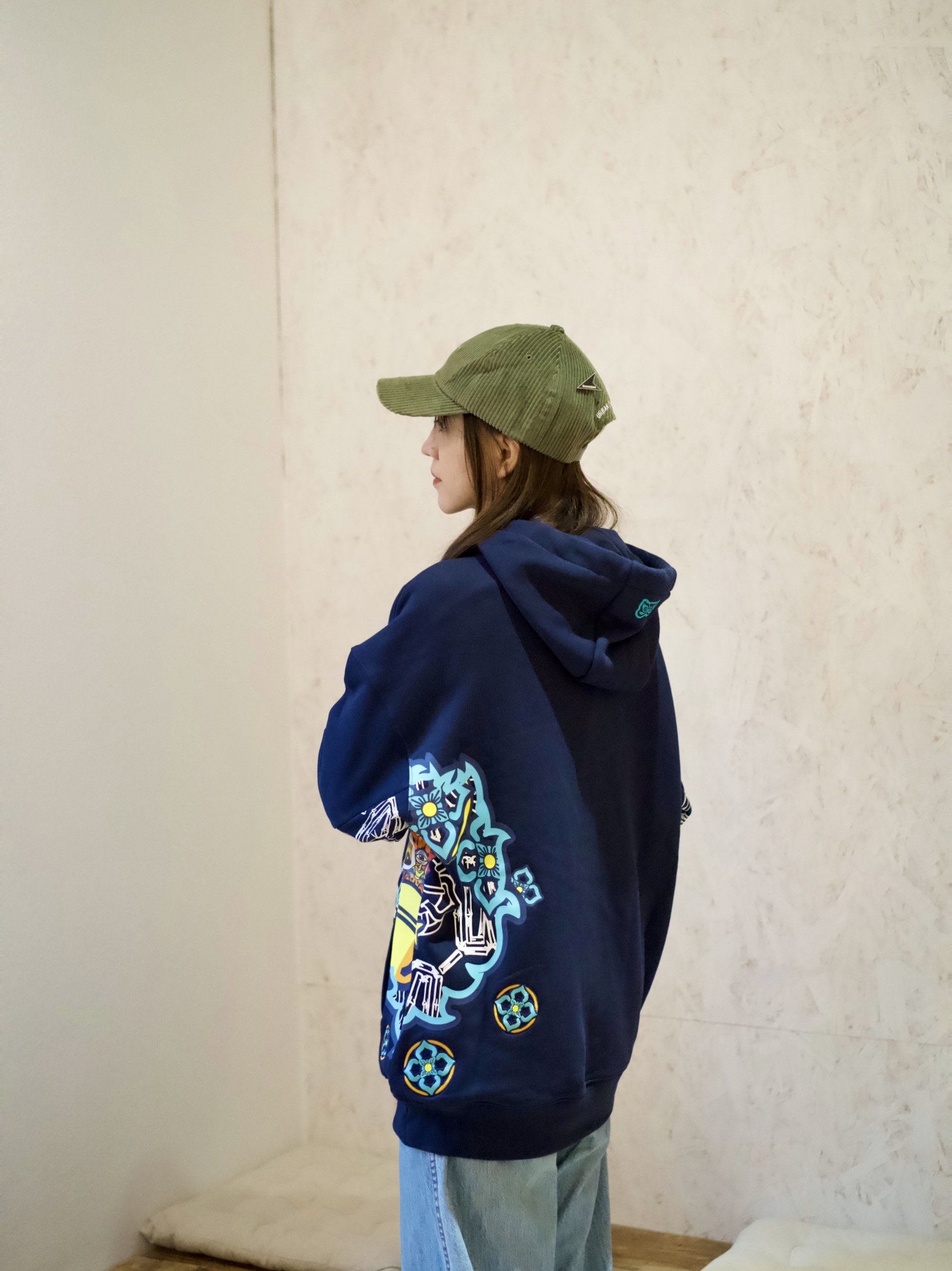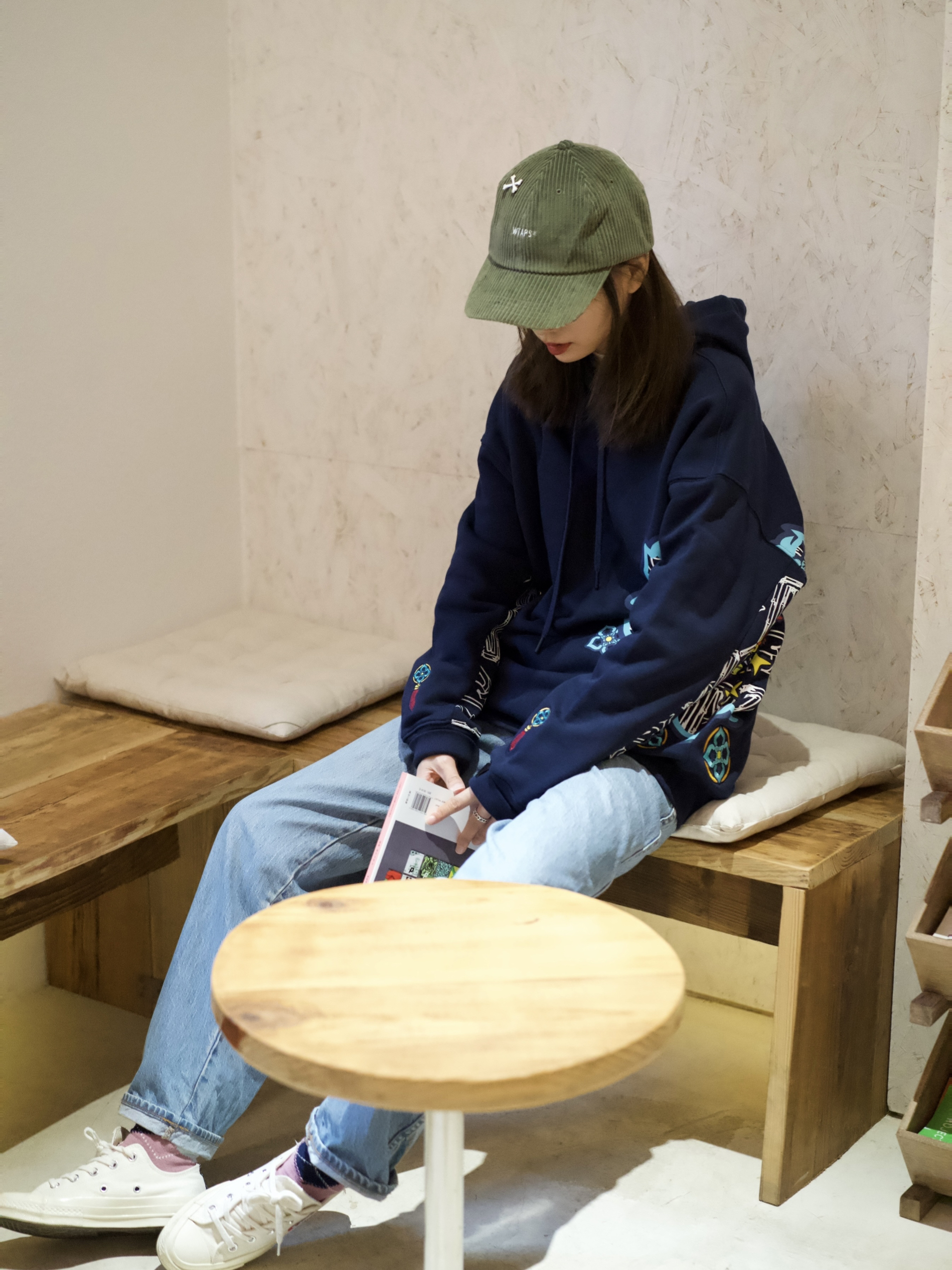 红蓝出cp,搭配也是很不错哦~ 藏蓝色卫衣+彩色印花,牛仔裤来平衡一下。 卫衣:Hea 裤子:优衣库 U系列 鞋子:Converse CDG 帽子:Wtaps