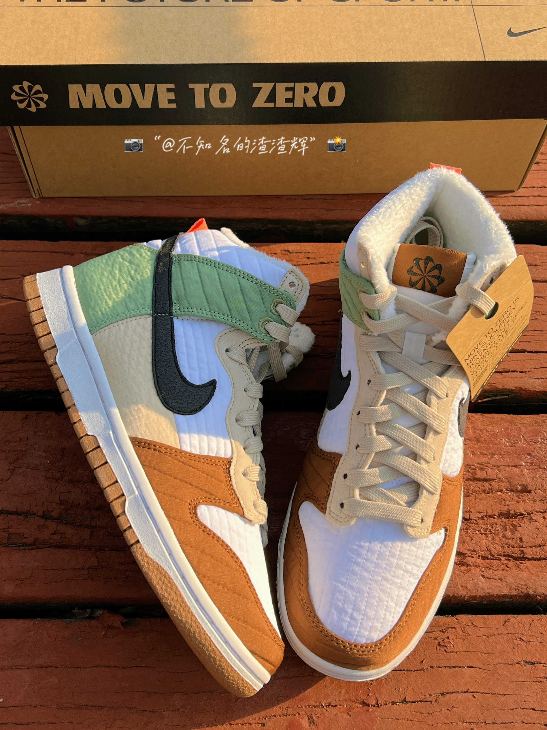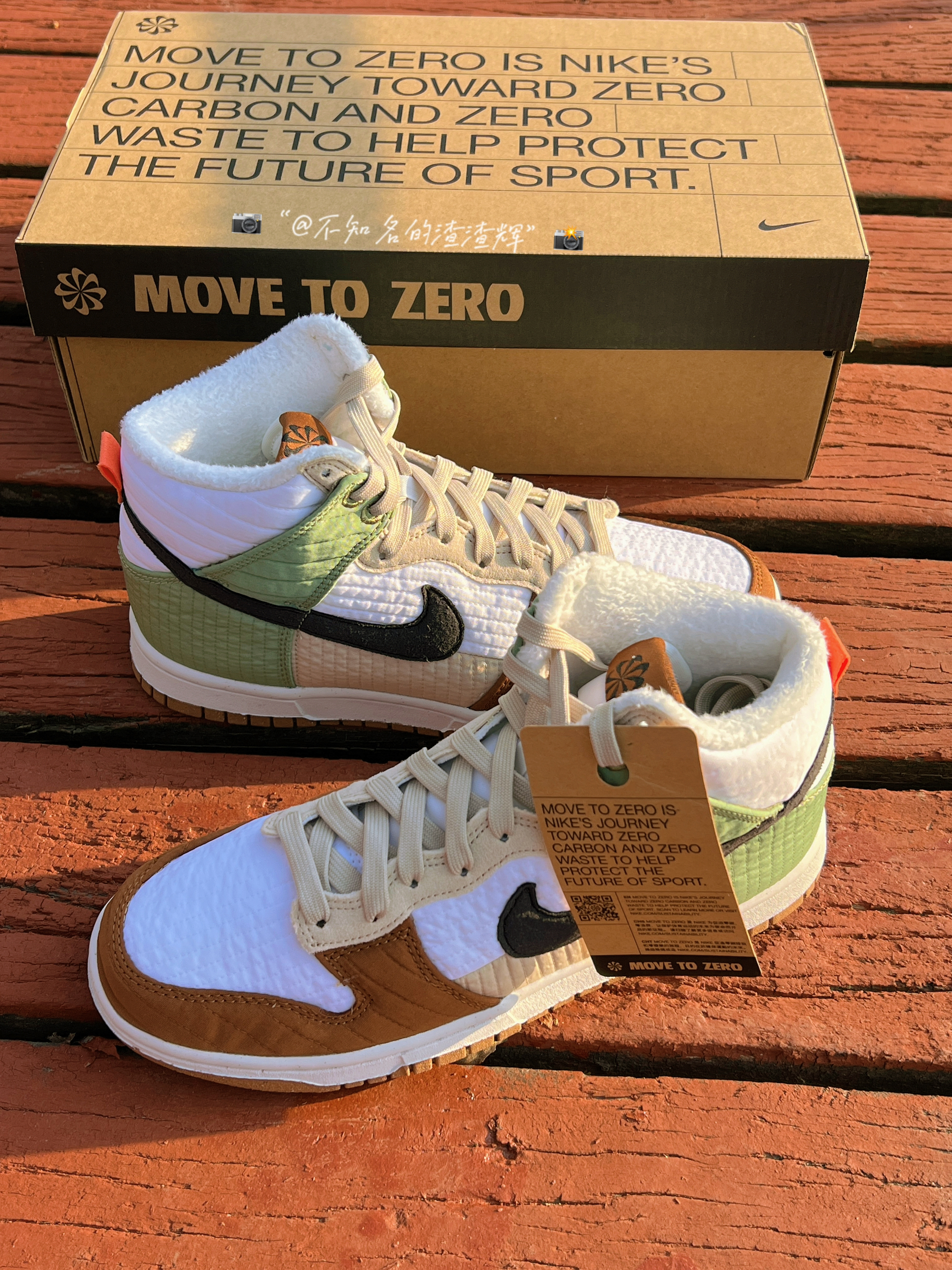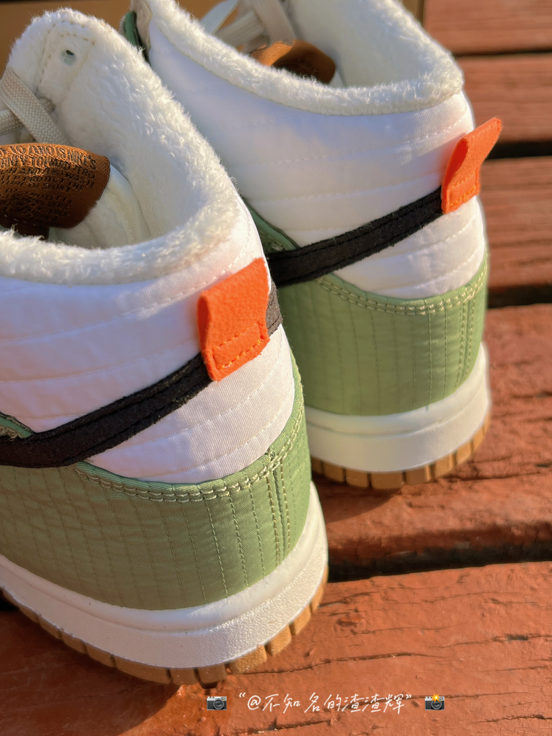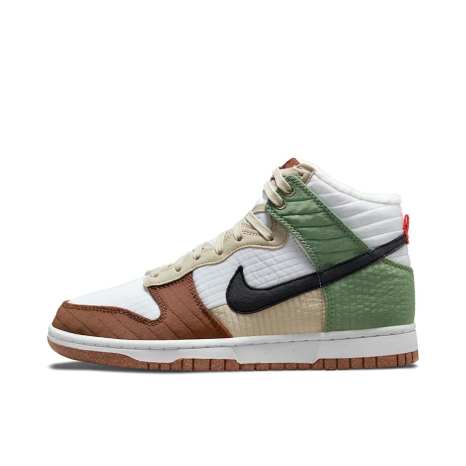 ♻️:Nike Dunk High LX NN 复古休闲板鞋 女款 白棕绿拼接 军大衣 环保回收材料 ♻️:这双鞋子鞋身采用了白色、棕色、米色、绿色拼接而成,Swoosh采用了黑色,配色很适合冬天,鞋子采用了织物材质(类似棉服夹克)而且鞋子内衬有着加绒材质,保暖性很好,外底采用了天然橡胶材质和可回收材质组成,还有着颗粒设计,不愧是环保鞋,鞋子是真的轻 ♻️:颜值的话还不错,冬天穿也挺好搭衣服,...