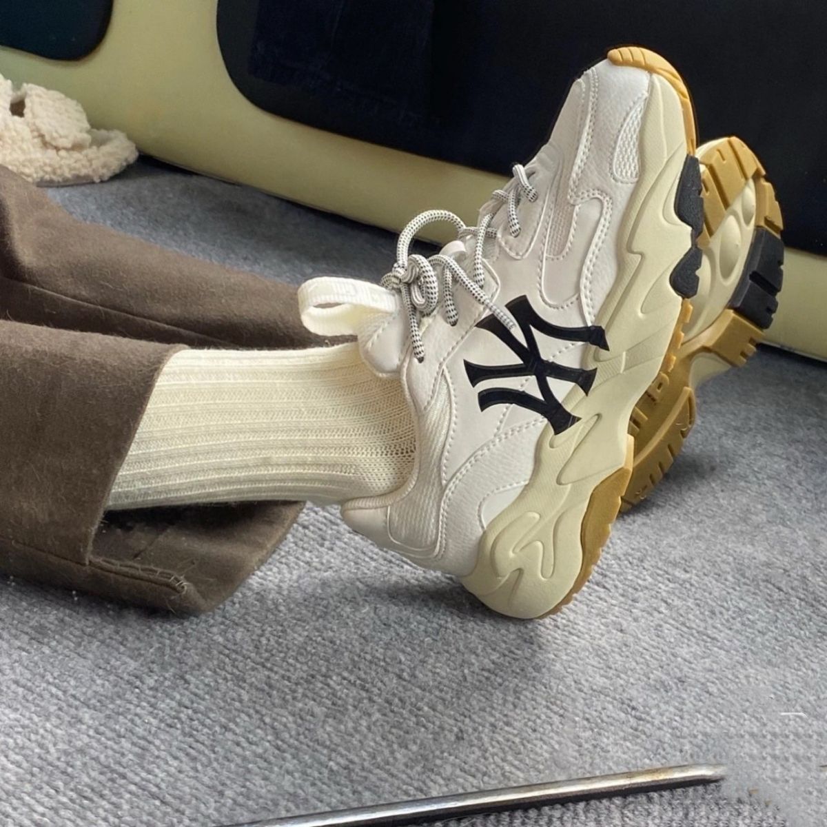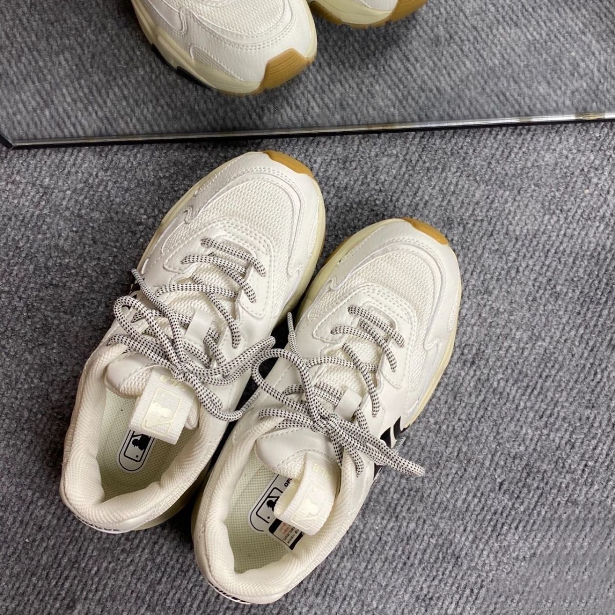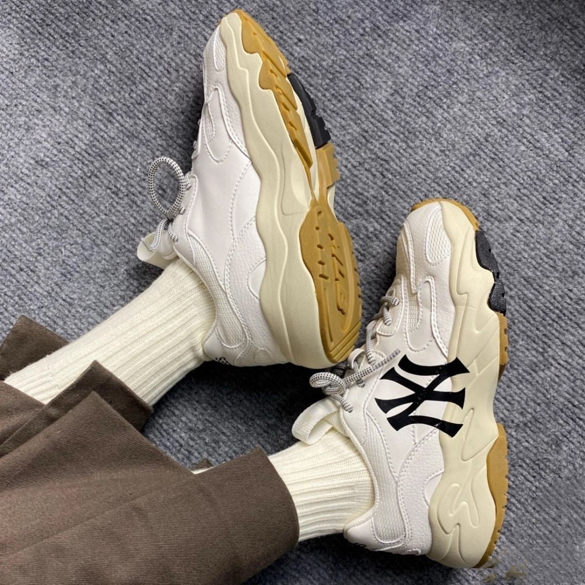MLB这双洋基队上脚比老版v NY 大标 版型和后跟是直接垂直下来的 与常见老爹鞋不同 这款老爹鞋 更加有坡度 有型 无论男生女生 都能和好搭配 一款百搭老爹鞋 网面皮面拼接的 透气性会好 脚感也舒服 高性价比鞋款 还不快快种草!!!!